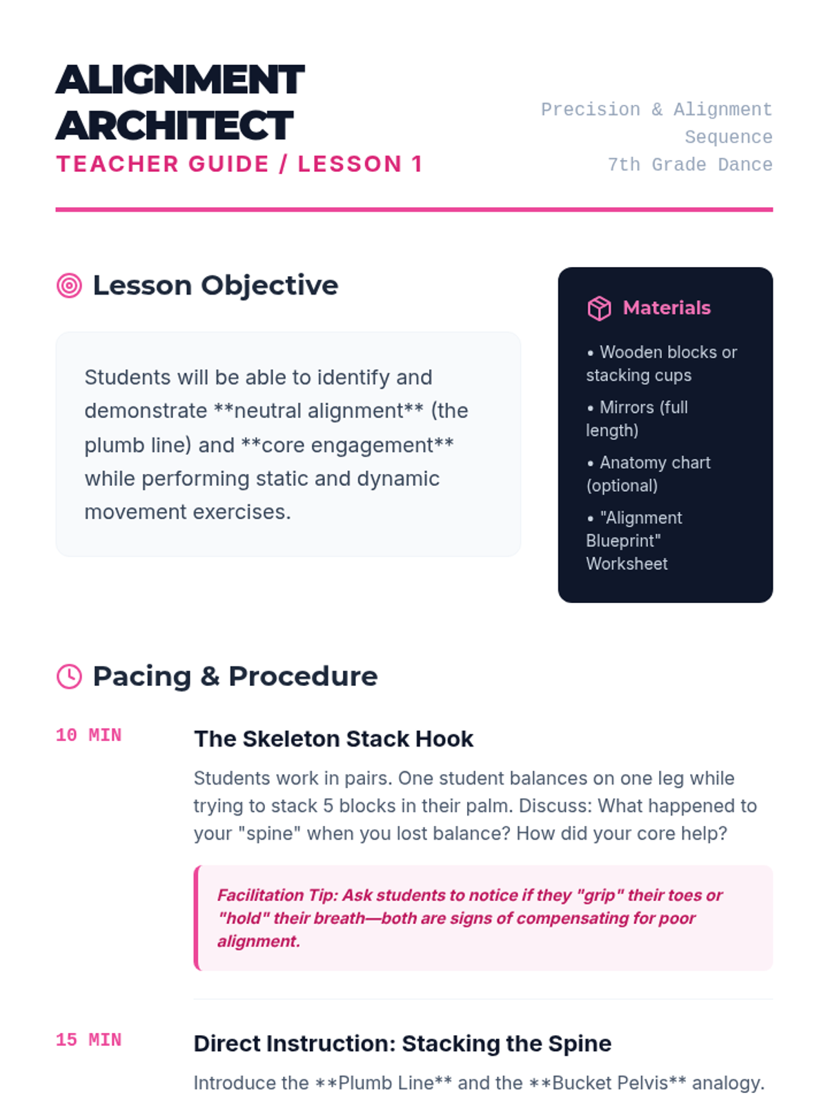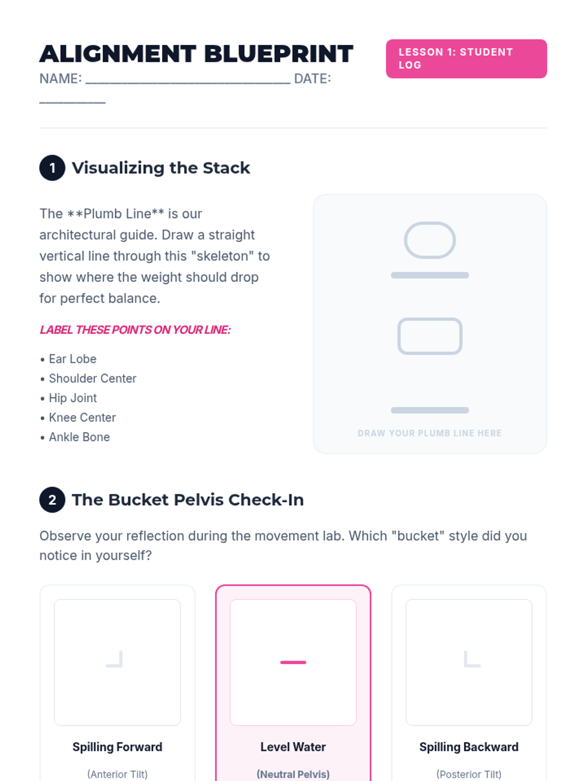 Students establish the foundation of dance technique by exploring neutral spinal alignment and the role of core stability in maintaining balance and safe movement.
