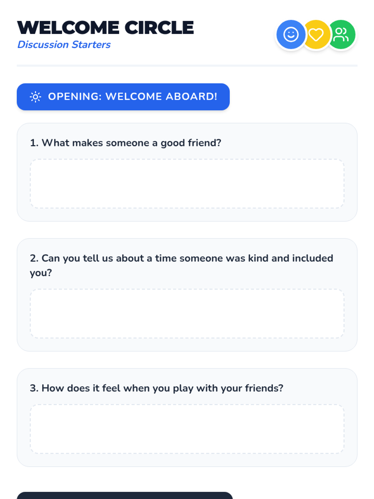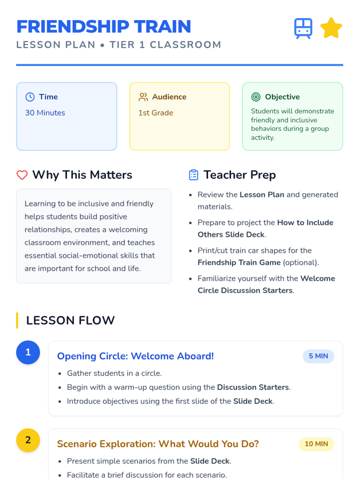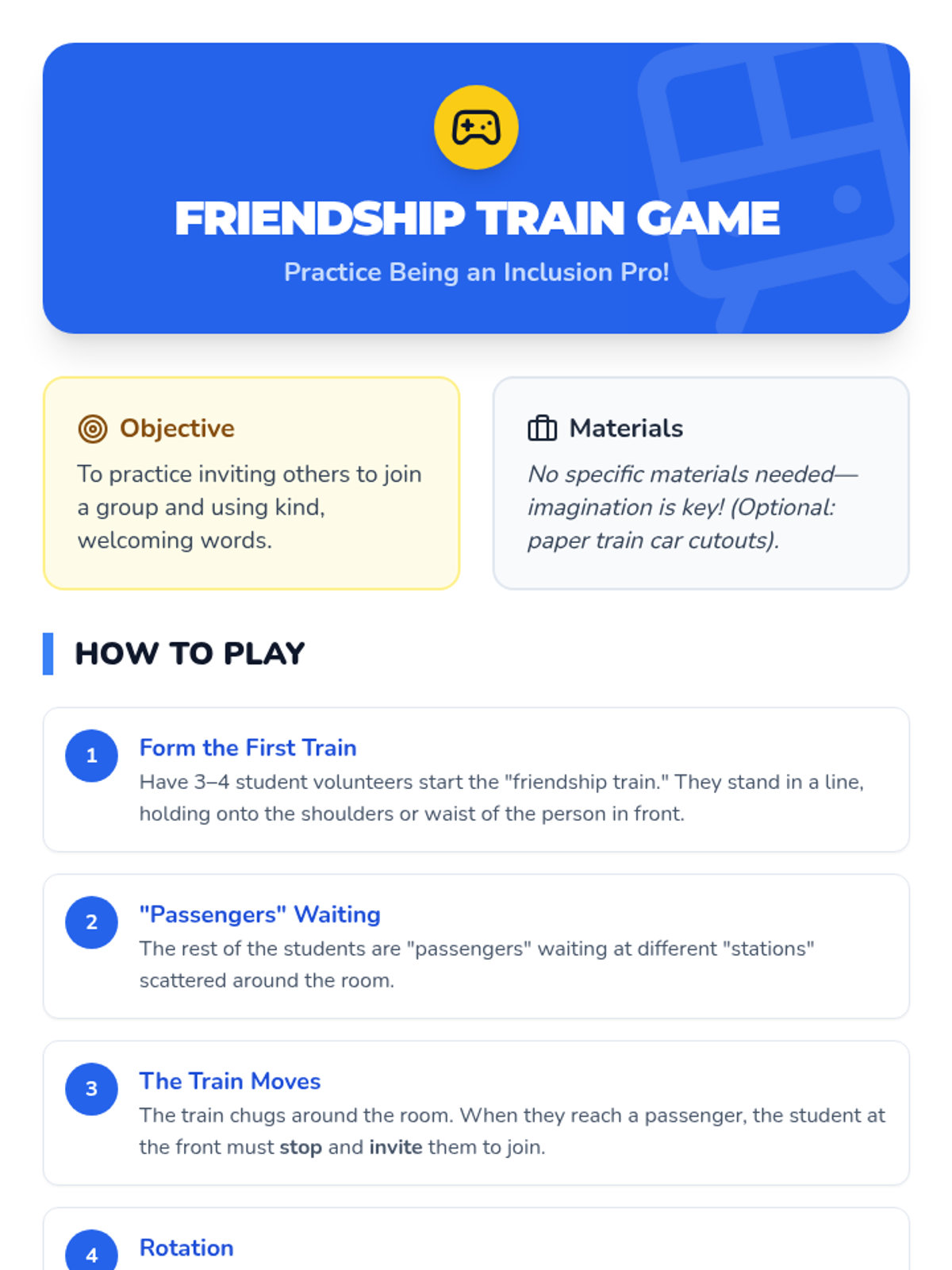 A 30-minute lesson for 1st graders focused on building inclusive behaviors through a train-themed game and discussion. Students learn what it means to include others, practice welcoming words, and reflect on the feelings of belonging.