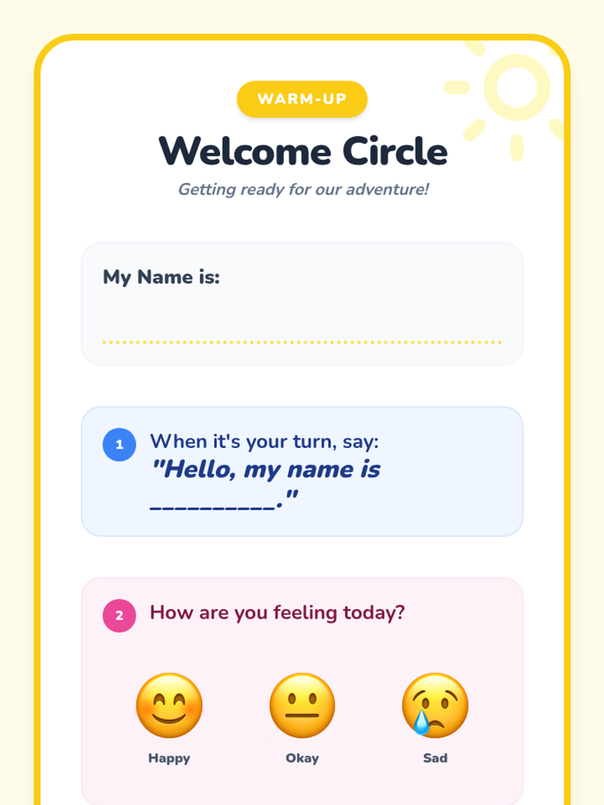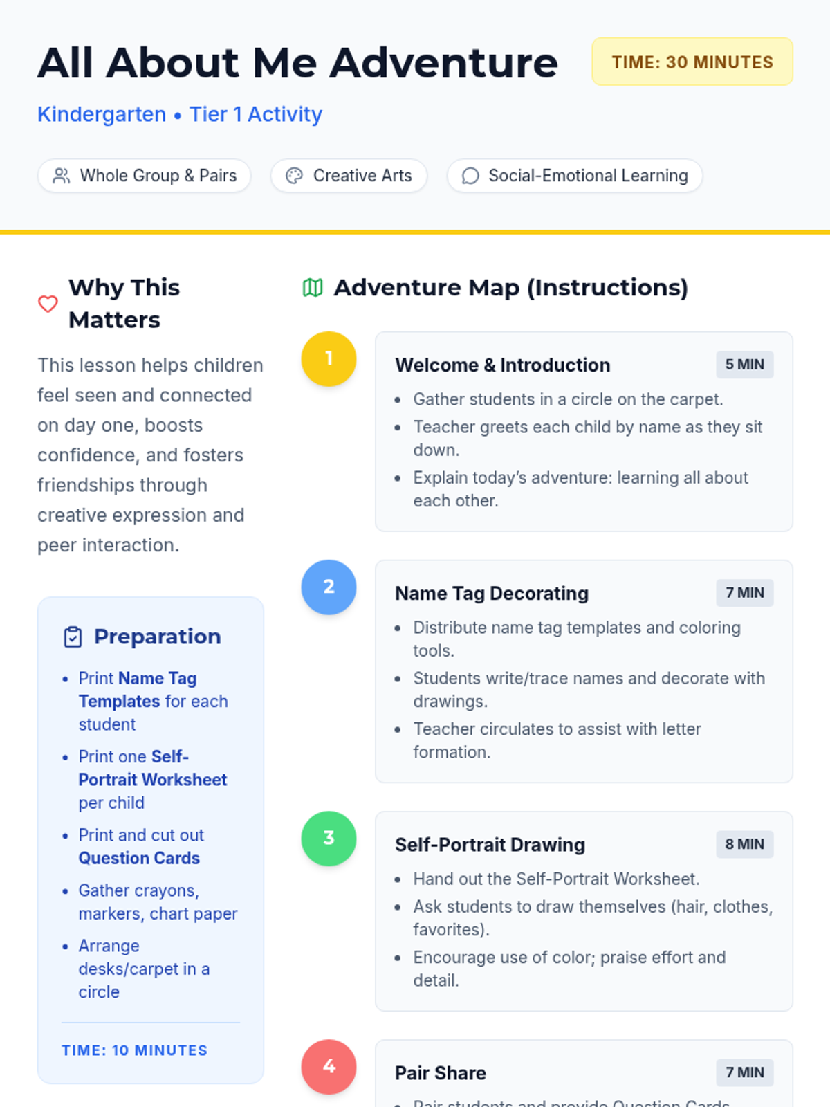 A 30-minute Tier 1 kindergarten activity where students introduce themselves through creative exercises, building community and confidence.