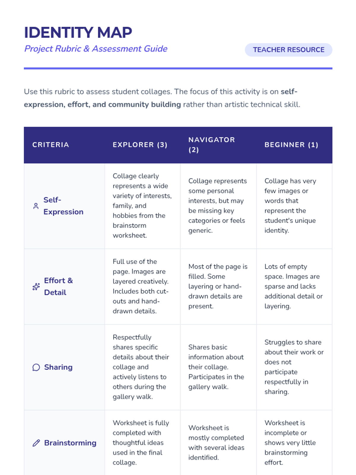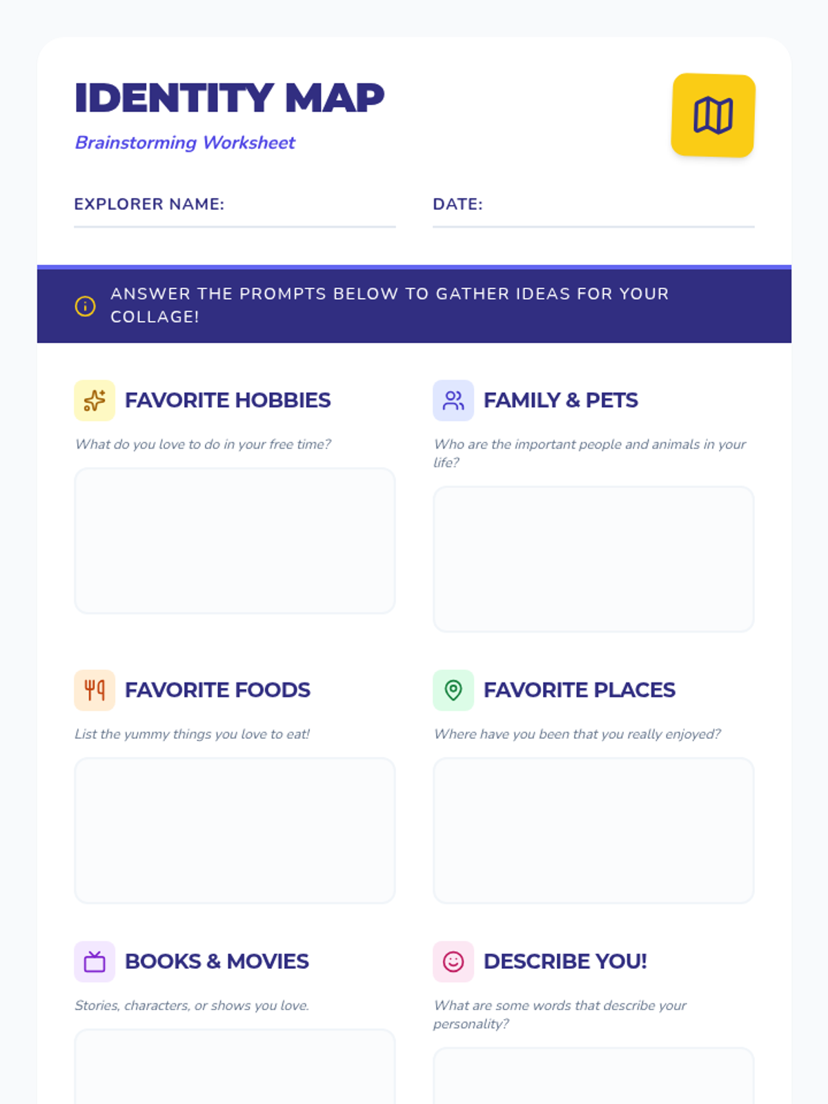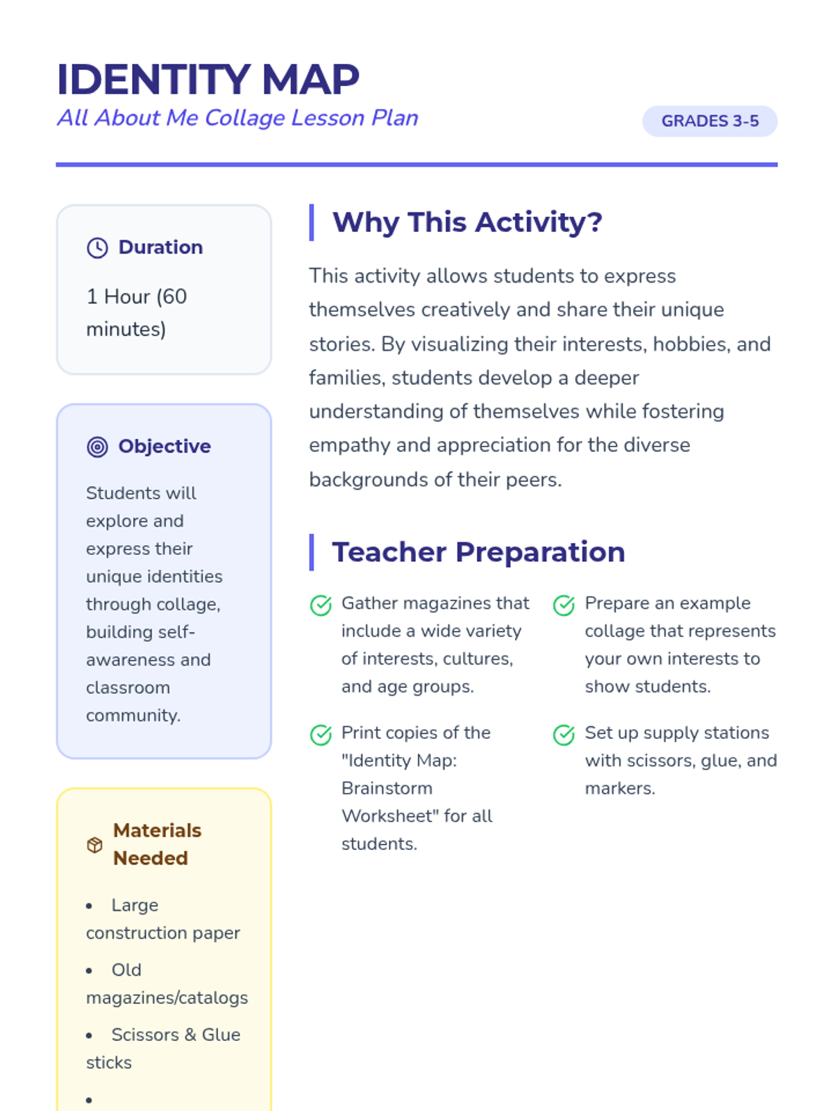 A creative icebreaker lesson where students explore their identity through collage making, fostering community and self-expression in grades 3-5.