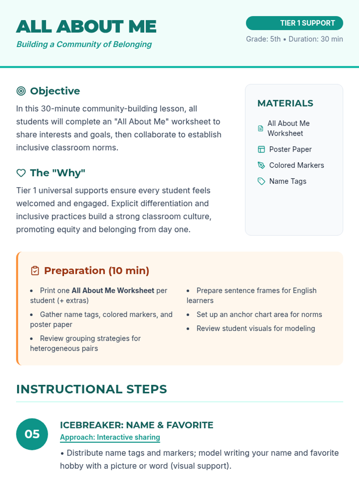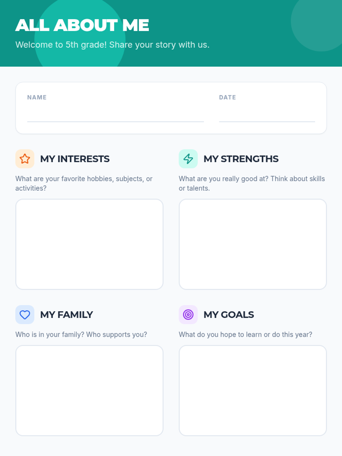 A 30-minute community-building lesson for 5th graders to share their interests, strengths, and goals while establishing classroom norms.