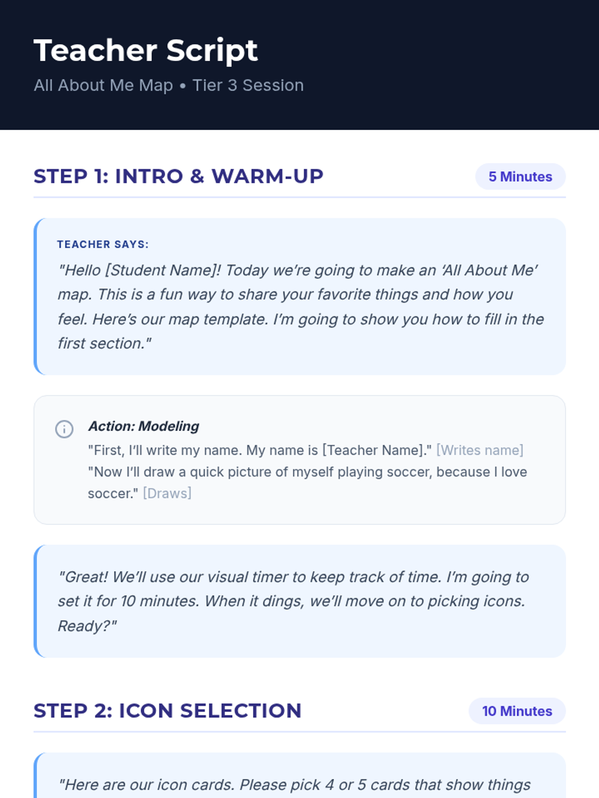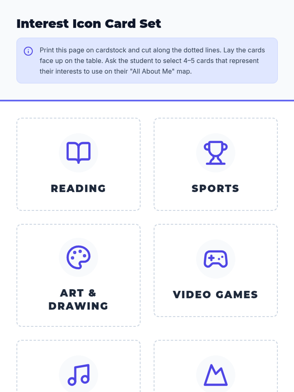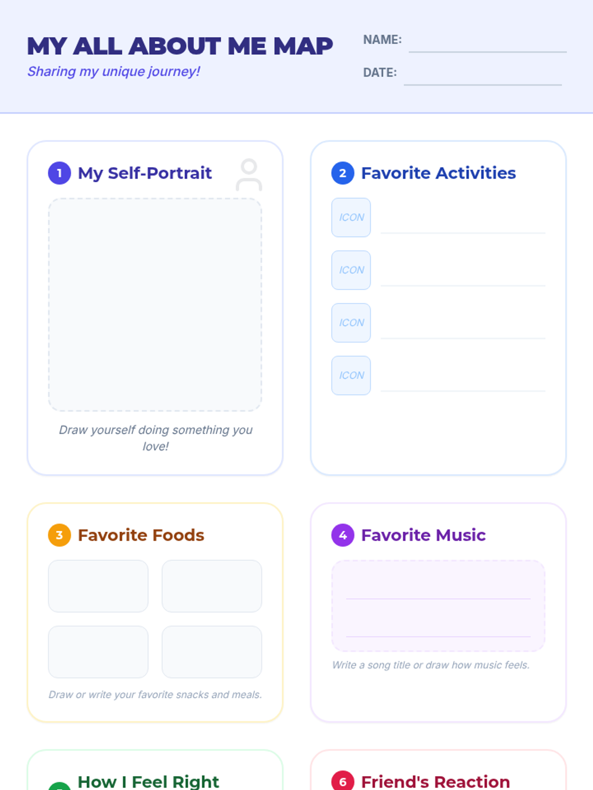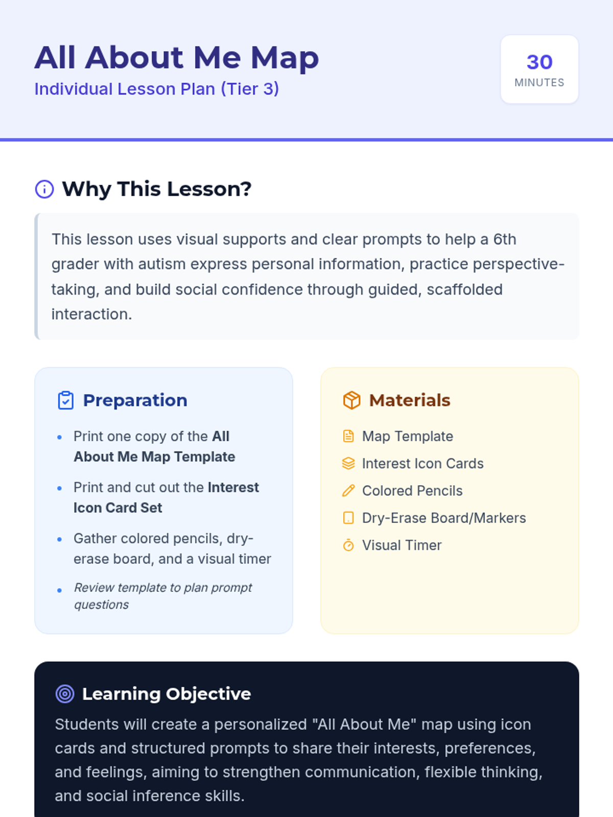 A 30-minute individual session using visual supports and structured prompts to help a 6th grader with autism share personal interests, build communication skills, and strengthen social confidence.