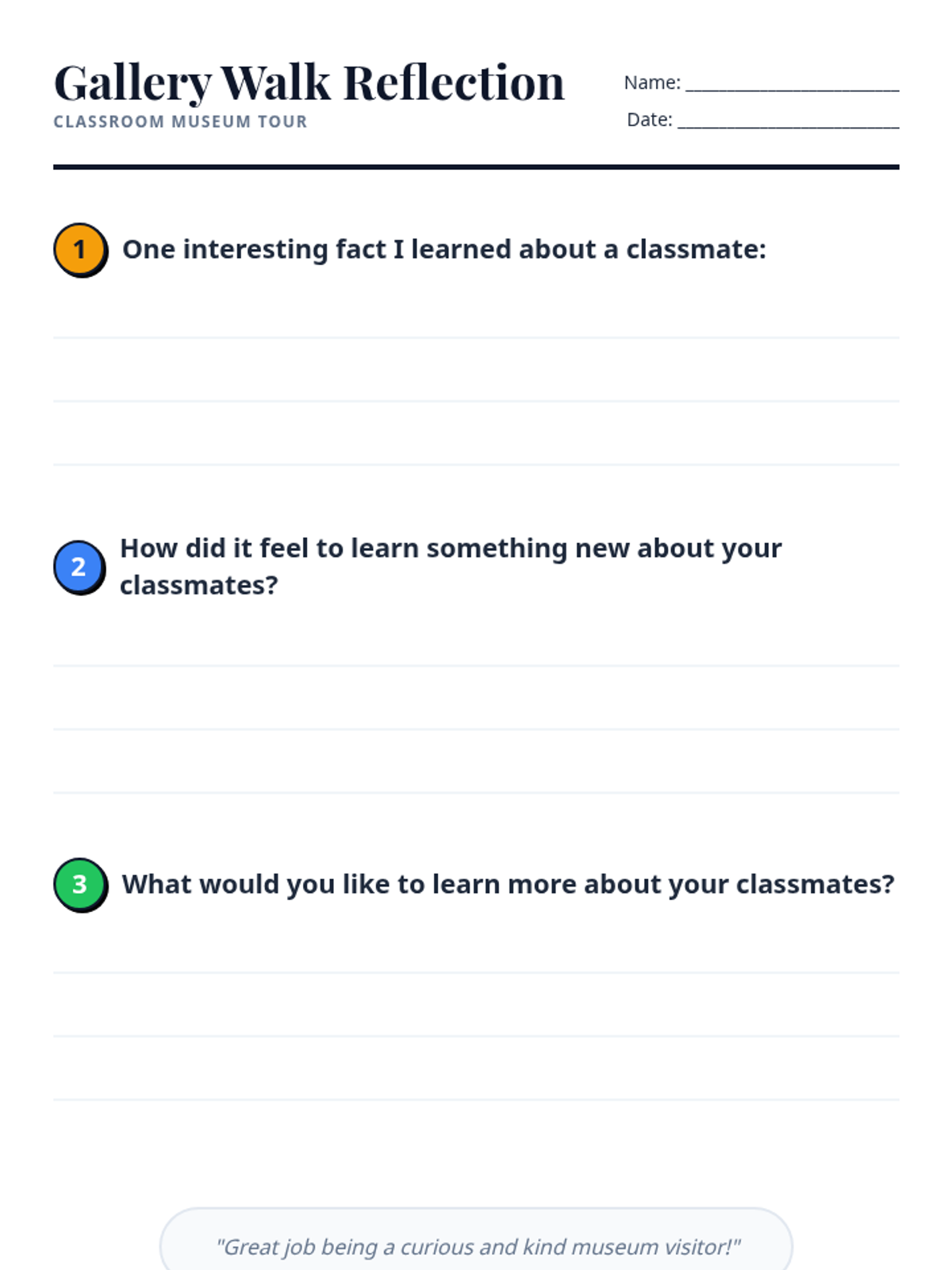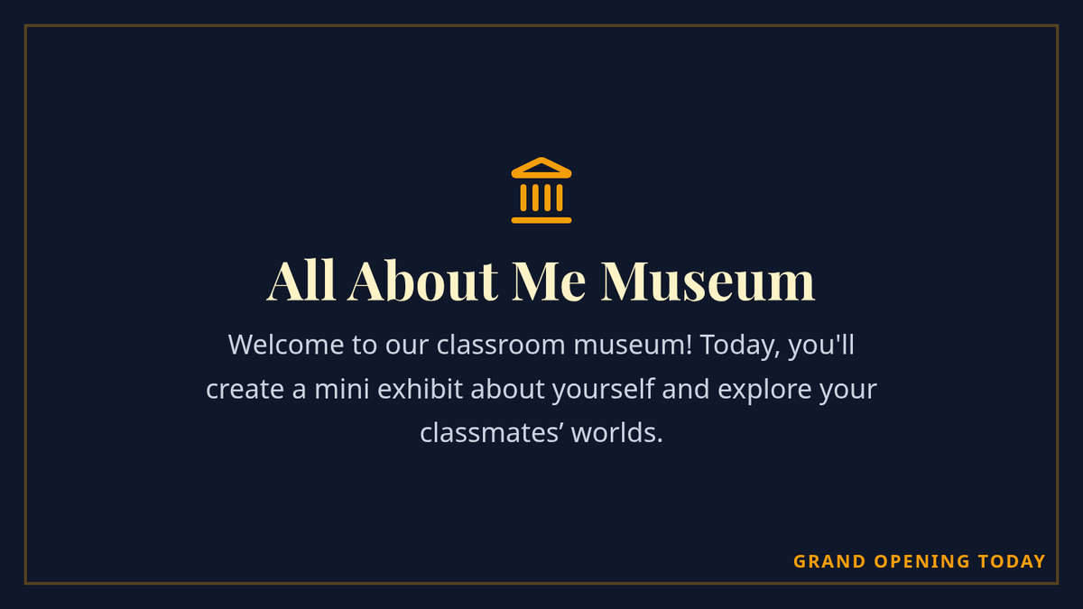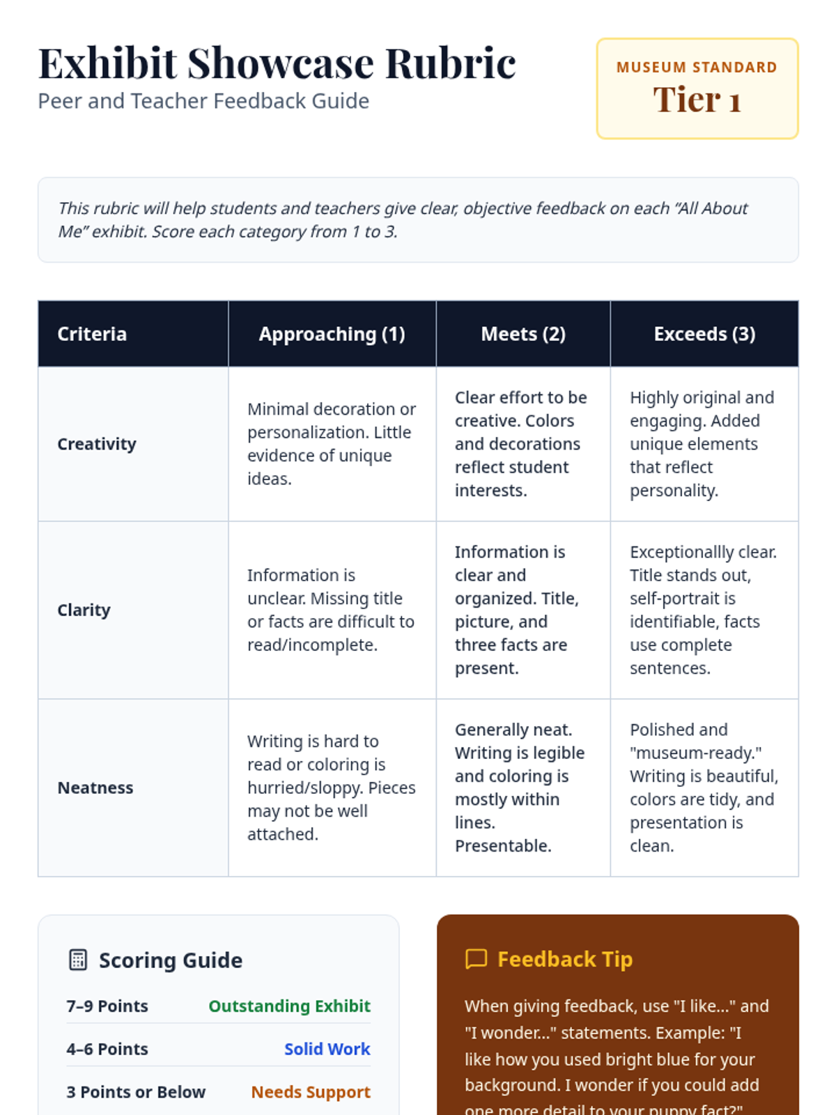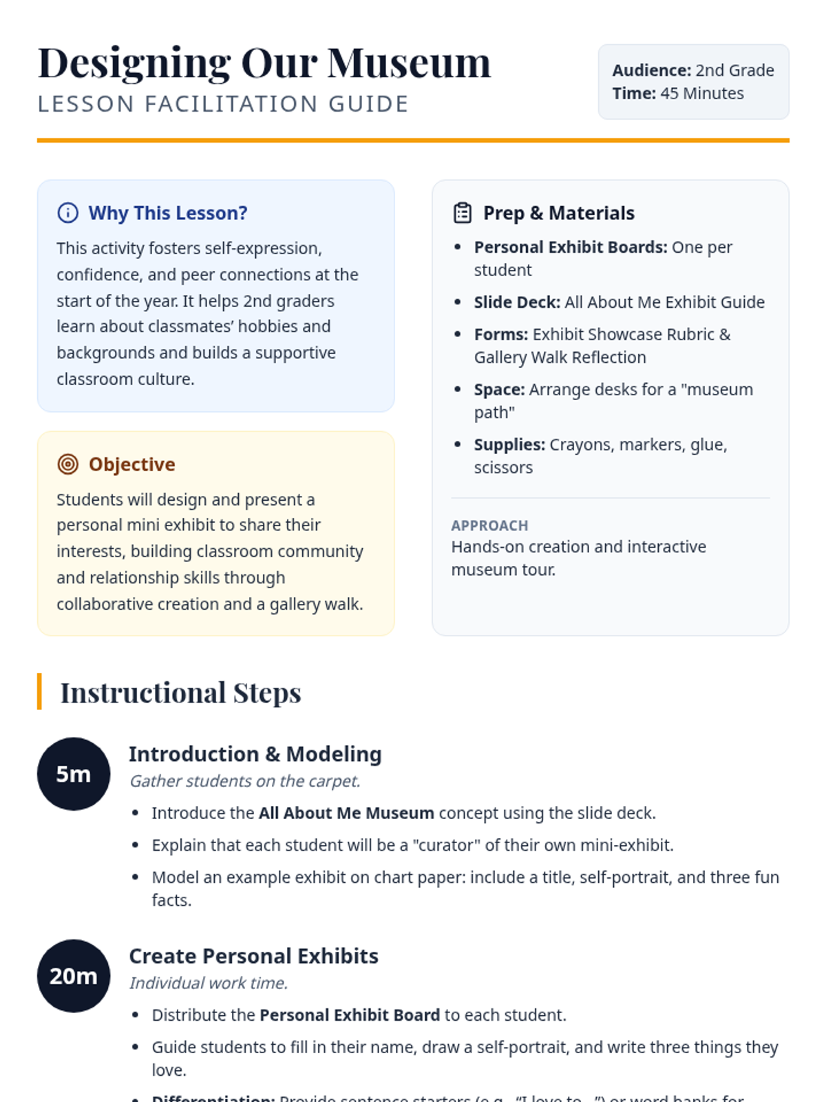 A 45-minute back-to-school activity where 2nd graders create personal mini-exhibits to share their interests and tour a classroom gallery, fostering community and relationship skills.
