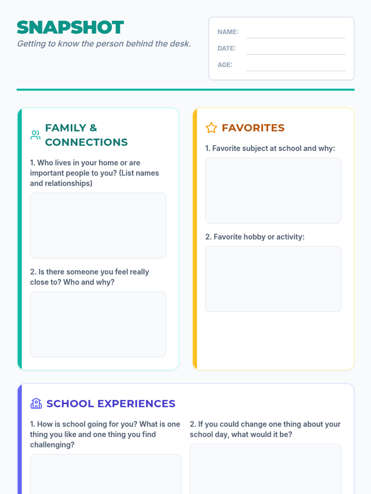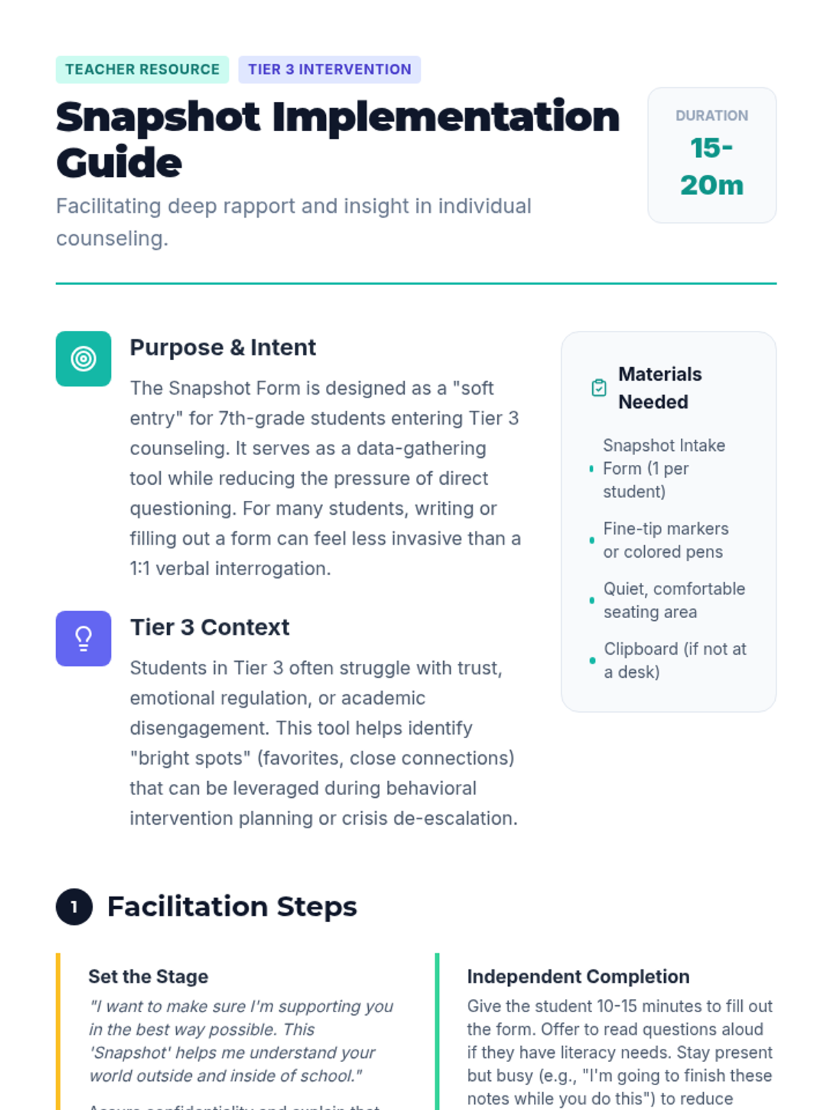 An intake and rapport-building lesson for individual Tier 3 counseling. Students complete a personalized snapshot form to share insights on their family, school experience, emotional regulation strategies, and personal goals.