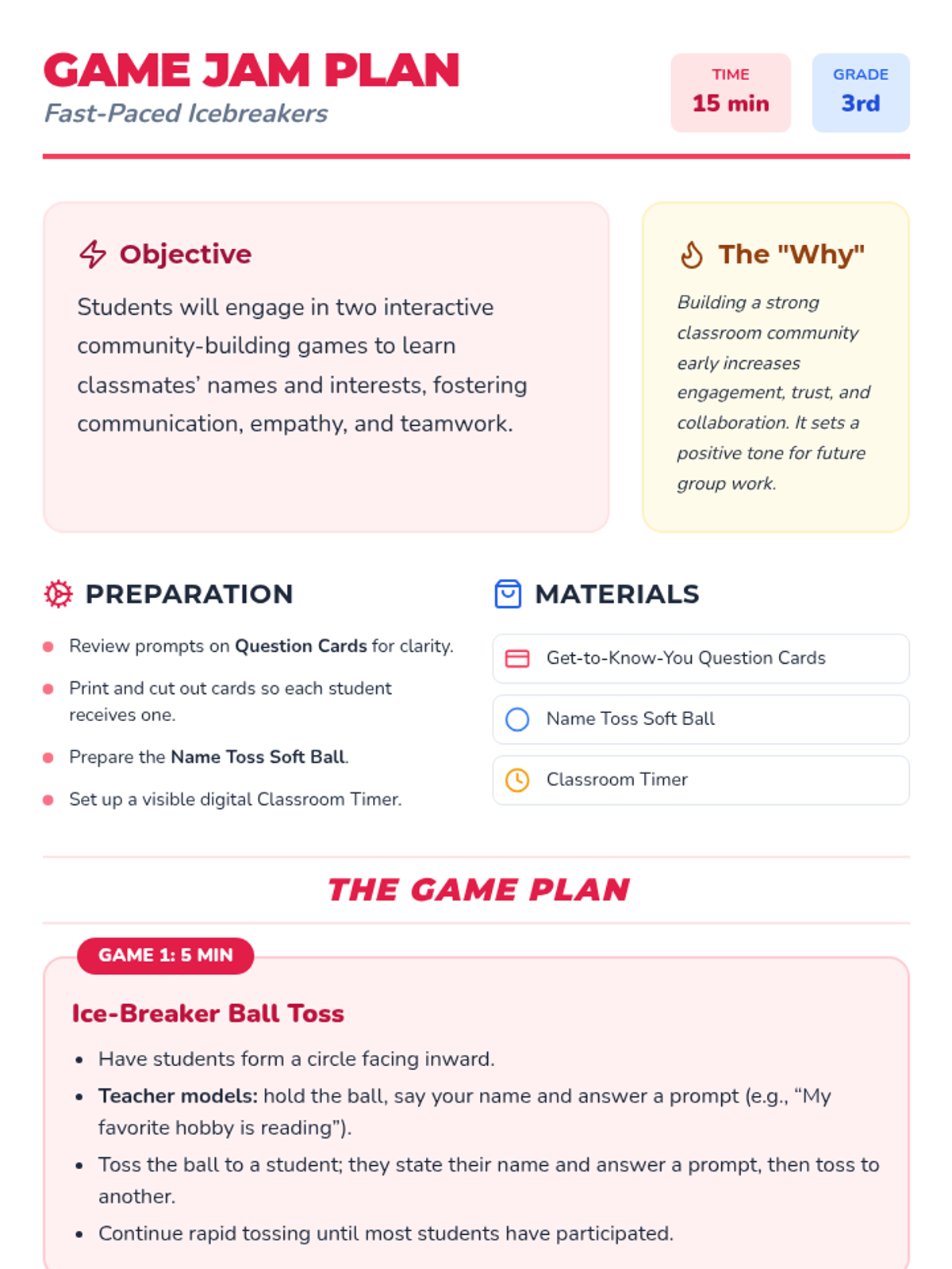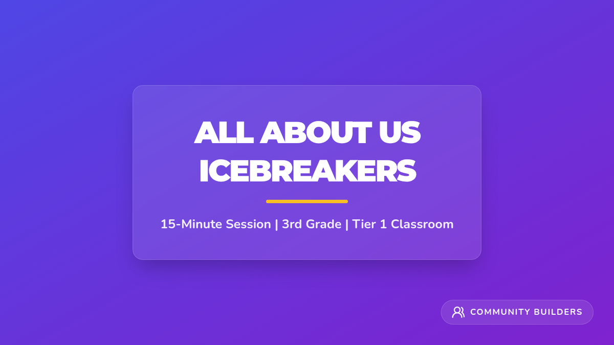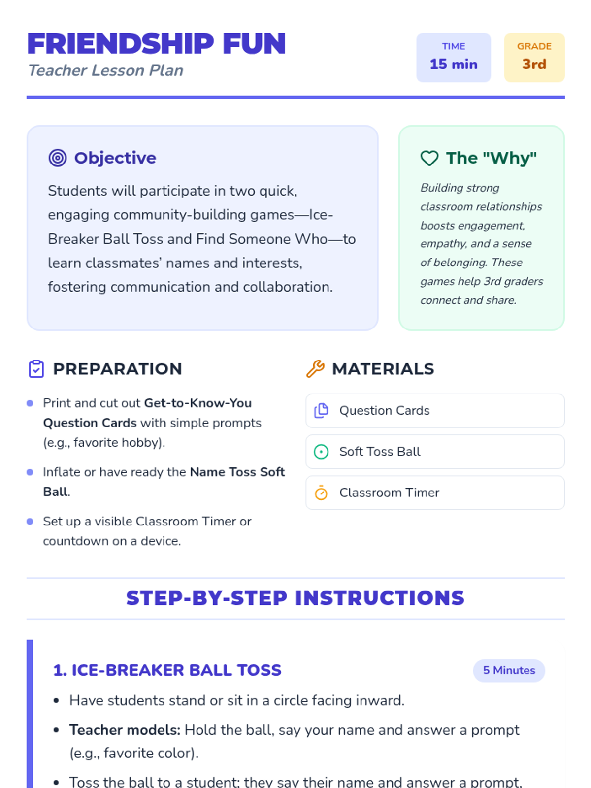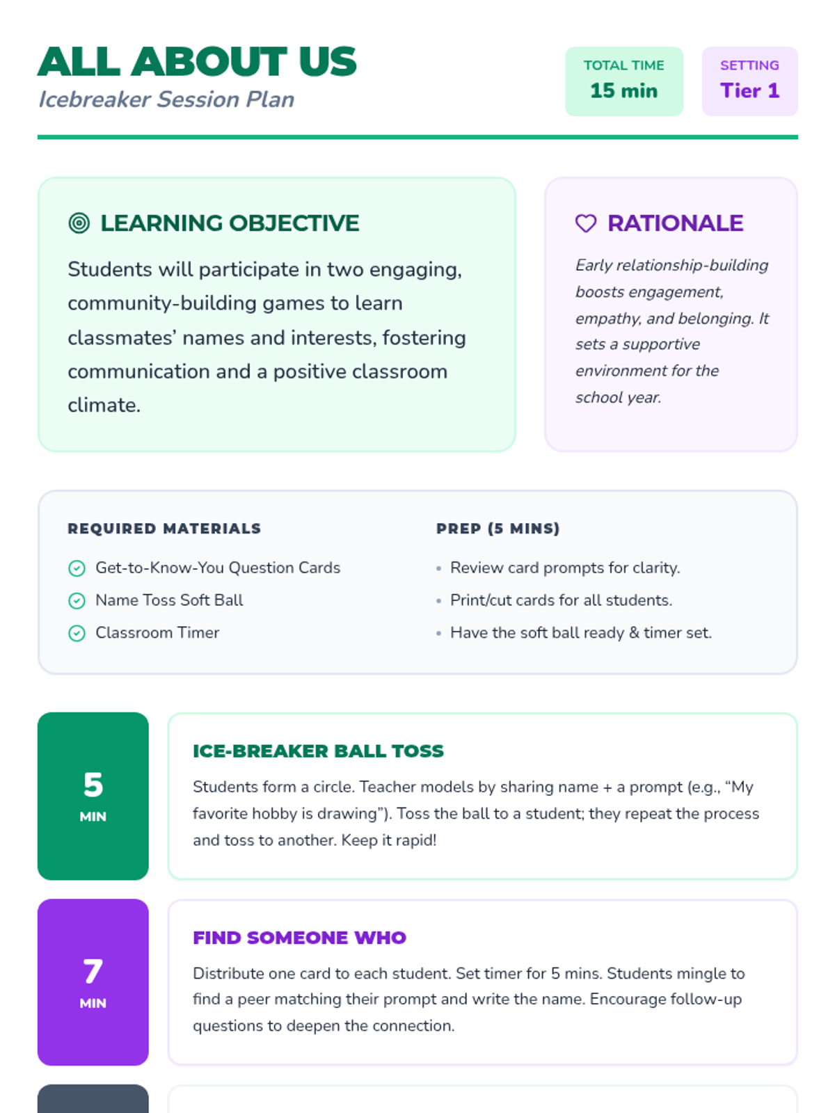 A quick and engaging 15-minute session for 3rd graders to build community through interactive games like ball tosses and mingling activities. Students practice communication skills and learn more about their classmates in a fun, low-stakes environment.