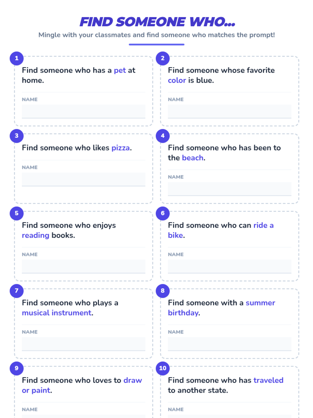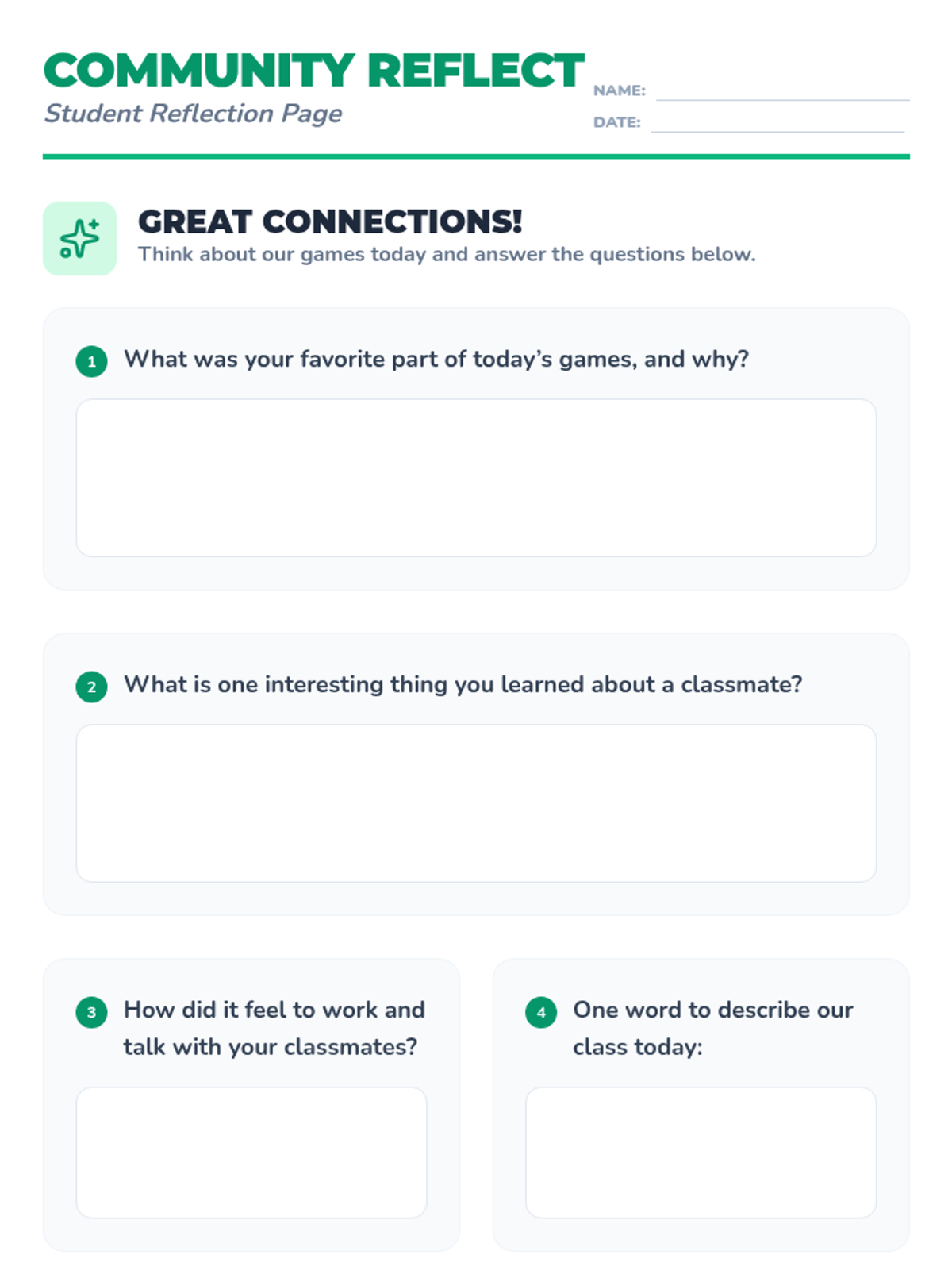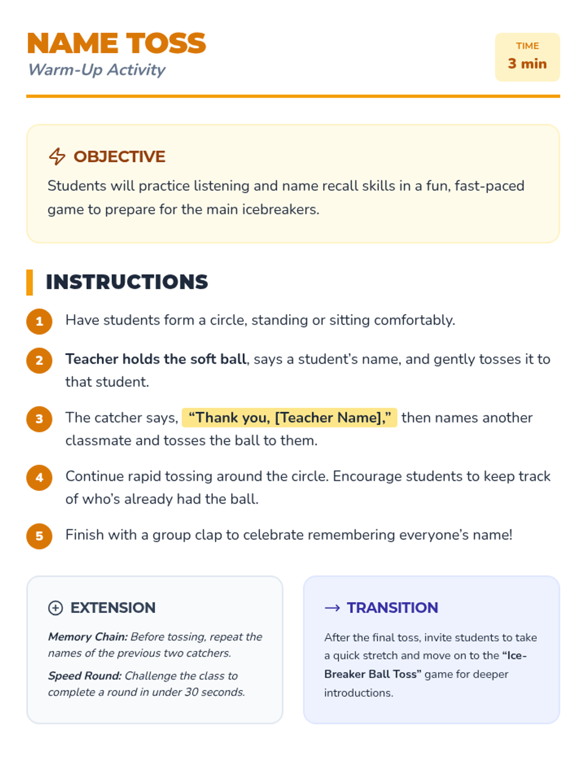 A quick and engaging 15-minute session for 3rd graders to build community through interactive games like ball tosses and mingling activities. Students practice communication skills and learn more about their classmates in a fun, low-stakes environment.