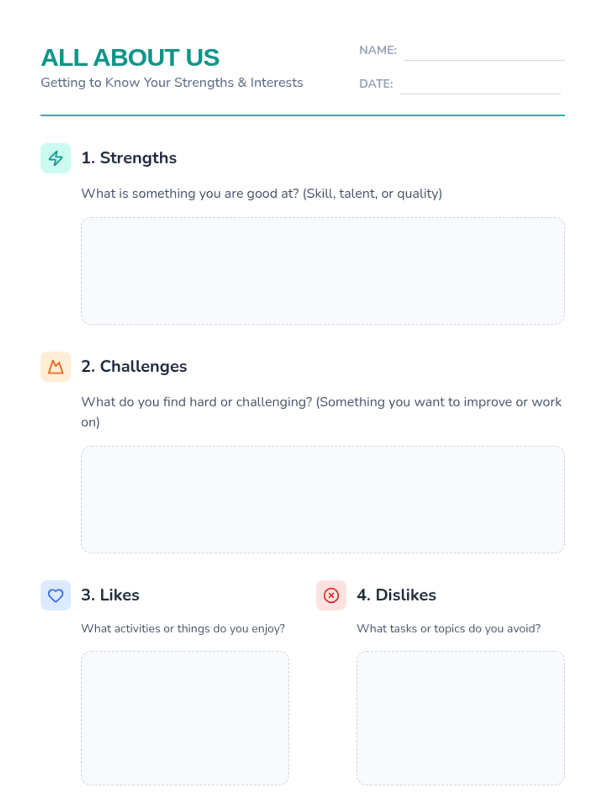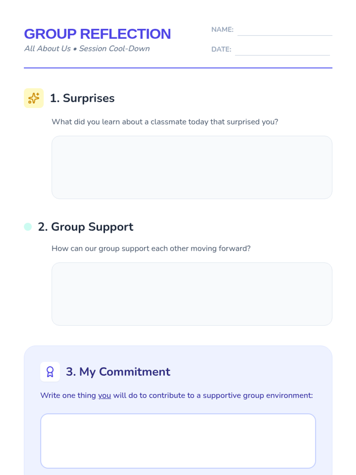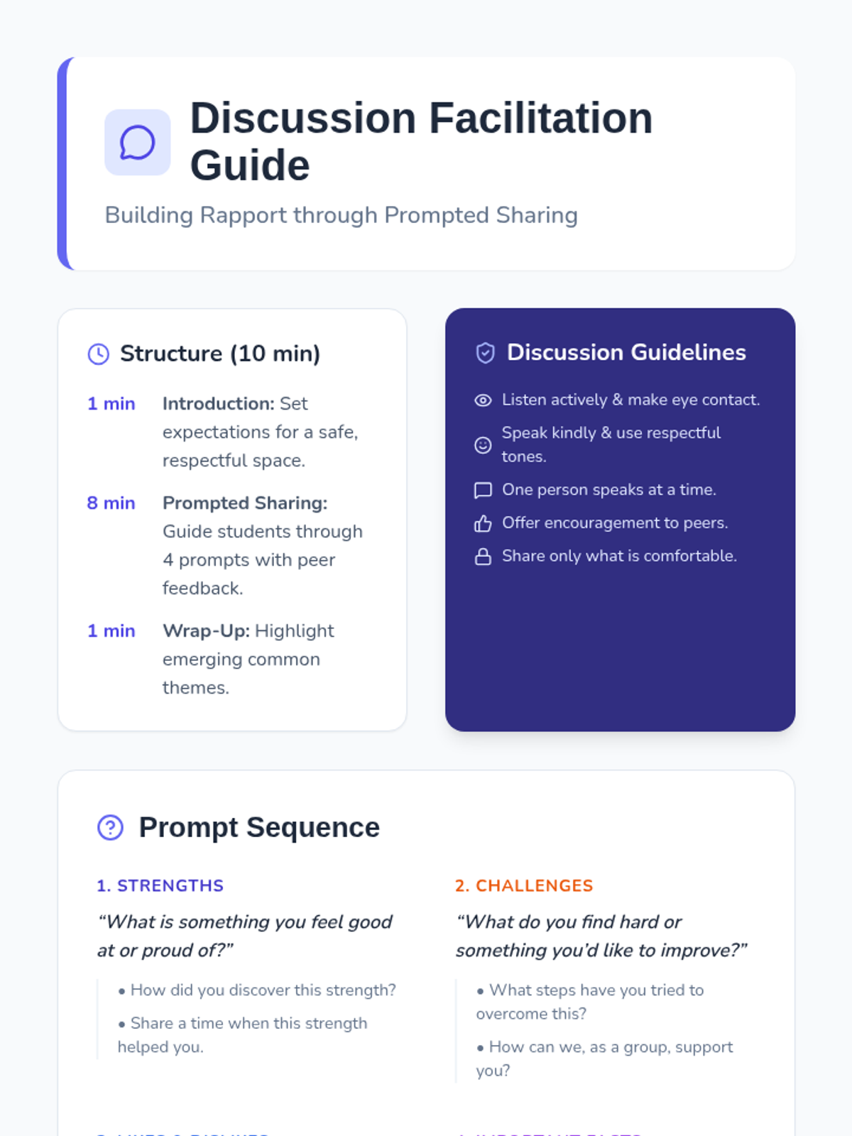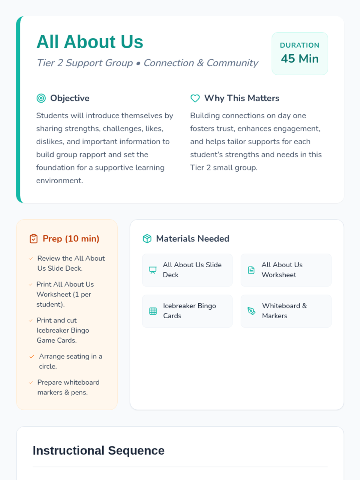 A 45-minute Tier 2 small group lesson designed to help middle school students build rapport and community by sharing their strengths, challenges, and personal interests.