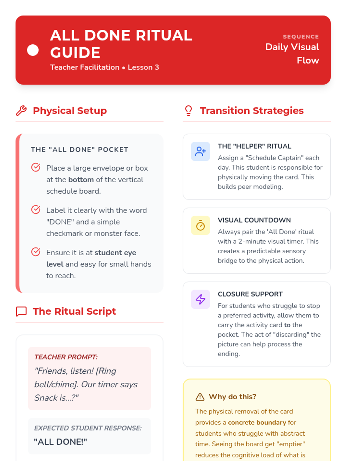 This lesson establishes the ritual of removing a schedule card once an activity is finished and placing it in an 'all done' pocket or turning it over. This physical action provides closure and visually declutters the remaining day.