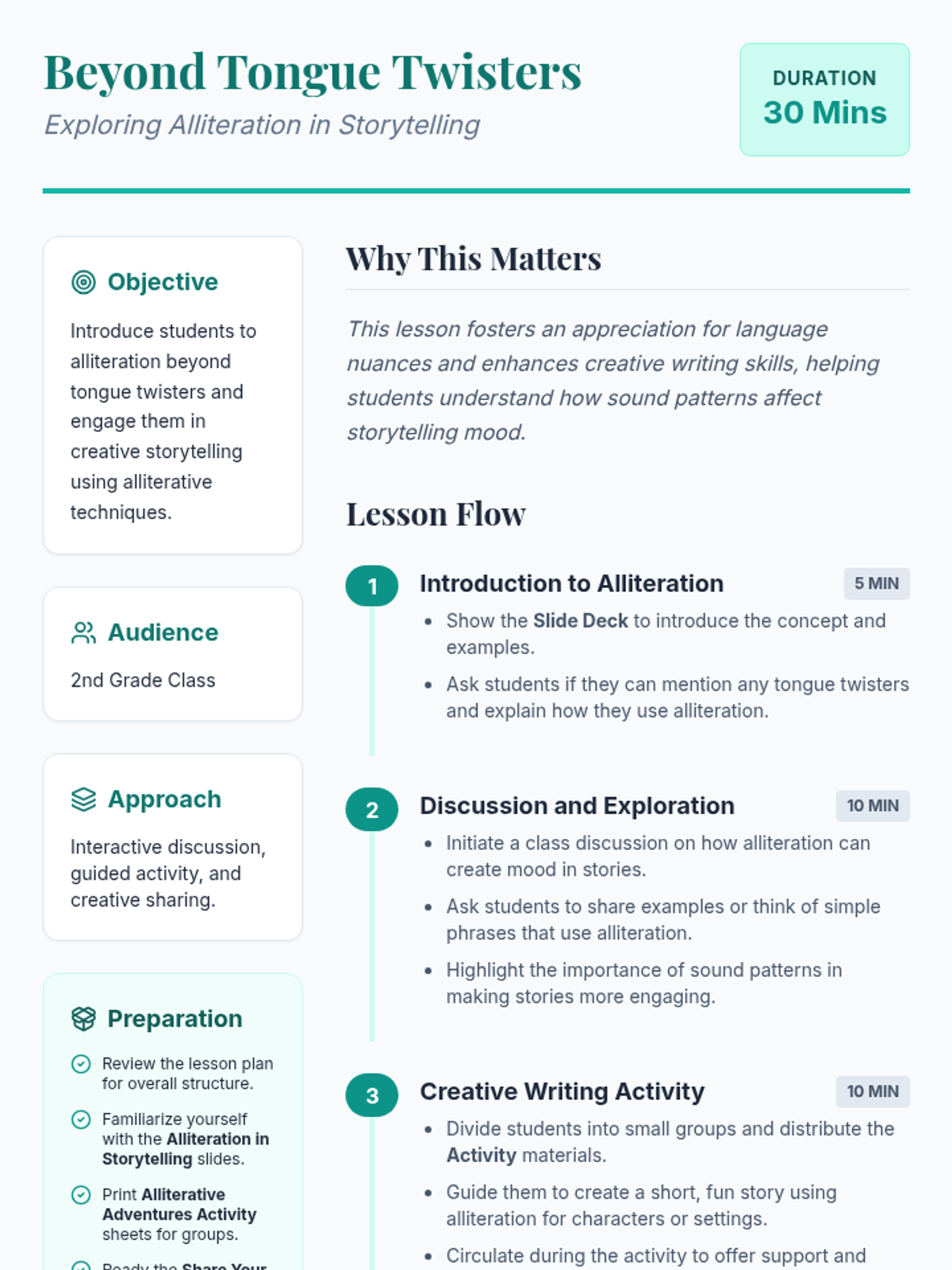 A fun, 30-minute lesson for 2nd graders exploring how alliteration goes beyond tongue twisters to create mood and excitement in storytelling.