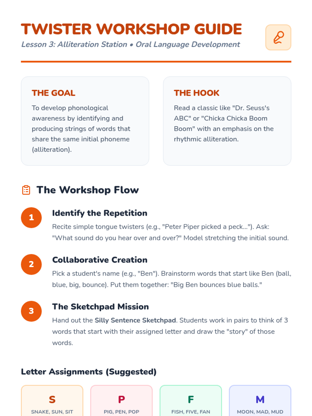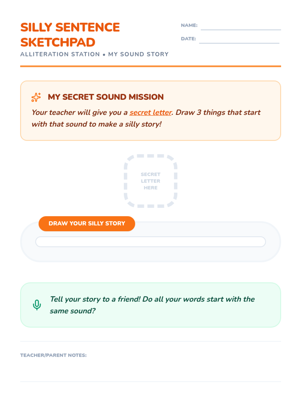 Students explore alliteration by creating silly tongue twisters, focusing on the repetition of initial sounds in spoken language.