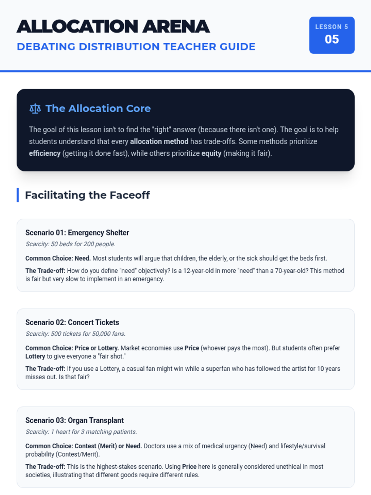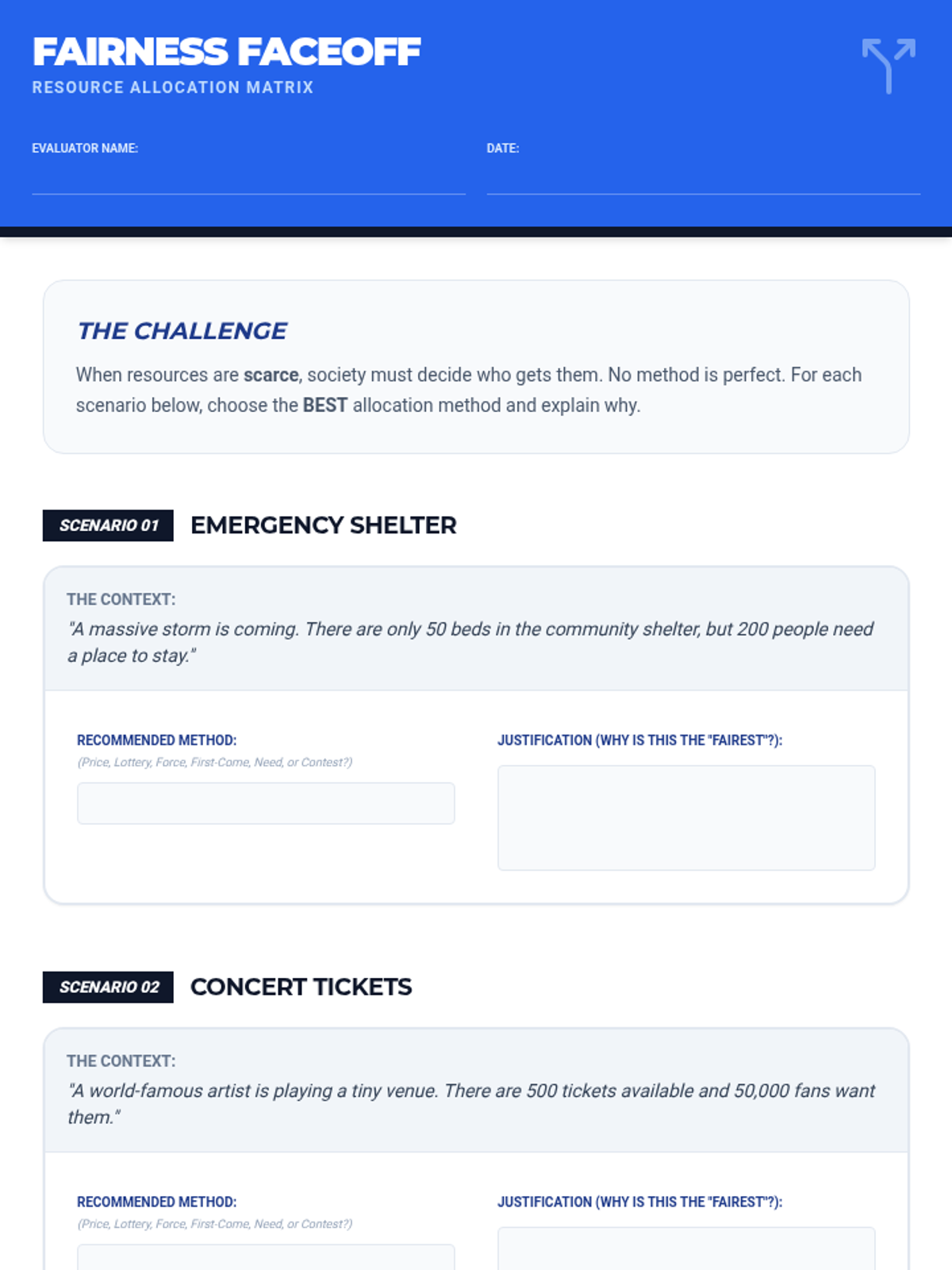 Students examine different methods of distributing scarce goods: price, lottery, force, sharing, and contest. They evaluate the fairness and efficiency of each method in different contexts and debate which method is best for specific scenarios.