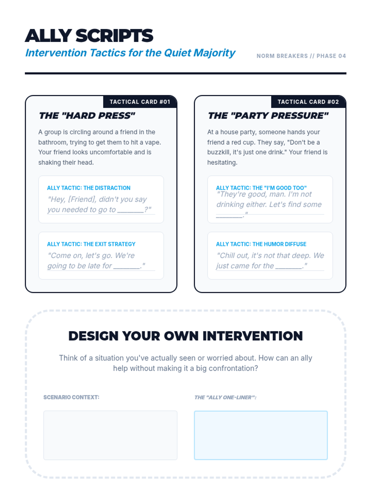 Focusing on community advocacy, students develop 'ally scripts' to support others facing peer pressure. They move from individual refusal to collective boundary-setting.