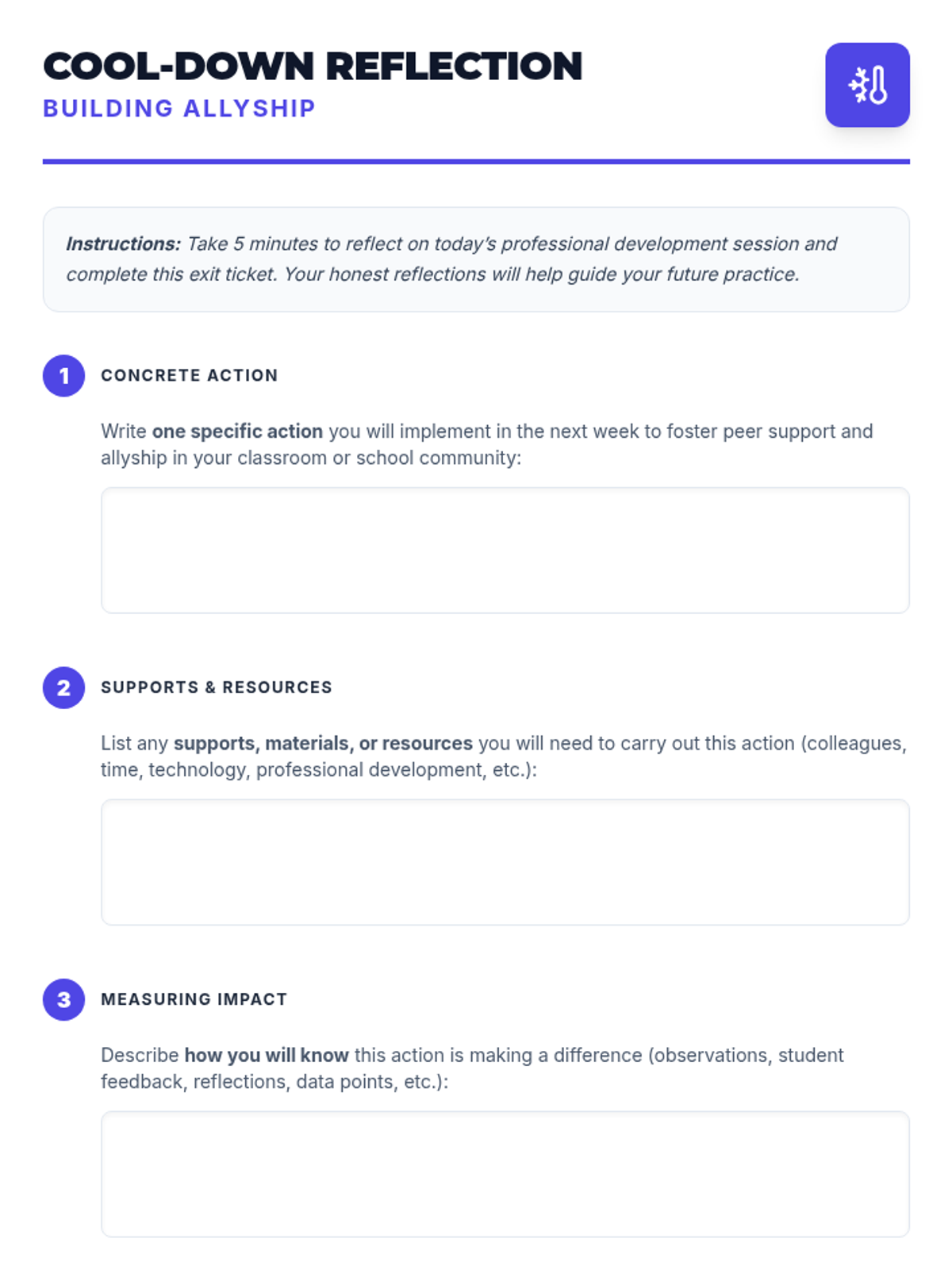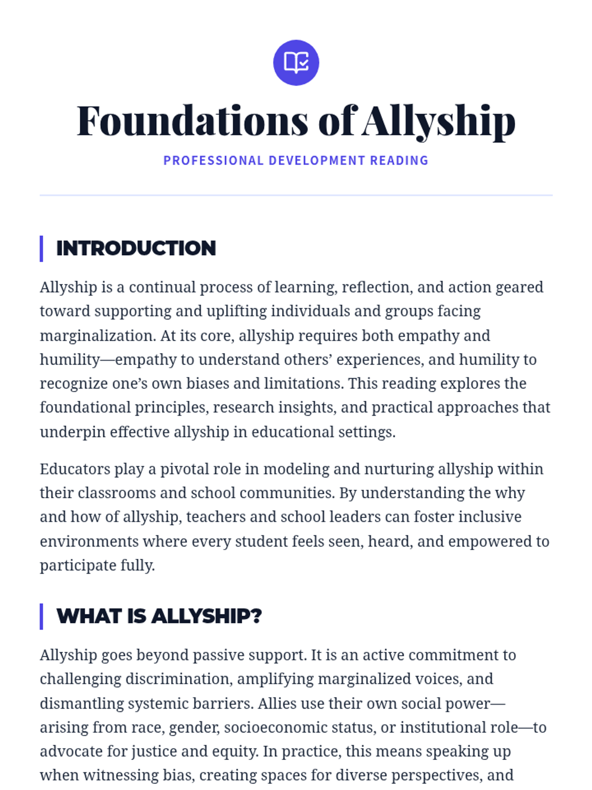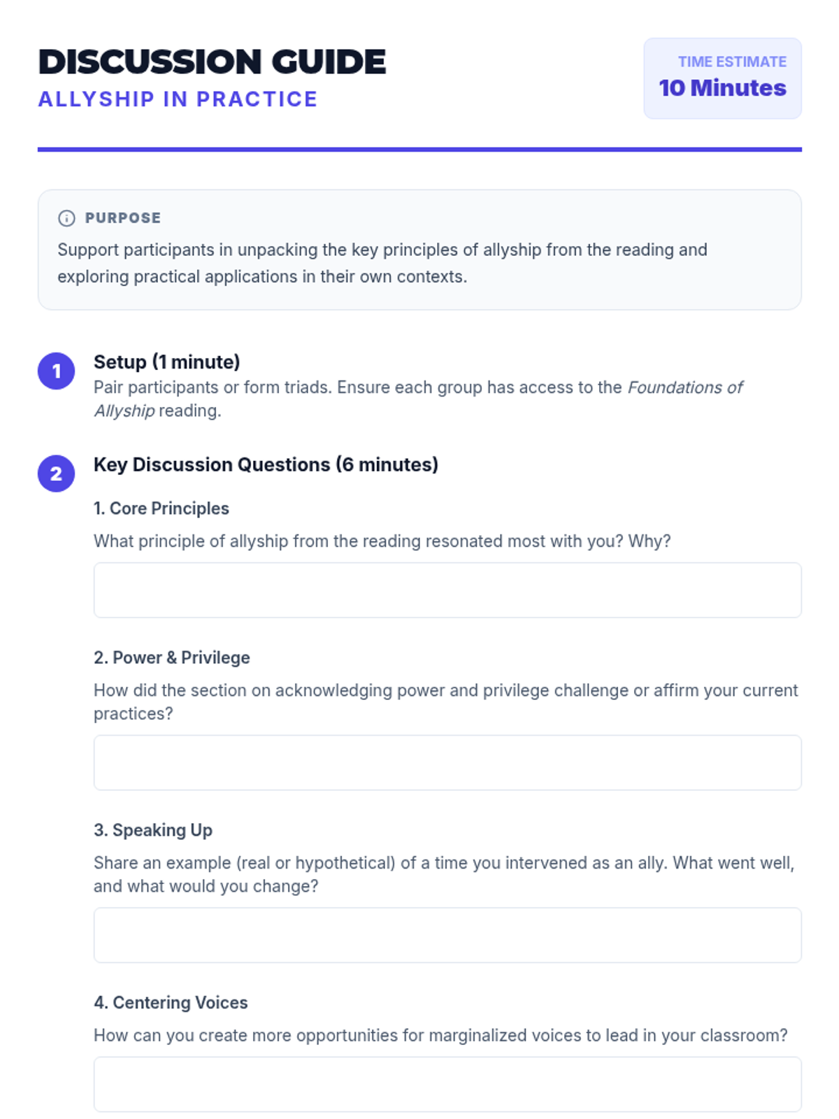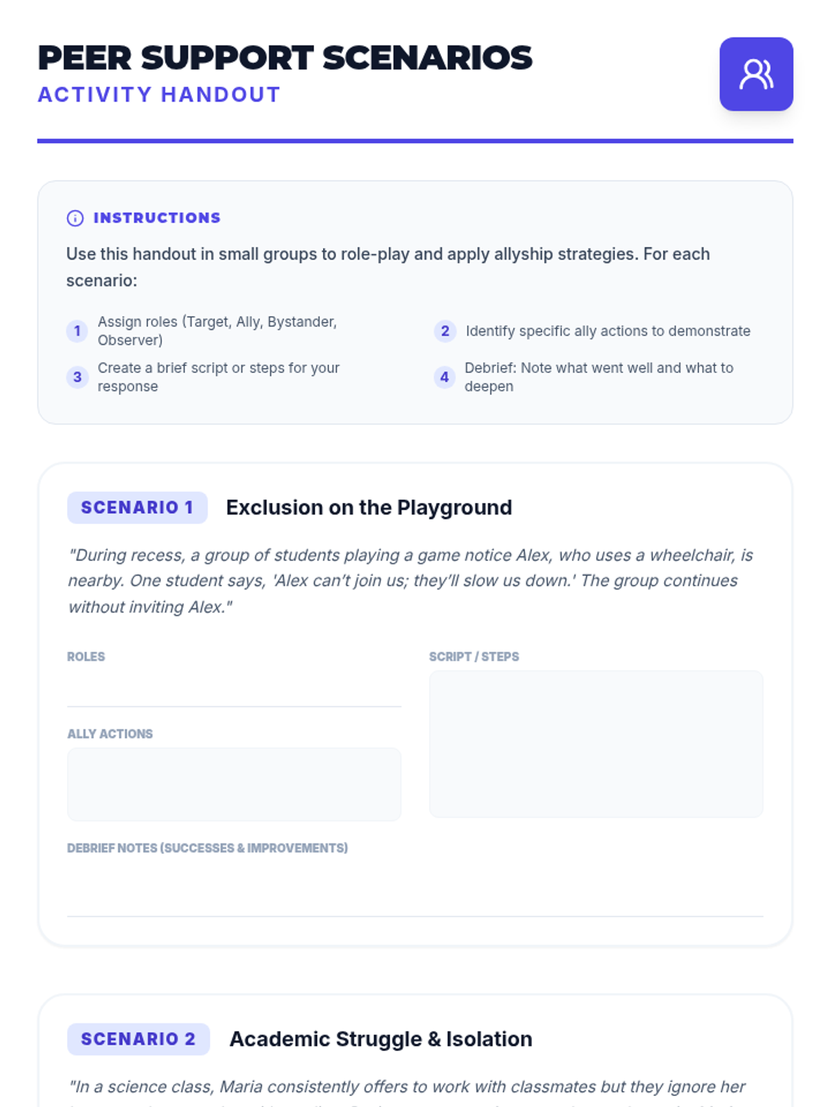 A 1-hour professional development session for educators to explore strategies for fostering peer support and allyship among students, culminating in actionable classroom plans.