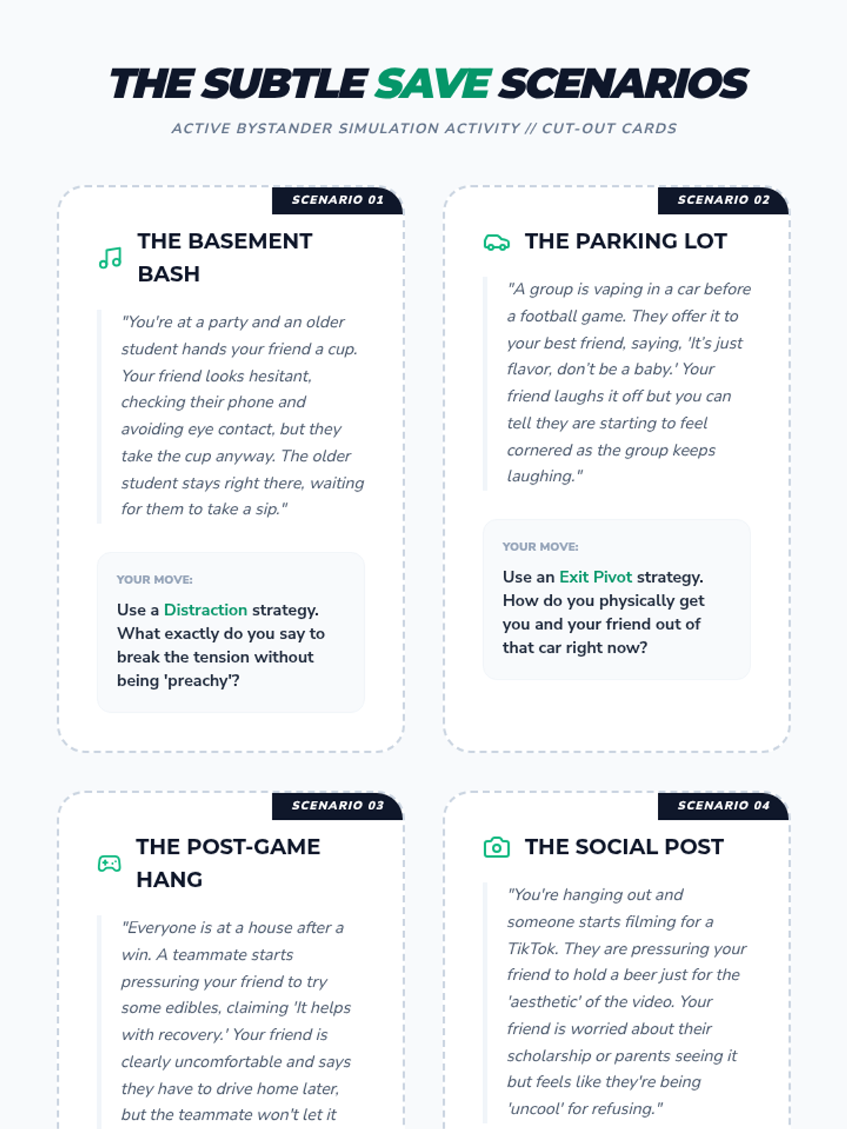 Focusing on active bystander skills, students learn 'wingman' strategies to help friends navigate high-pressure situations.