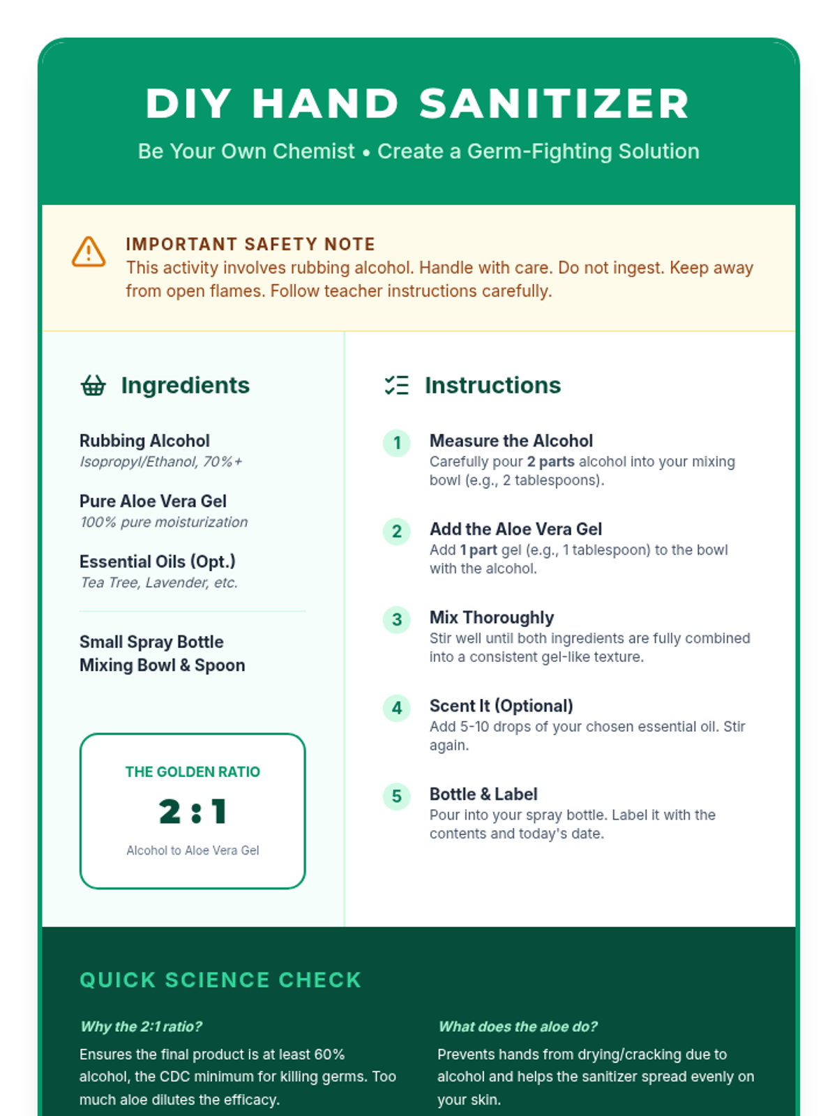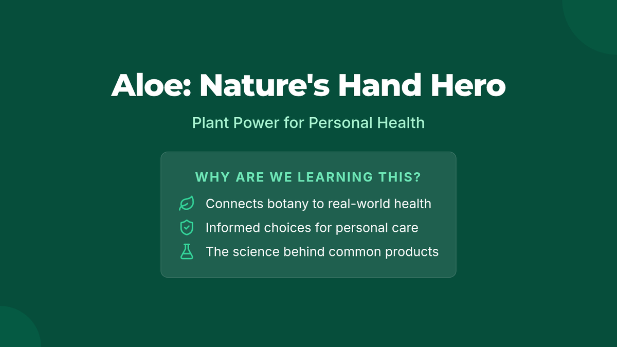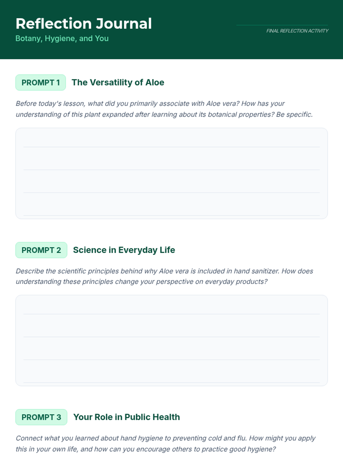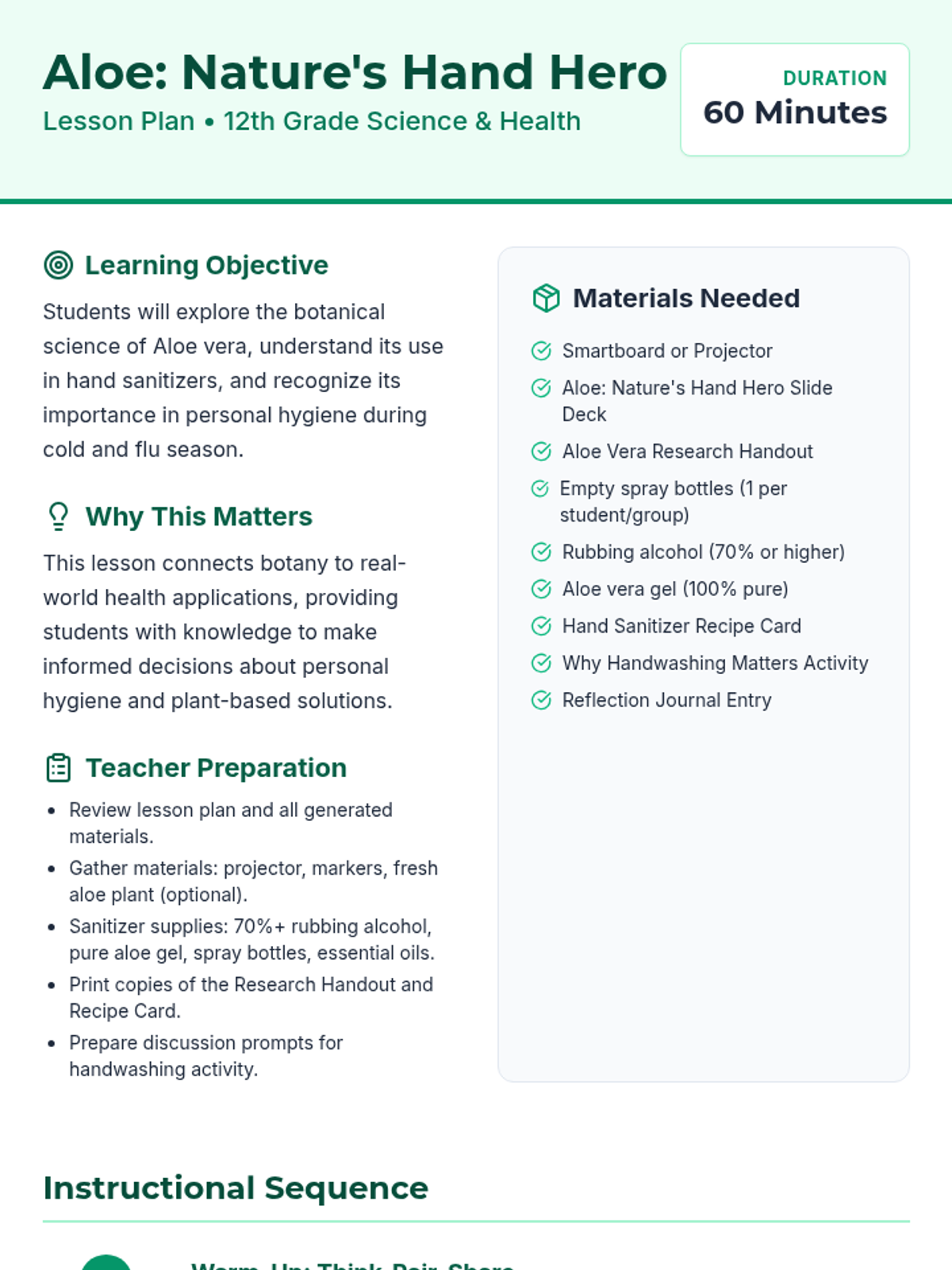 This 60-minute lesson explores the botanical science of Aloe vera and its practical use in hand sanitizers. Students investigate plant-based compounds, antimicrobial properties, and the importance of hygiene during cold and flu season through hands-on creation and reflection.