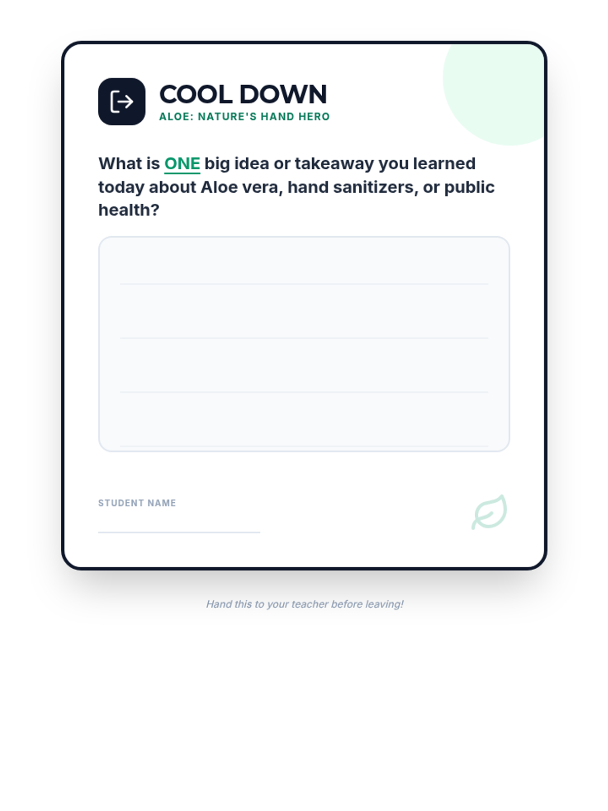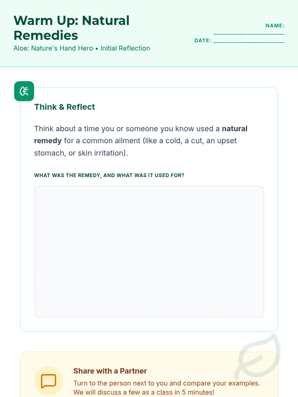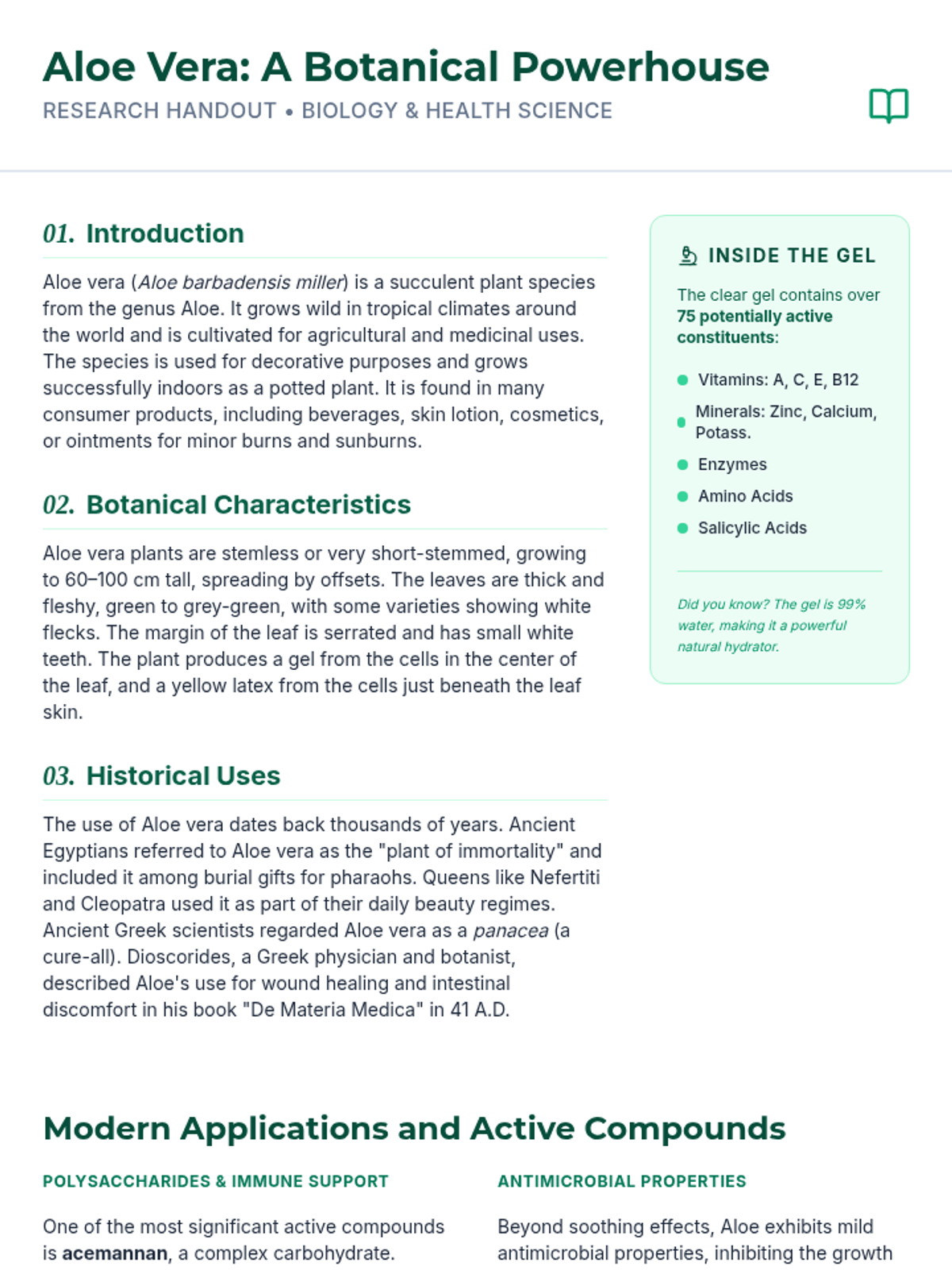 This 60-minute lesson explores the botanical science of Aloe vera and its practical use in hand sanitizers. Students investigate plant-based compounds, antimicrobial properties, and the importance of hygiene during cold and flu season through hands-on creation and reflection.