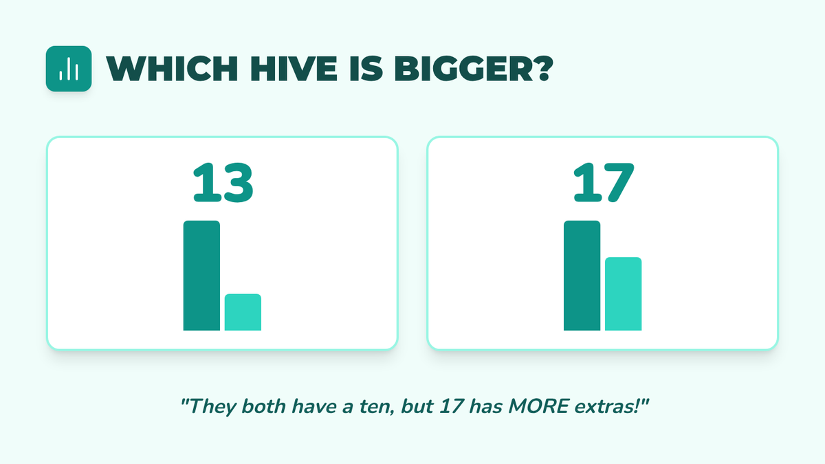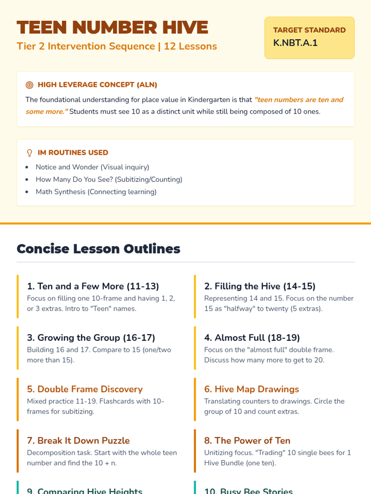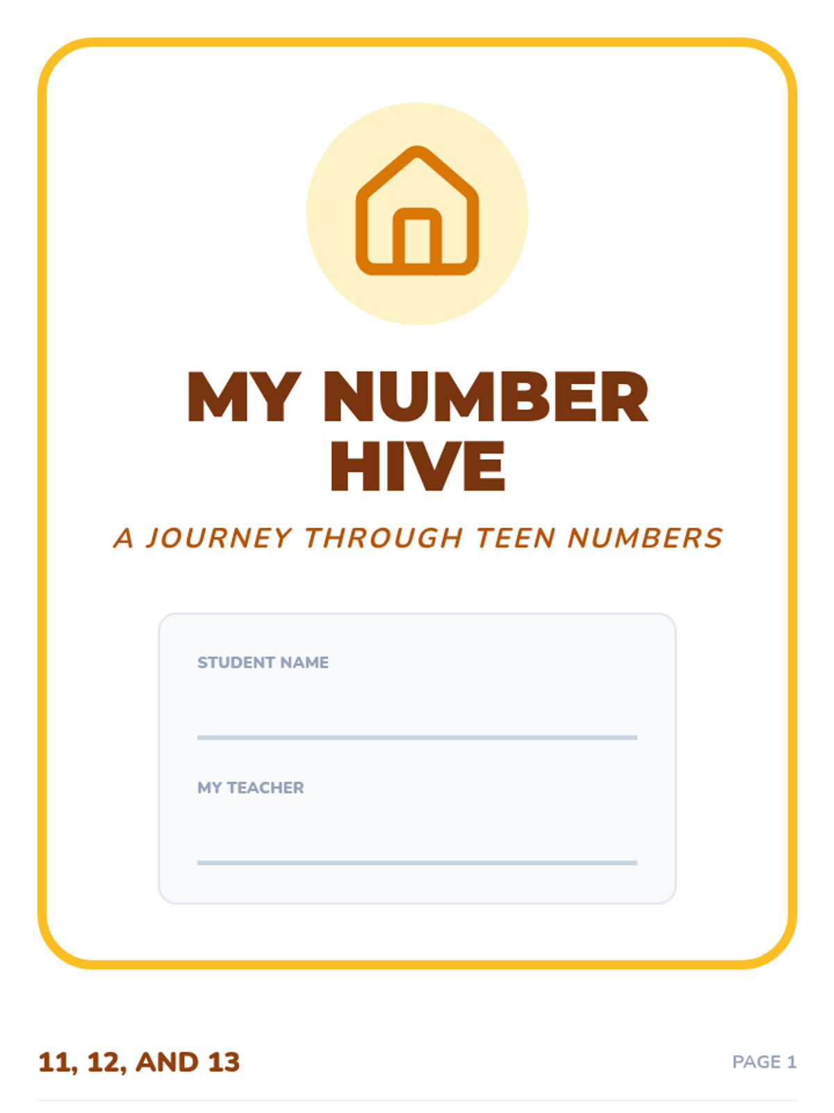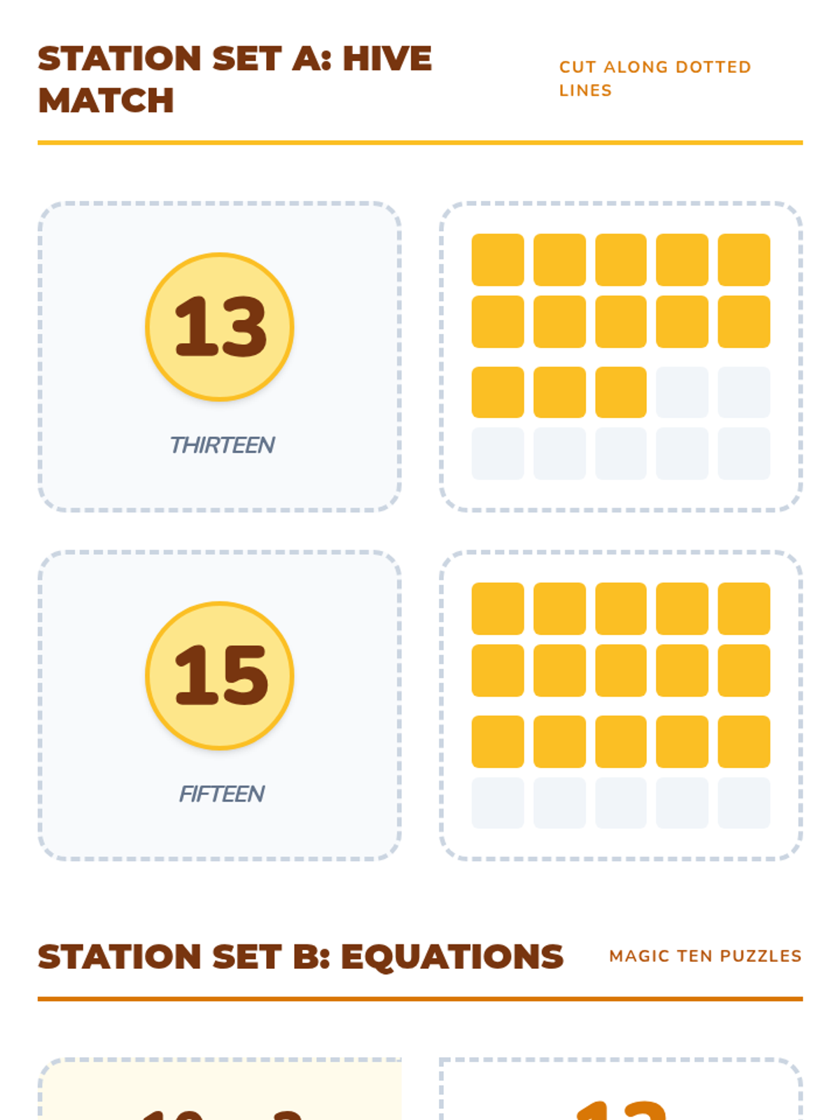 Breaking apart teen numbers into 'ten' and 'some more' to prepare for equation work.