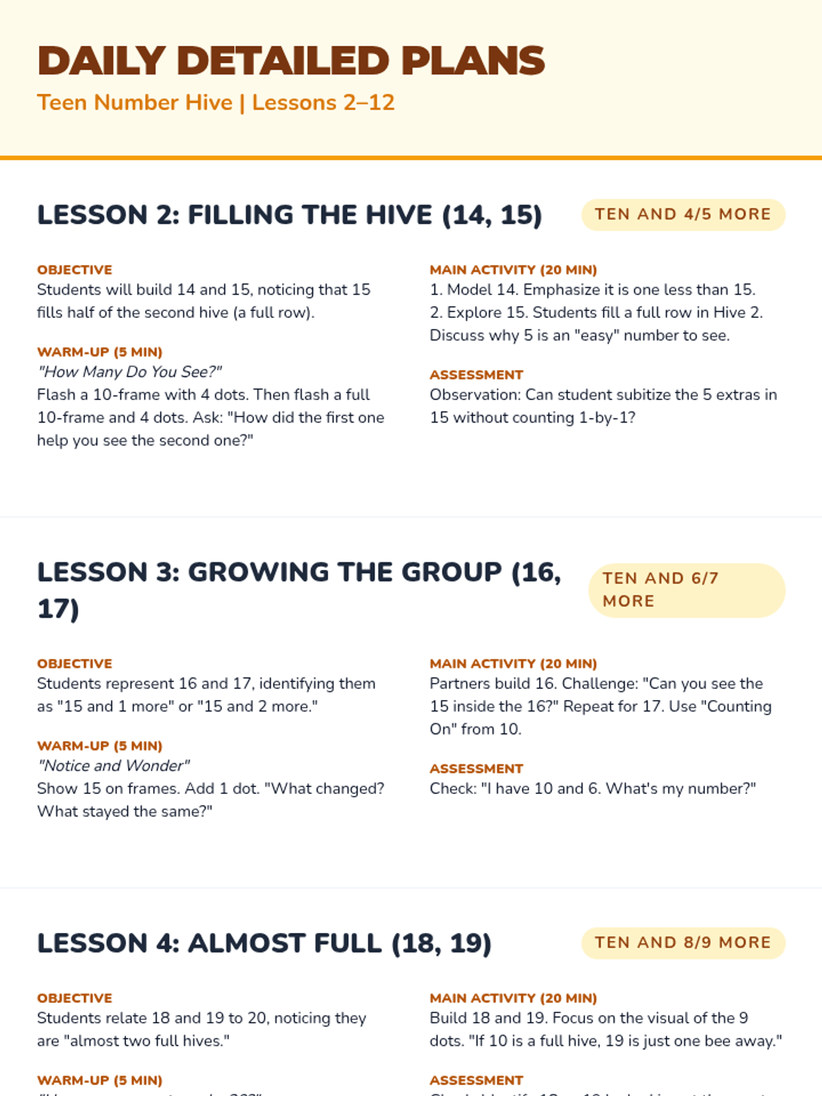 Students are introduced to the concept of 'ten and some more' focusing on the numbers 11, 12, and 13 using 10-frames and counters.