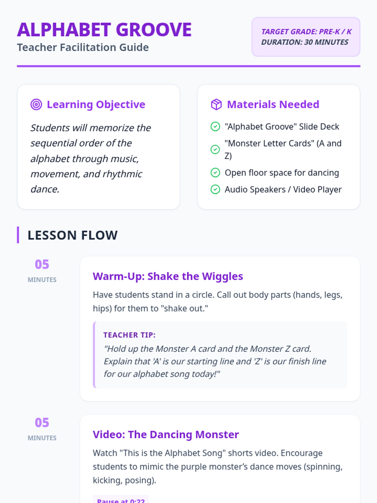 A high-energy lesson for Pre-K and Kindergarten students to learn the alphabet sequence through music, movement, and a "Freeze Dance" activity featuring a dancing monster.