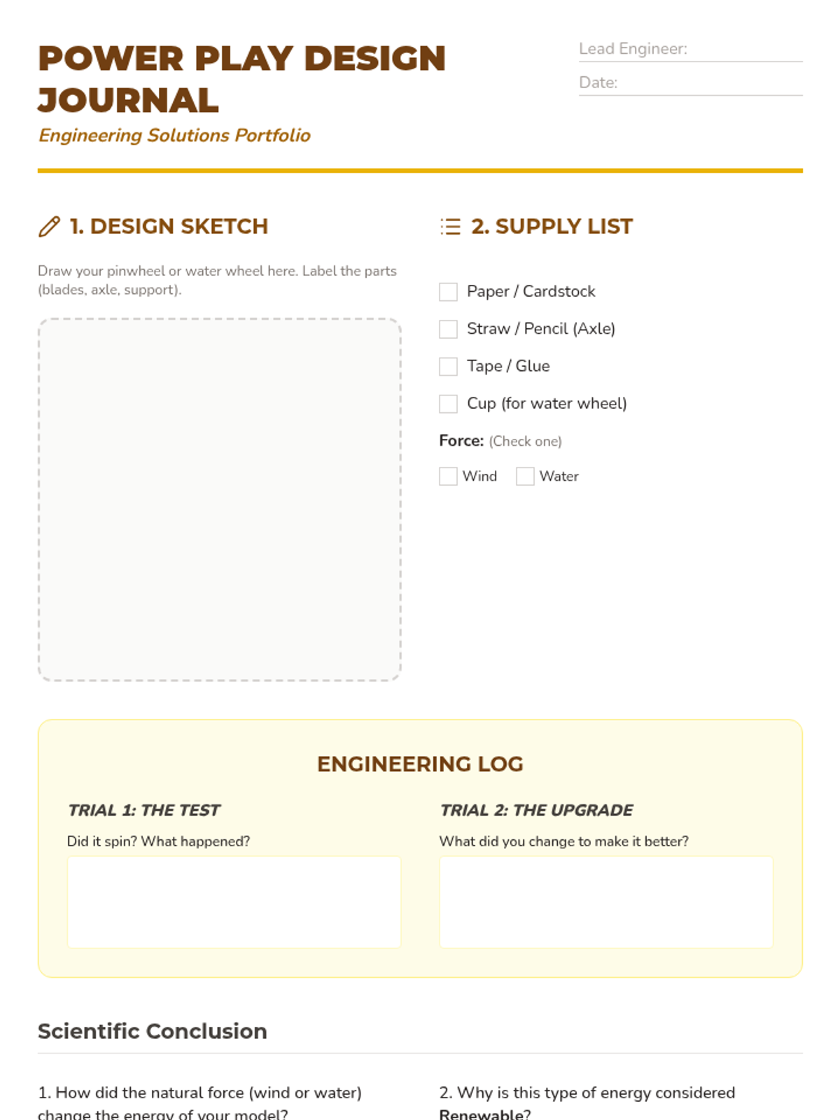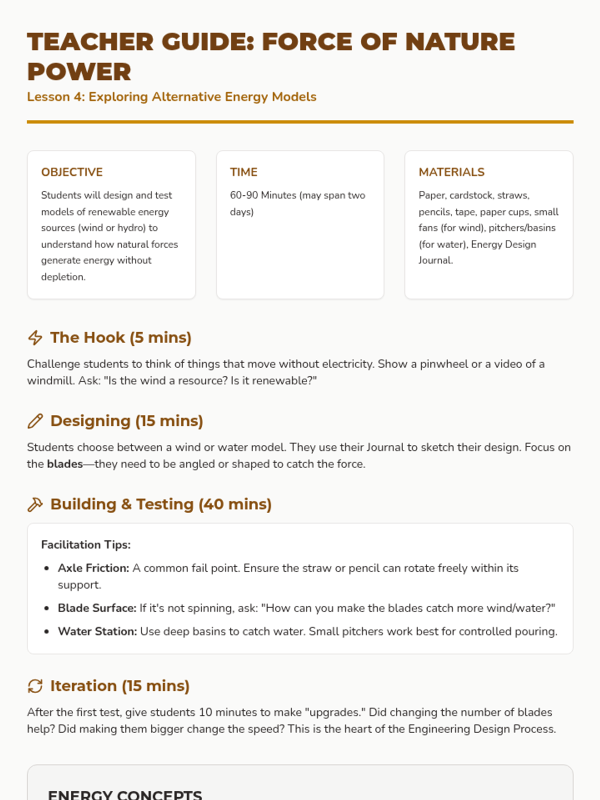Small groups build models like pinwheels or water wheels to demonstrate how natural forces can generate energy sustainably.