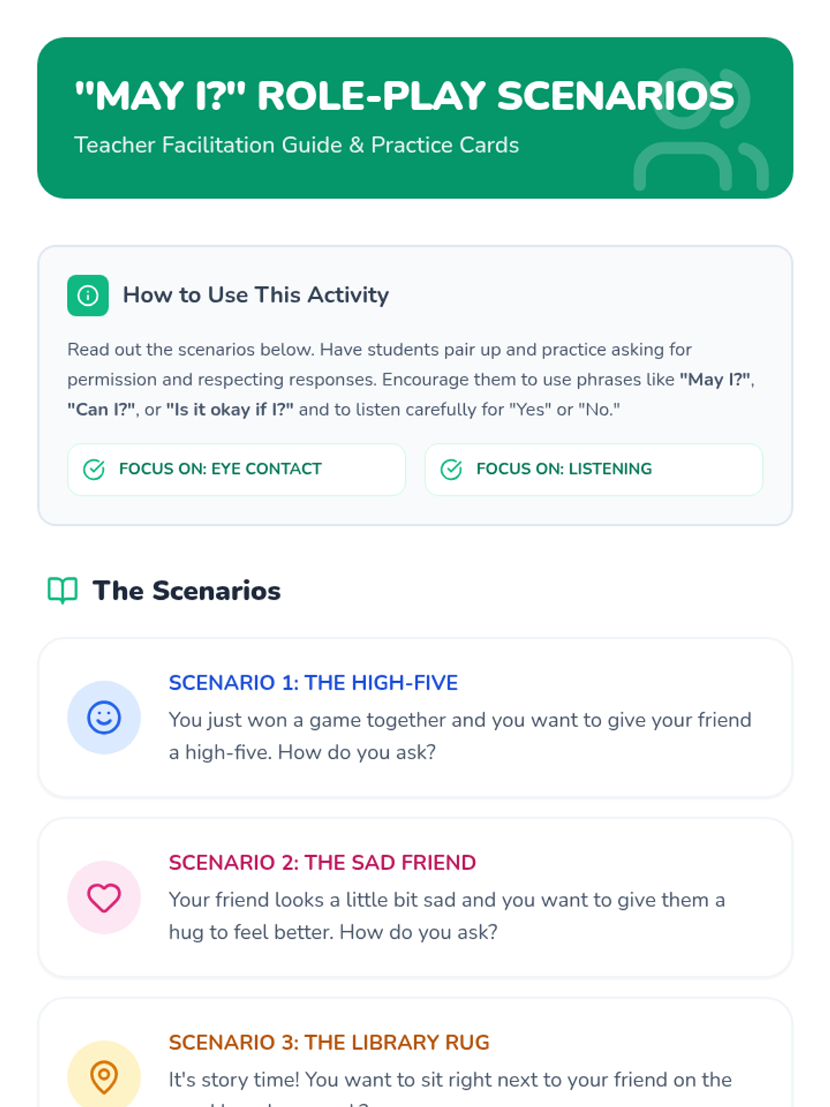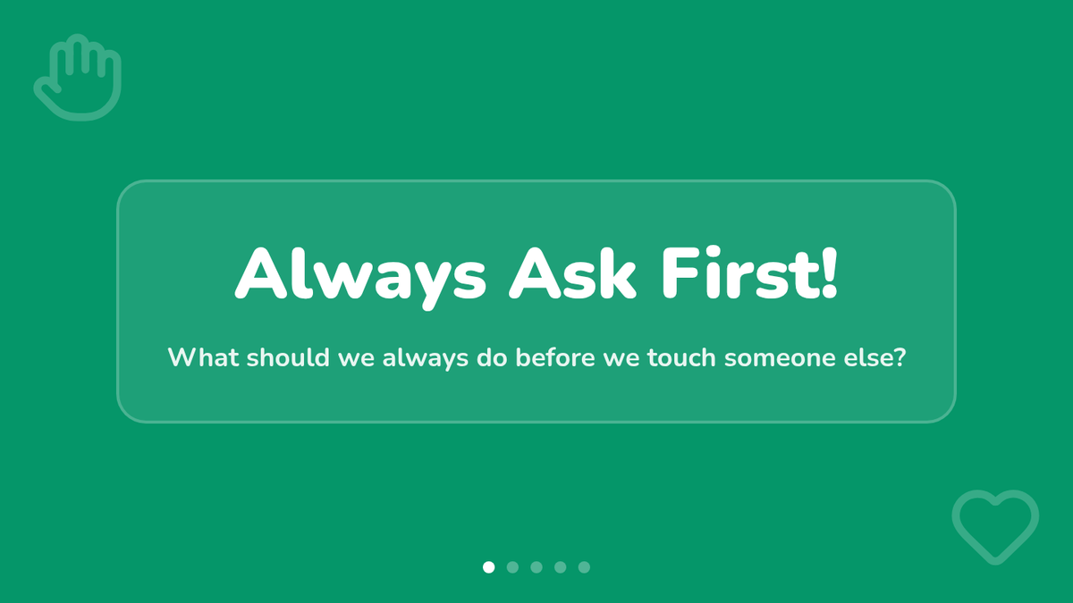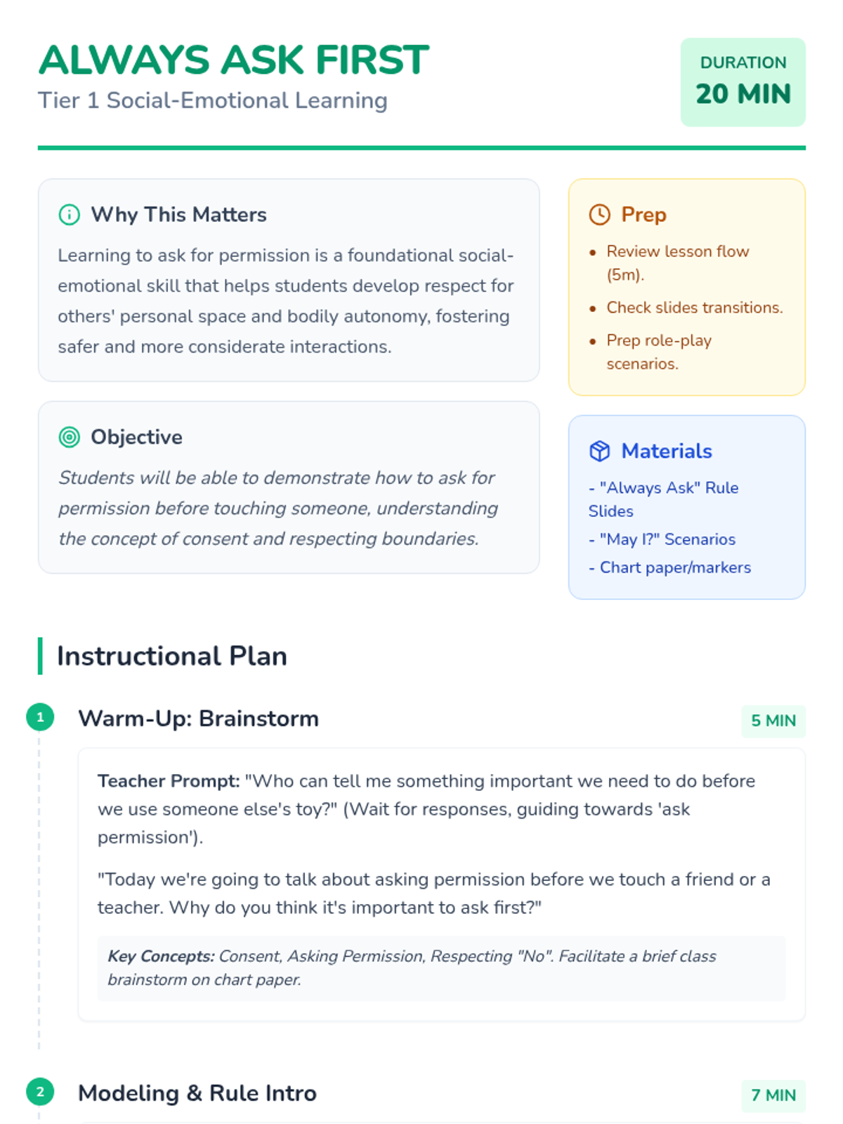 A 20-minute lesson for 1st graders focusing on the importance of asking for permission before touching others, introducing the concepts of consent and personal space.