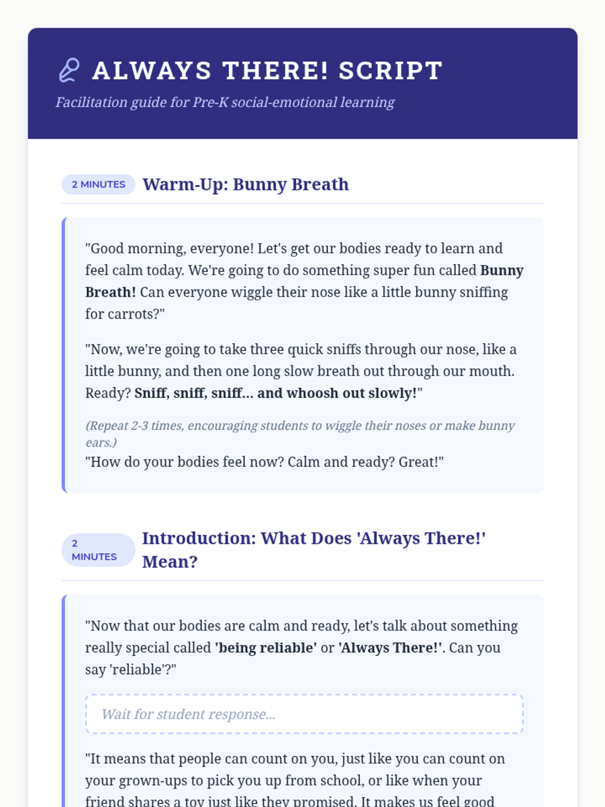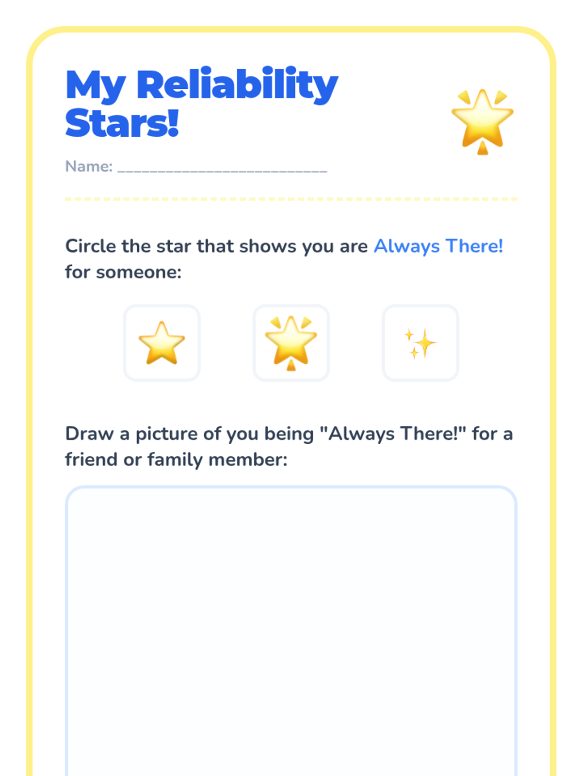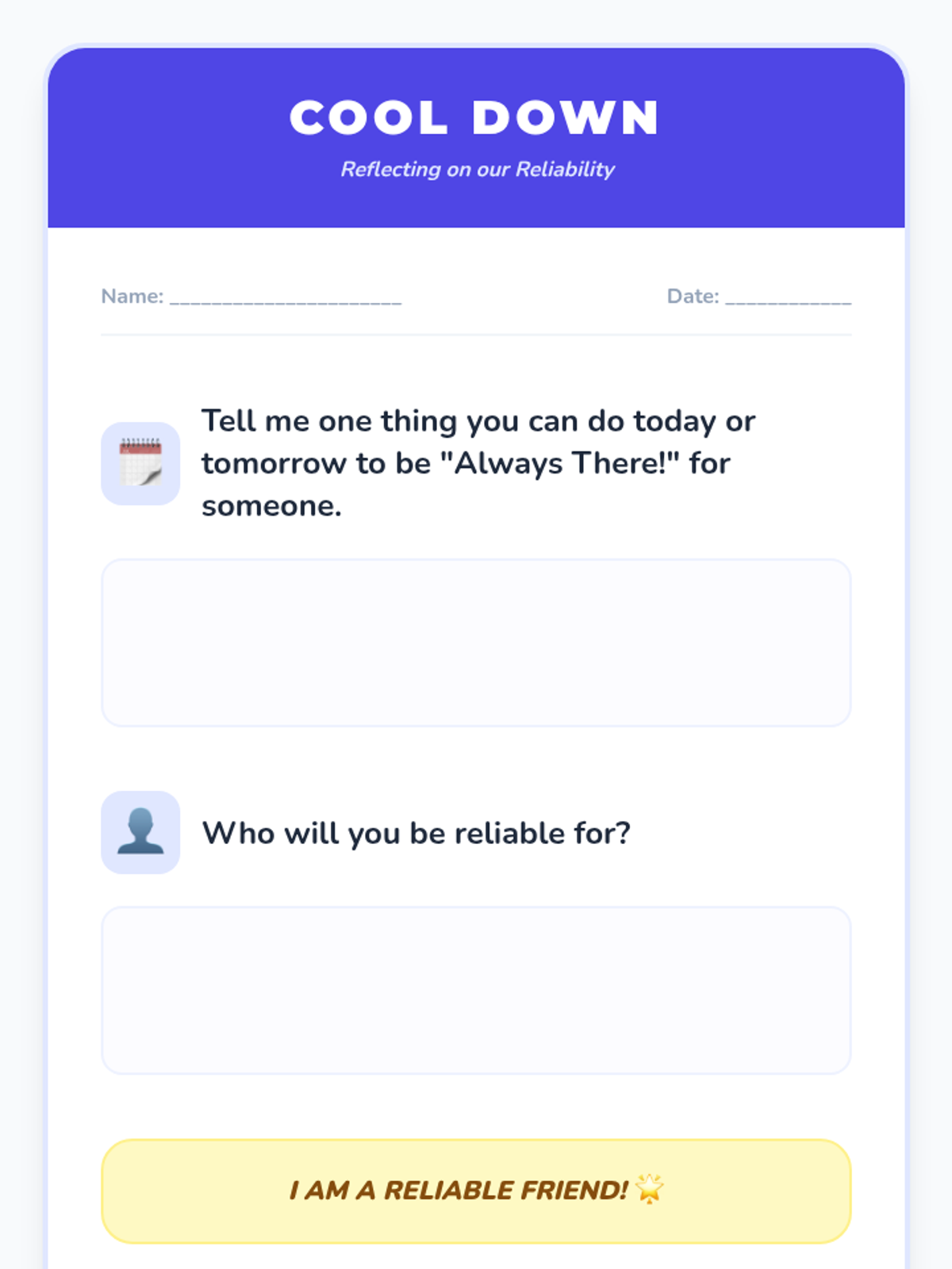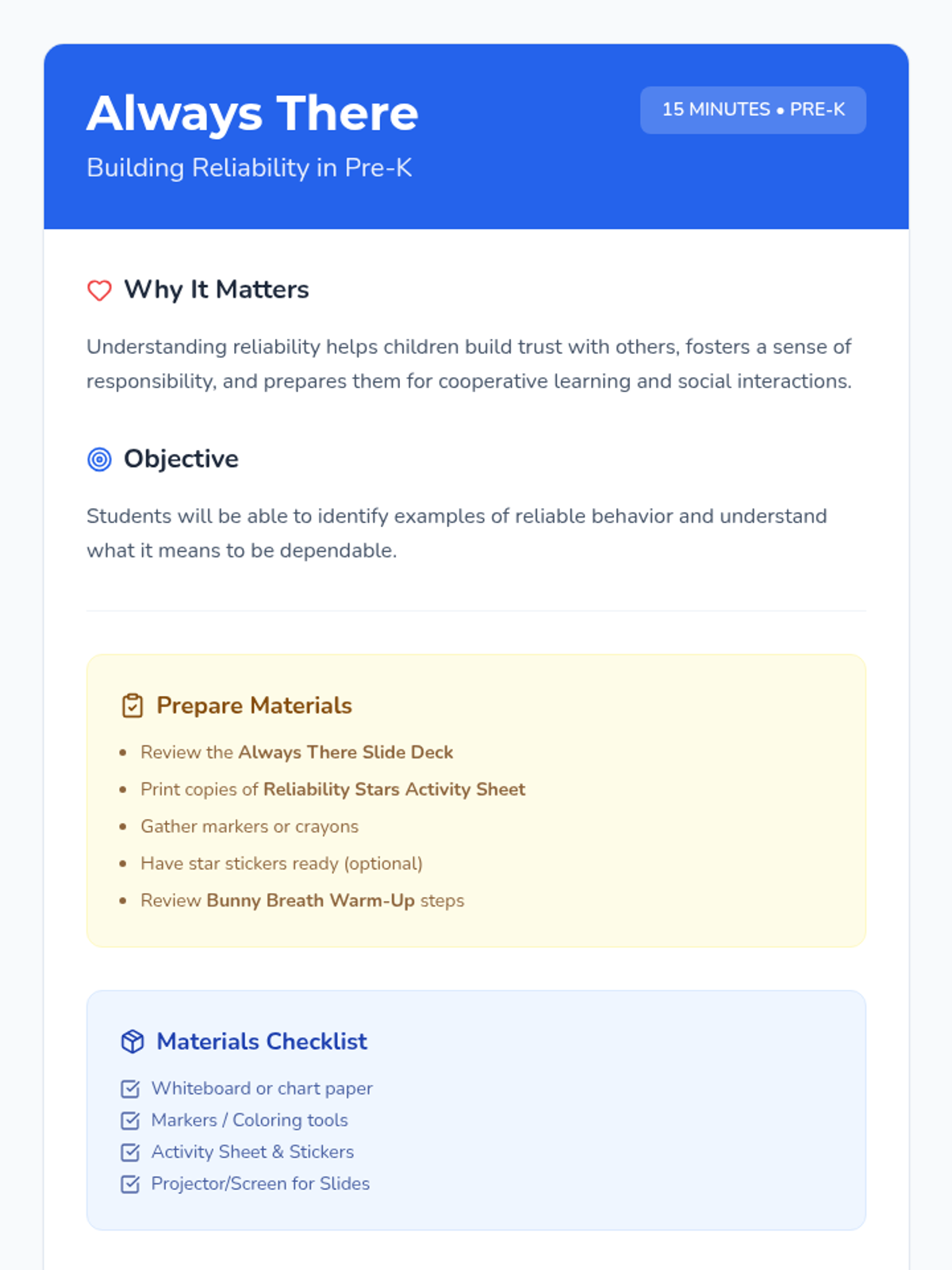 A 15-minute Pre-K lesson introducing the concept of reliability through relatable examples, a breathing warm-up, and a creative activity. Students learn what it means to be 'Always There!' for others.