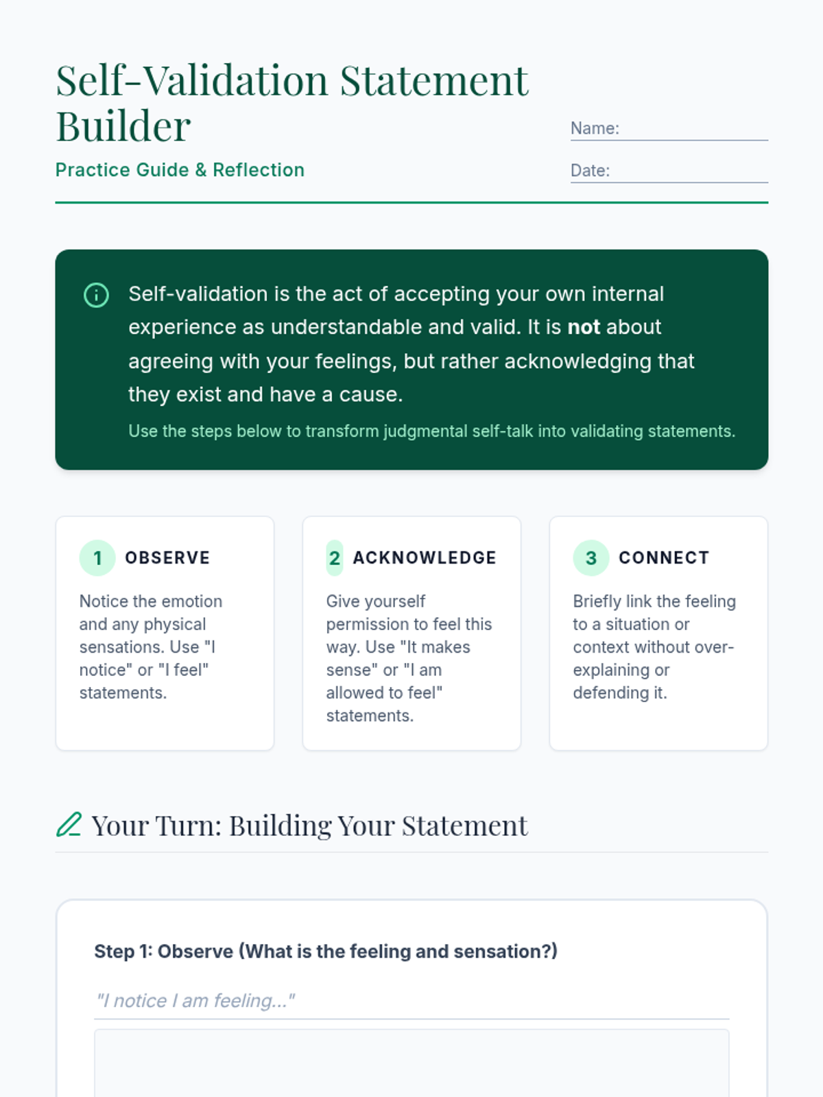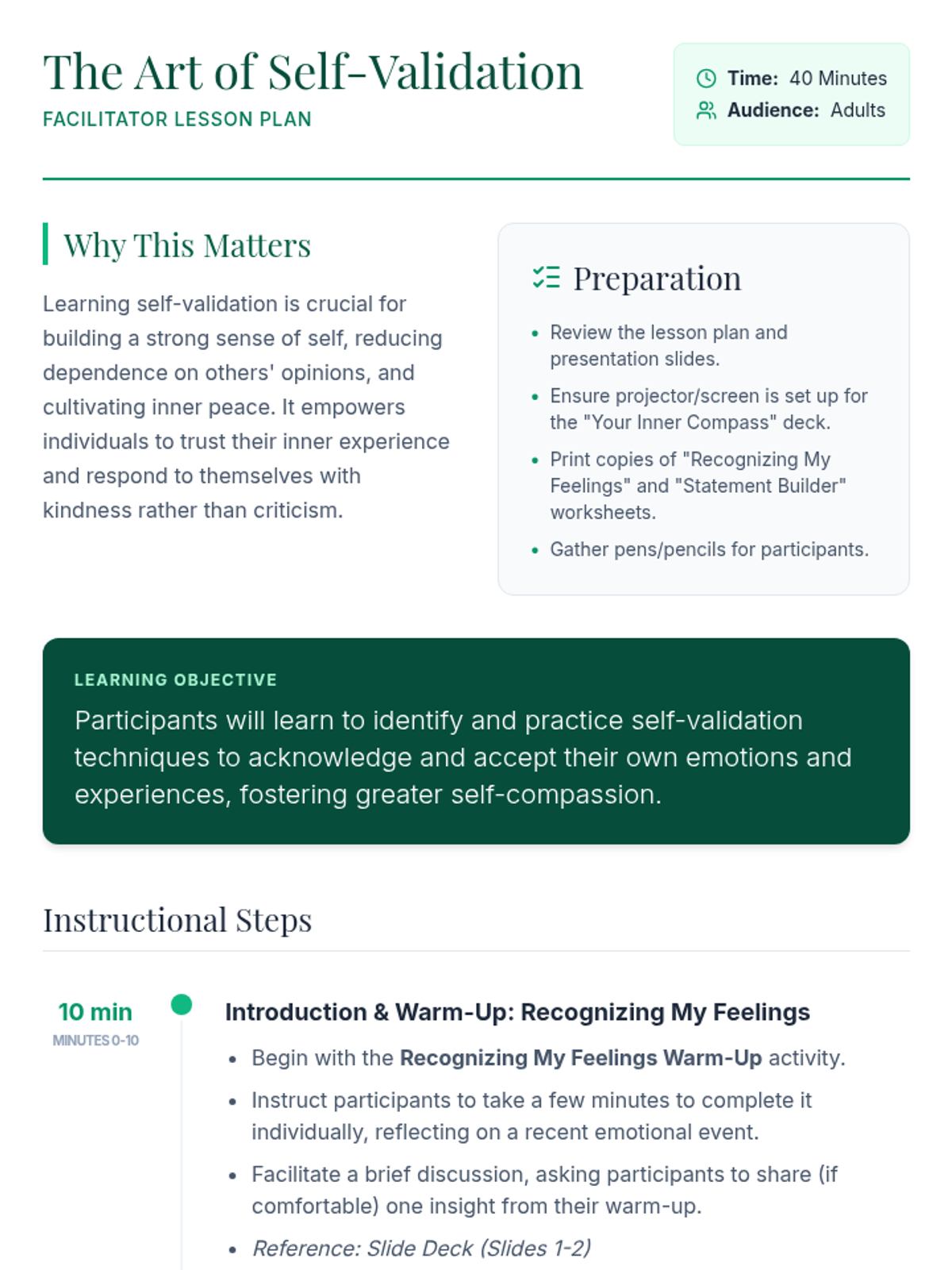 This lesson focuses on self-validation, teaching adults to acknowledge and accept their own experiences and emotions to build self-compassion and emotional resilience.