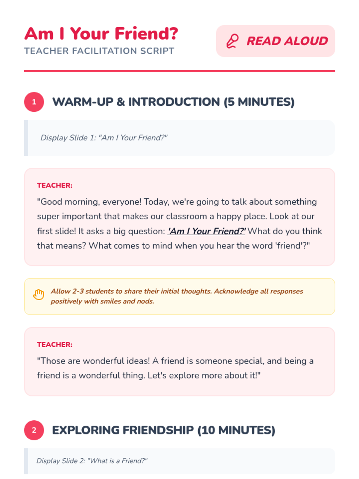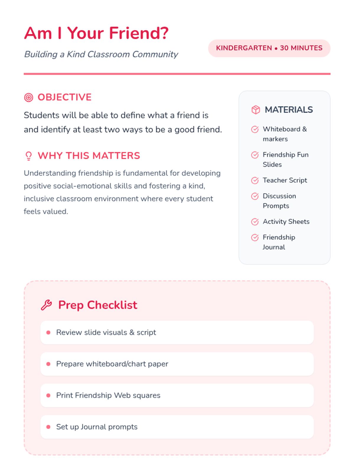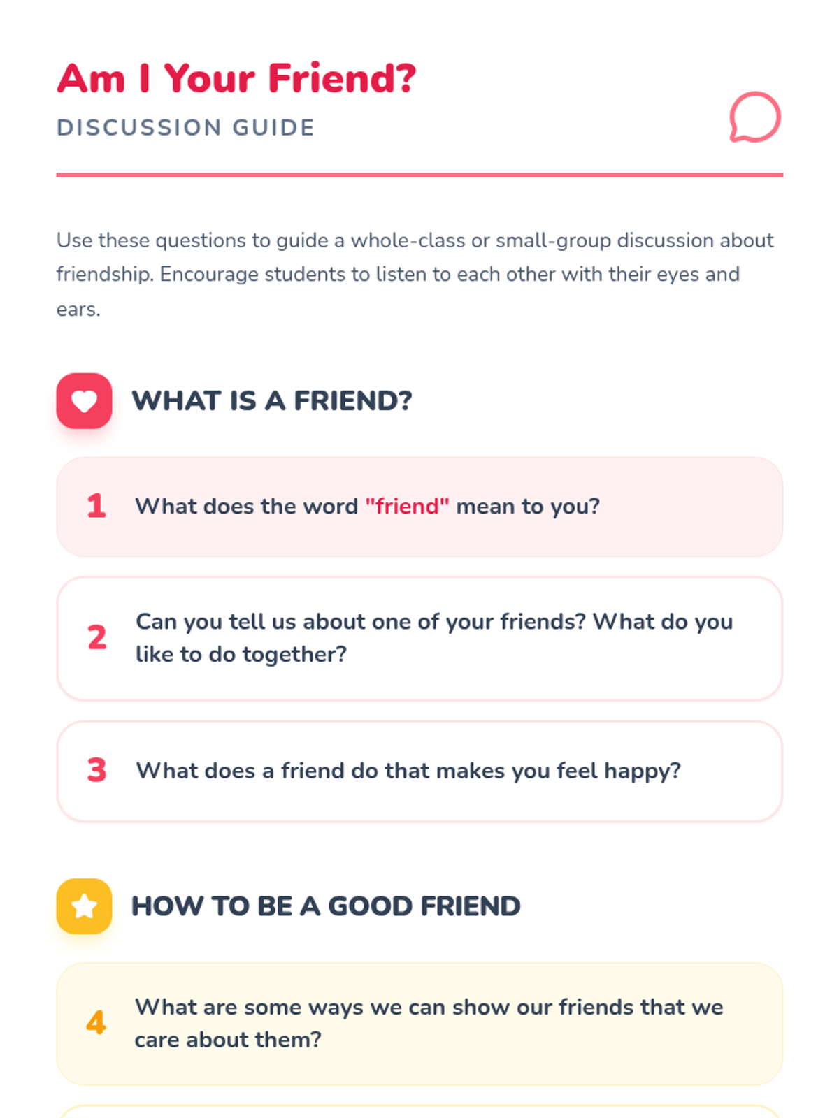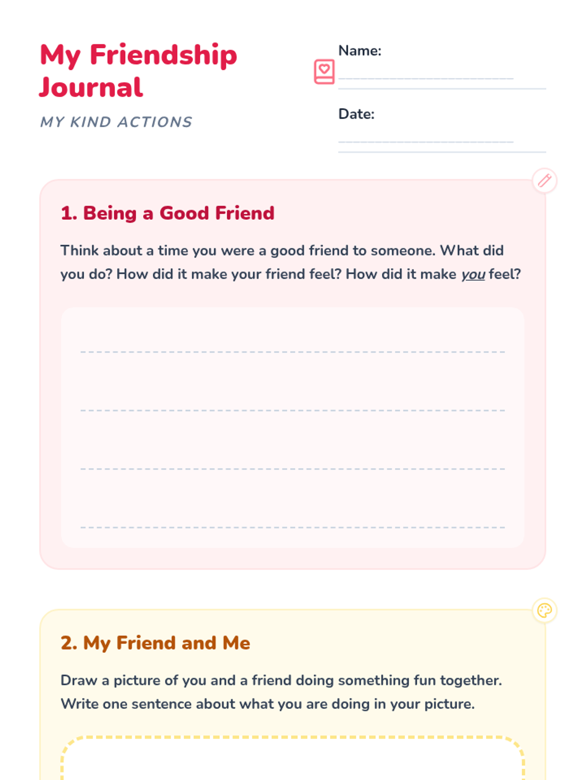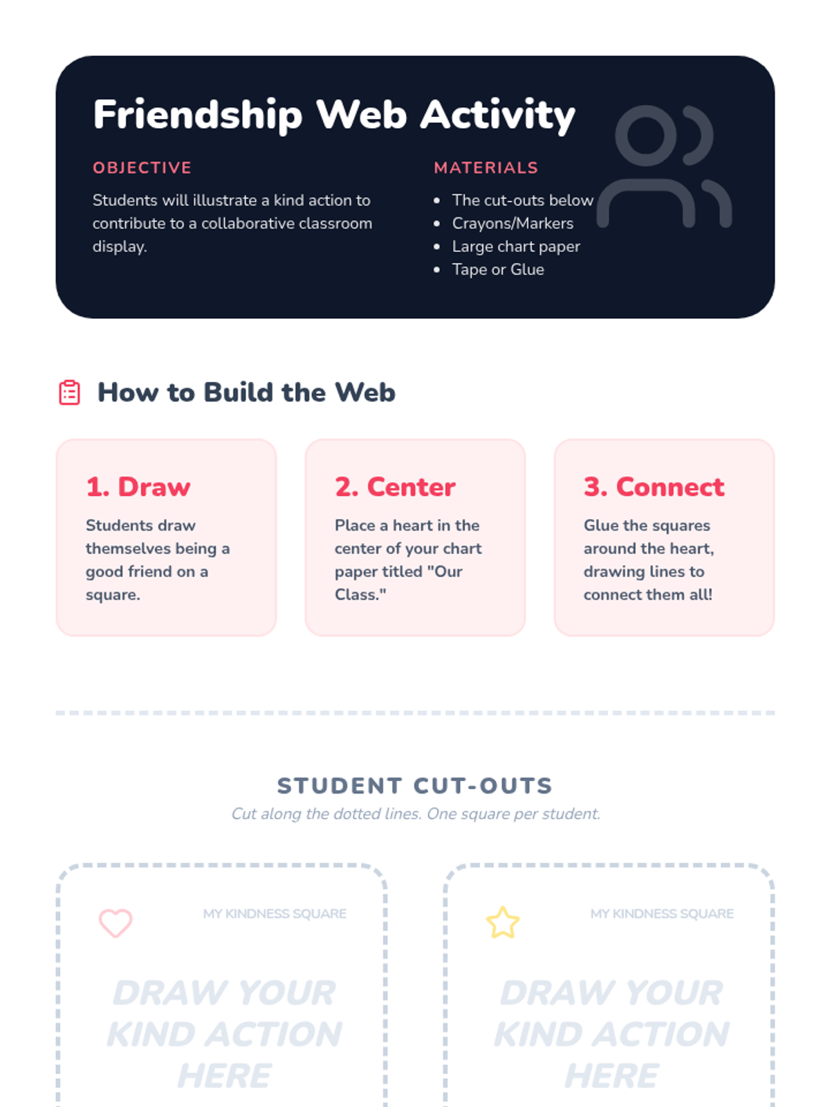 A 30-minute lesson for Kindergarteners to explore the qualities of a good friend and practice showing kindness through discussion and a collaborative activity.