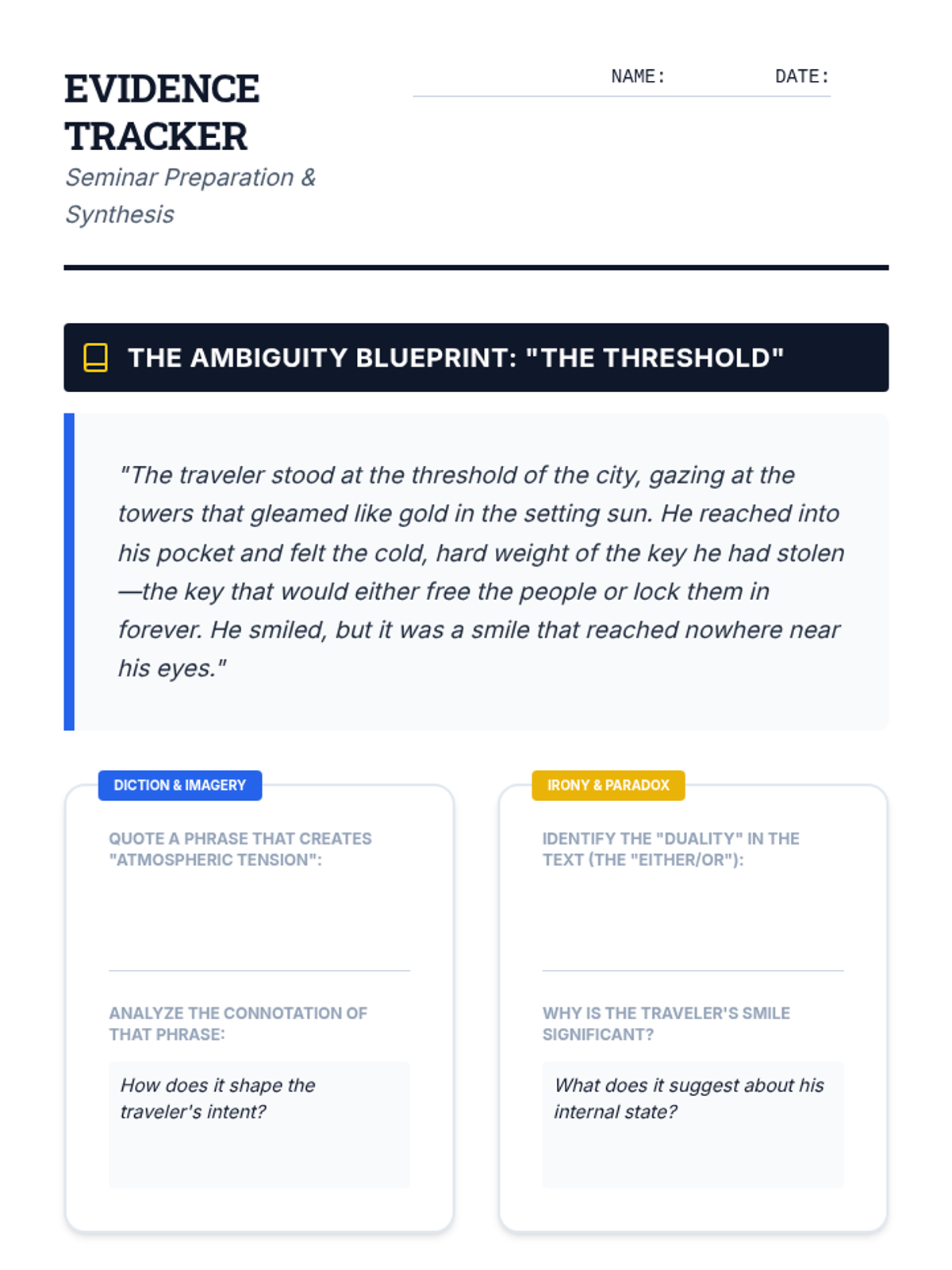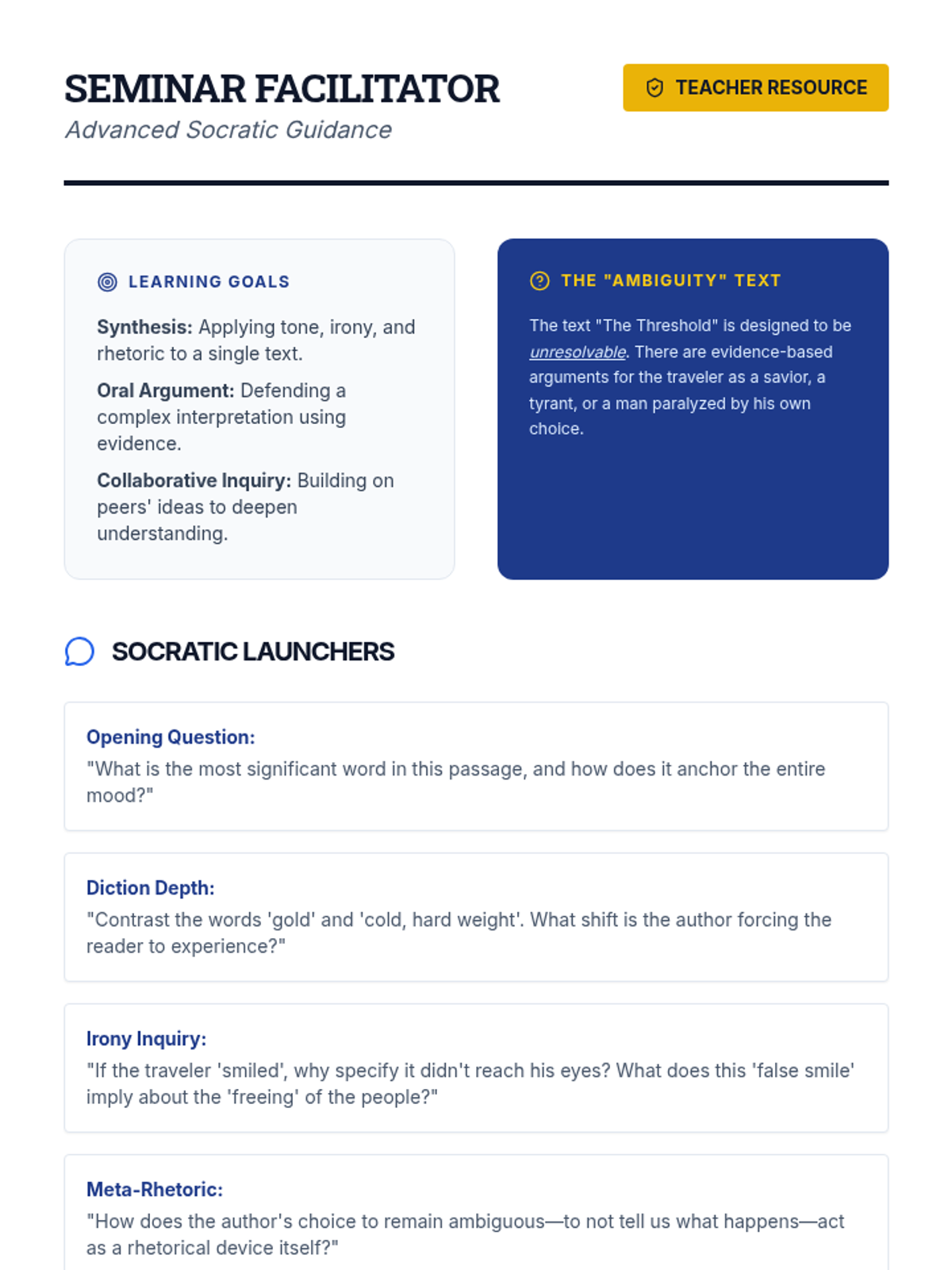 The sequence culminates in a Socratic seminar where students defend interpretations of ambiguous texts using evidence and critical analysis.