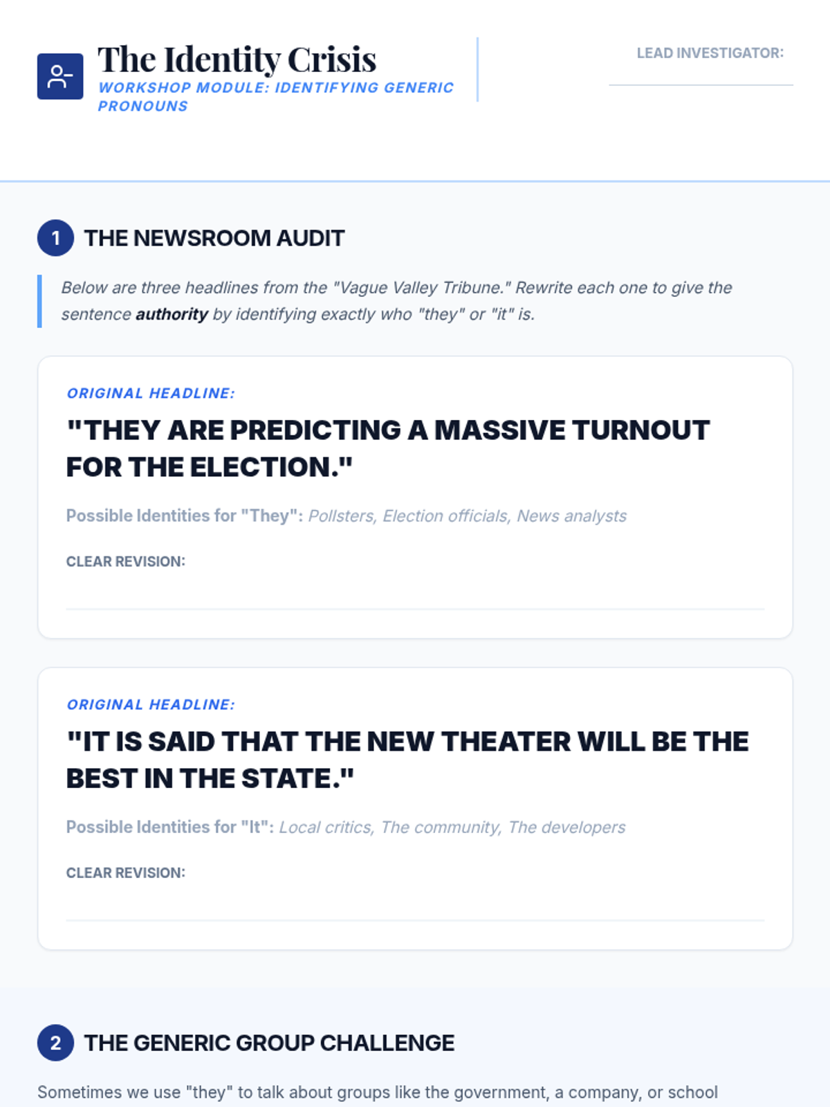 Focuses on the common habit of using 'they' and 'it' to refer to generic, unidentified groups, teaching students to identify and specify the actor in the sentence.