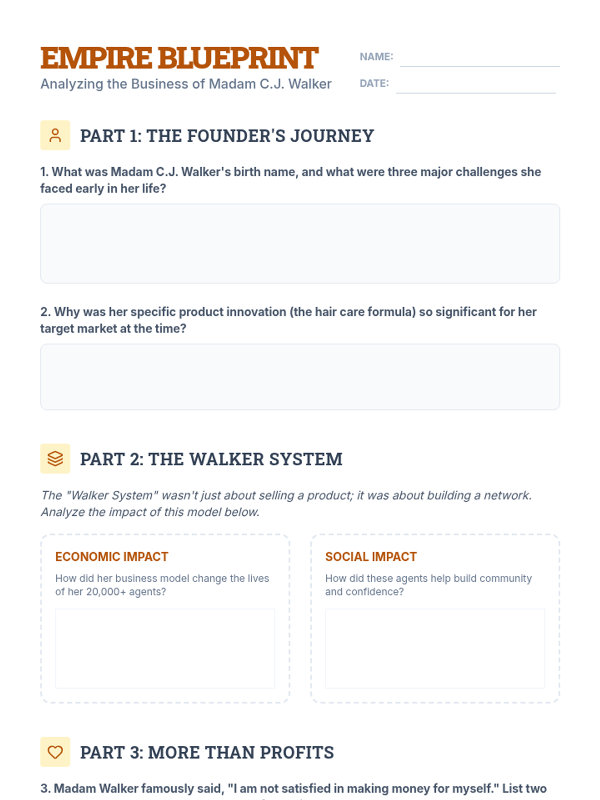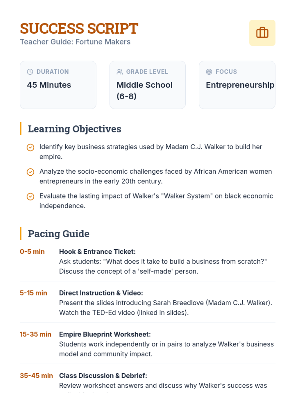 A 45-minute high school history lesson exploring the lives, business strategies, and social impact of Black women entrepreneurs in the 19th and 20th centuries, featuring Madam C.J. Walker and Maggie Lena Walker.