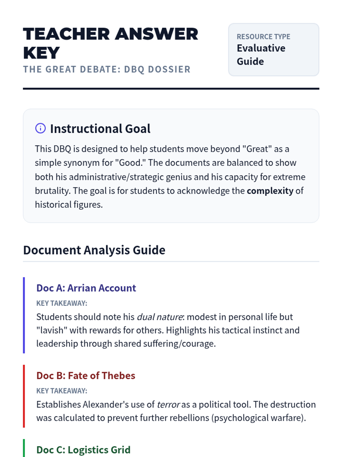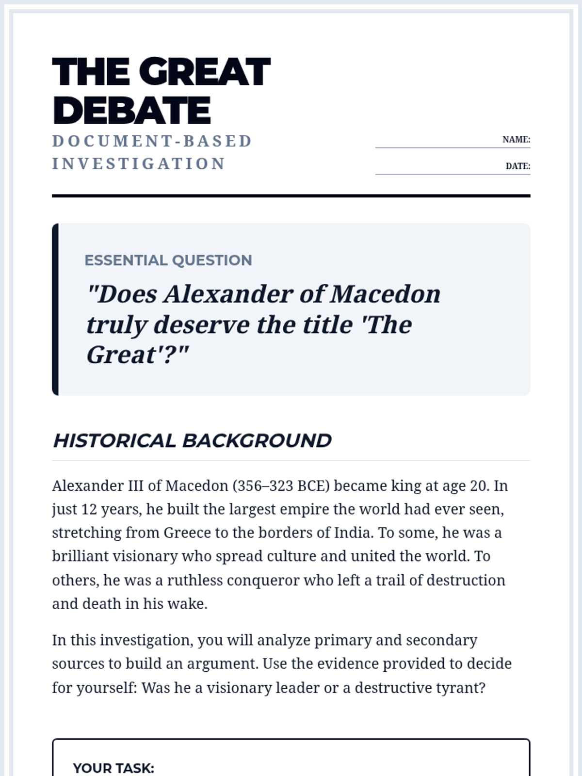 A document-based investigation into the complex legacy of Alexander the Great, challenging students to evaluate whether he deserved his 'Great' title based on primary and secondary sources.