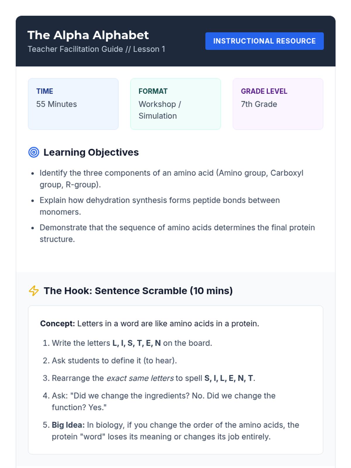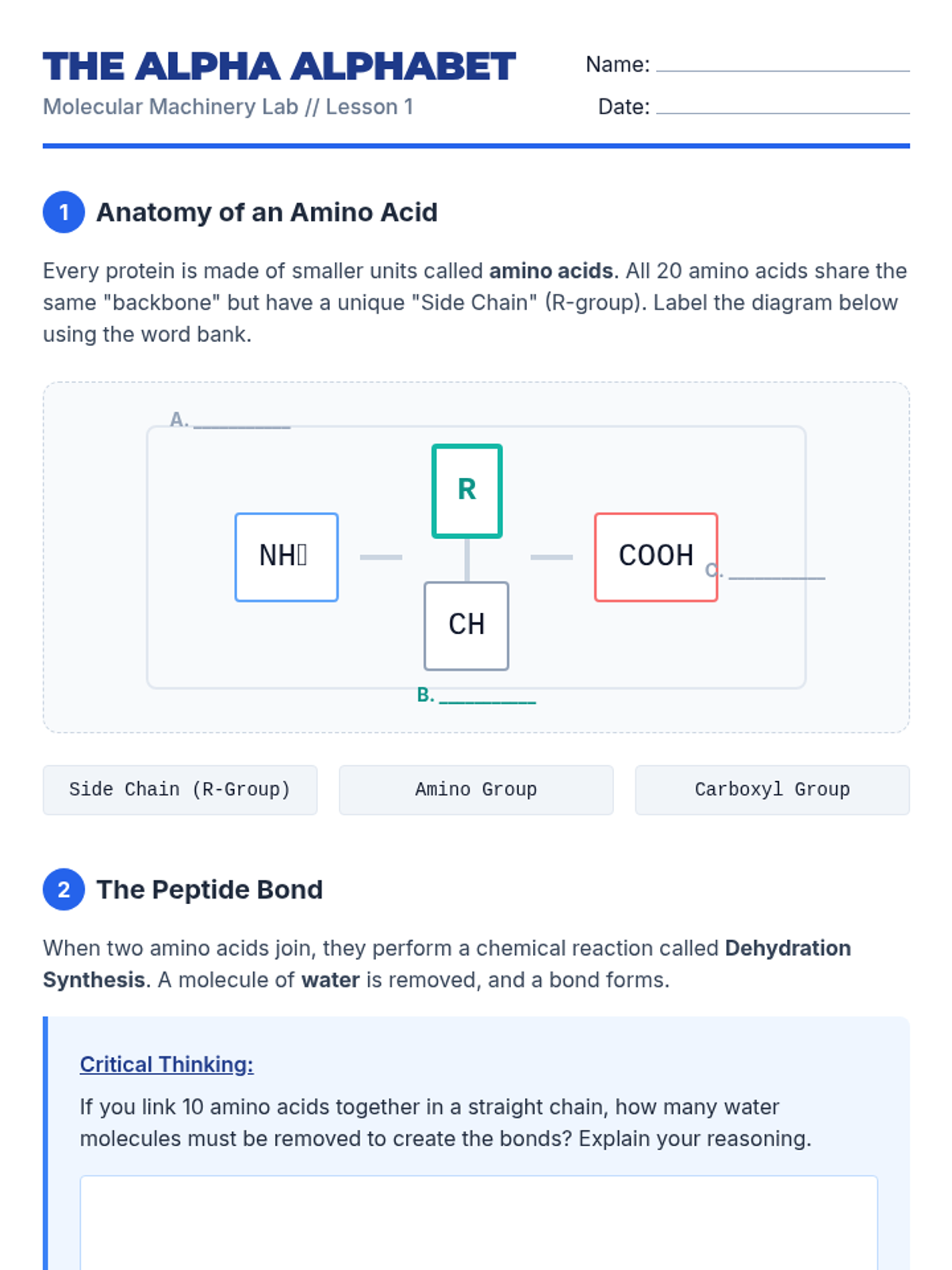 Students explore the building blocks of proteins, simulating the formation of polypeptide chains using bead kits and a 20-letter molecular alphabet.