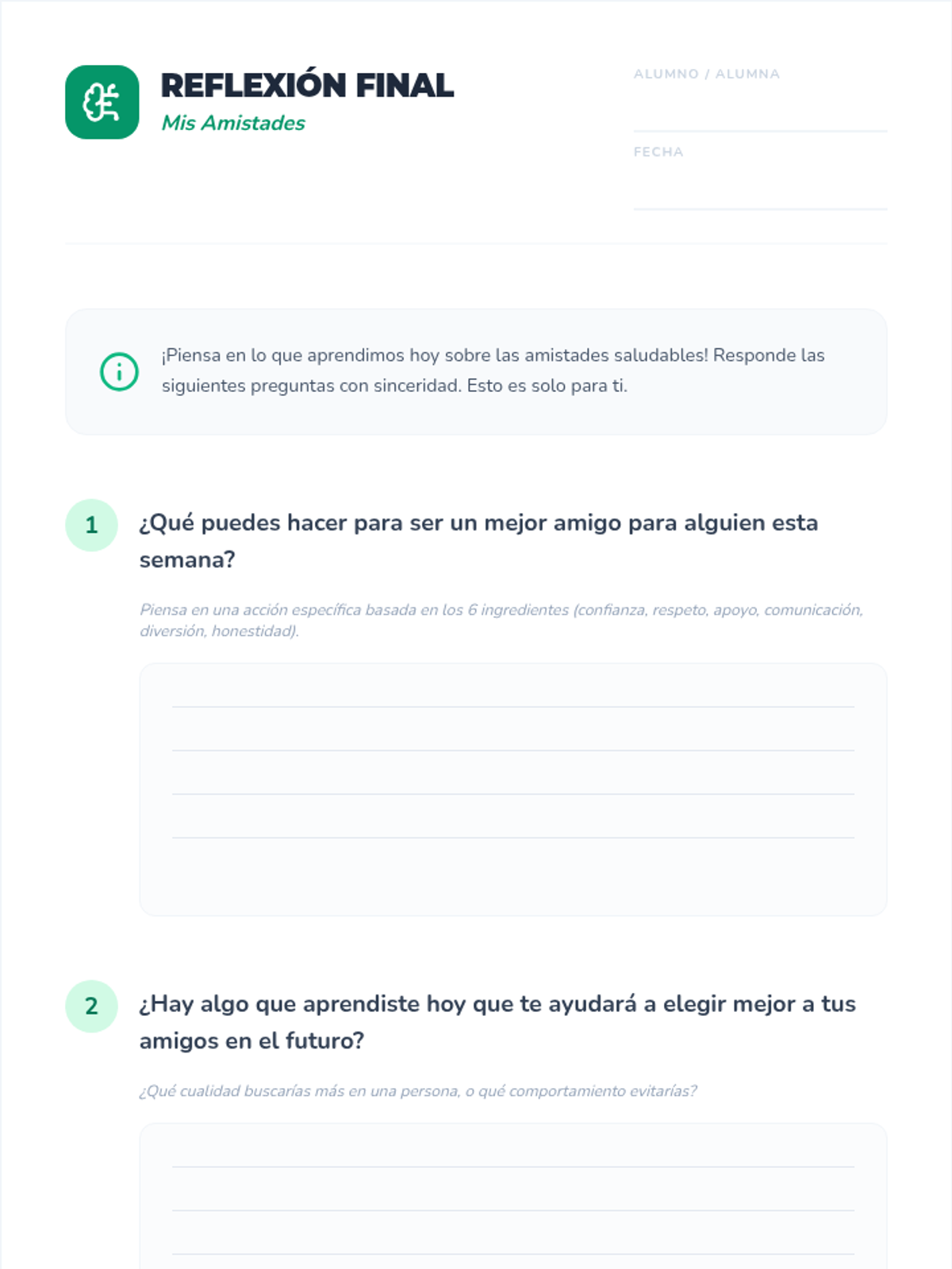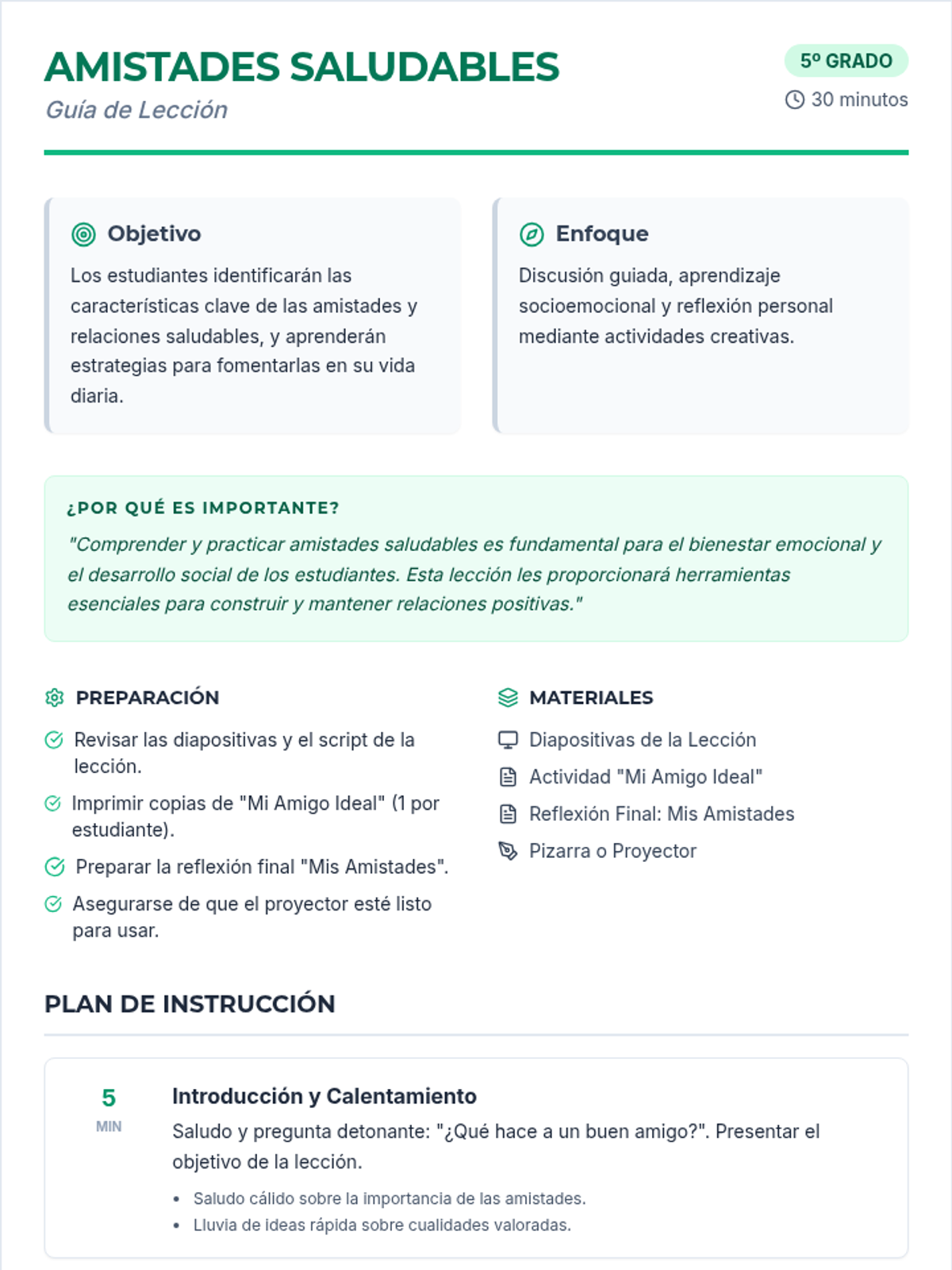 Una lección de 30 minutos diseñada para que estudiantes de 5º grado identifiquen y practiquen las características de las amistades saludables a través de discusiones y actividades reflexivas.