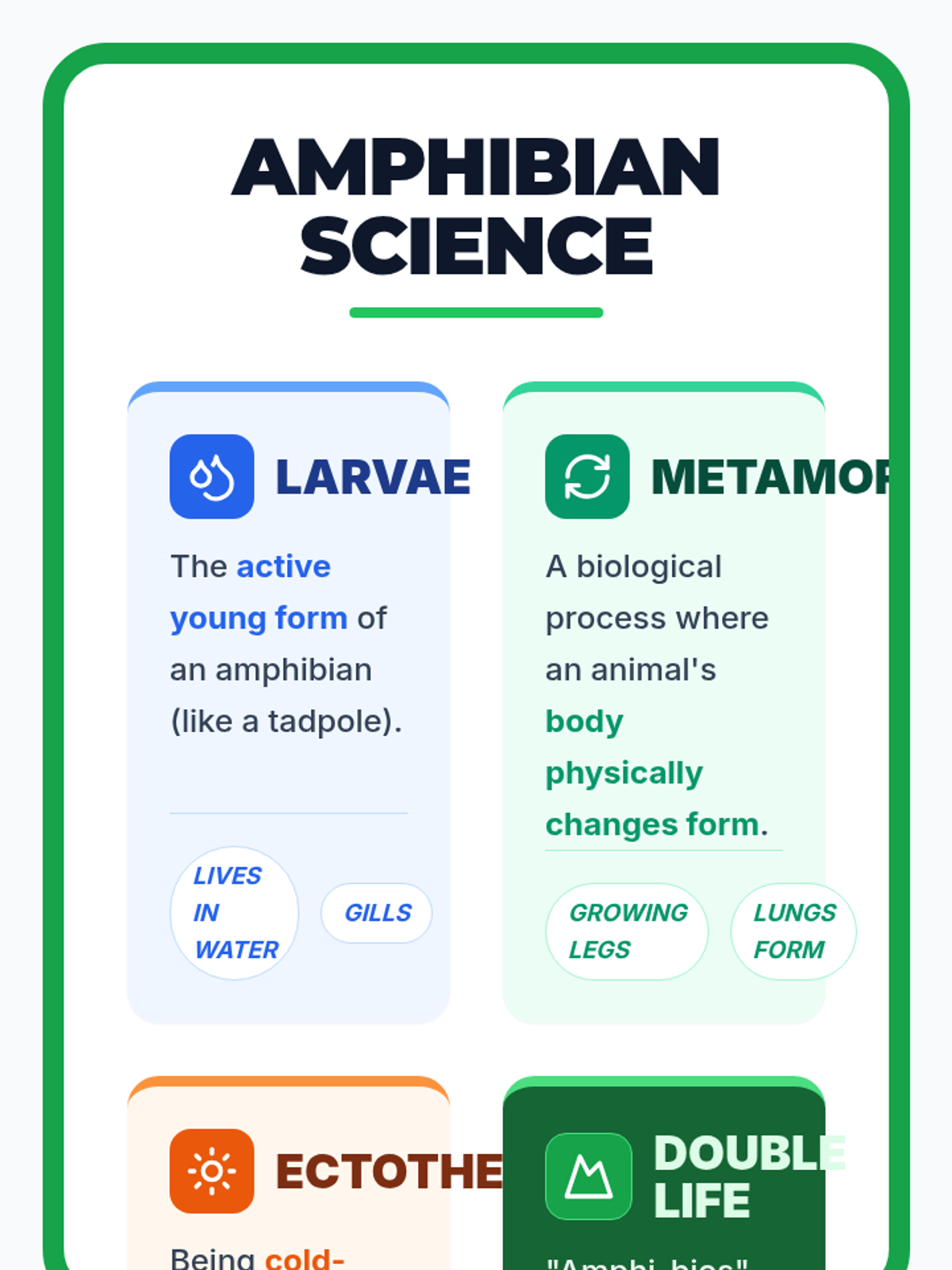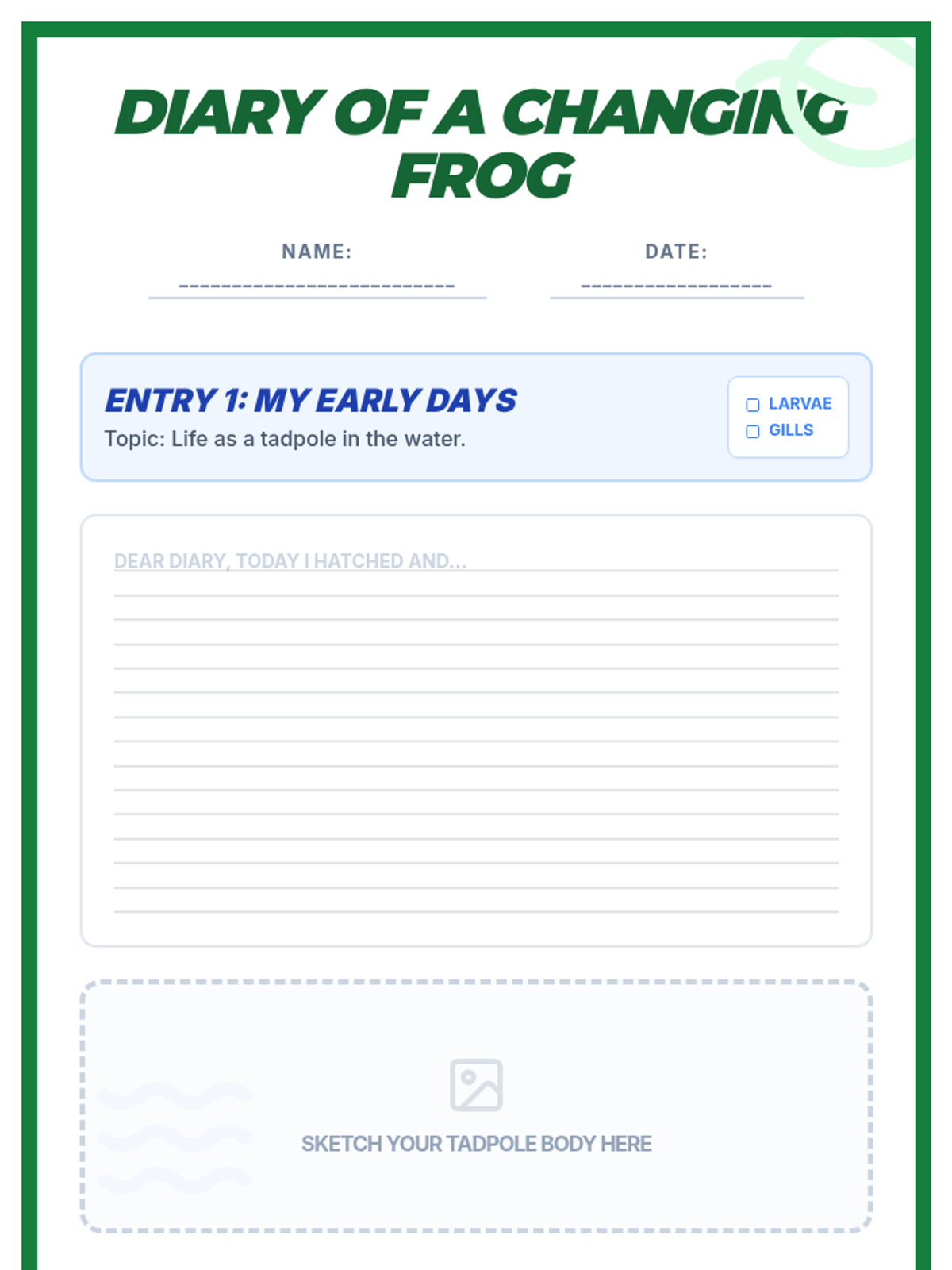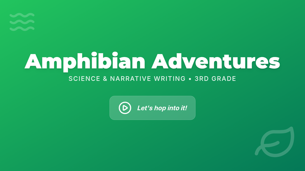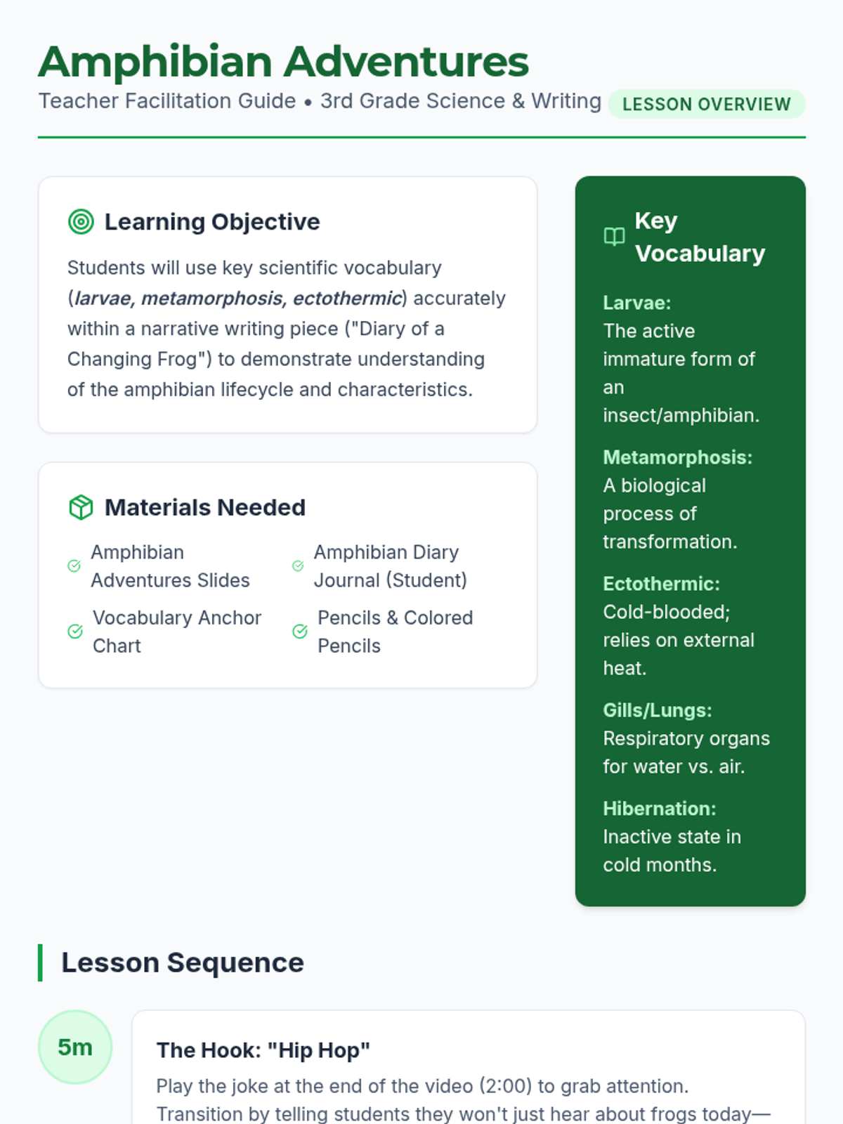 A 3rd-grade science and writing lesson where students learn about the lifecycle and biological traits of amphibians through a video, then apply scientific vocabulary (larvae, metamorphosis, ectothermic) to write a first-person narrative diary from the perspective of a changing frog.