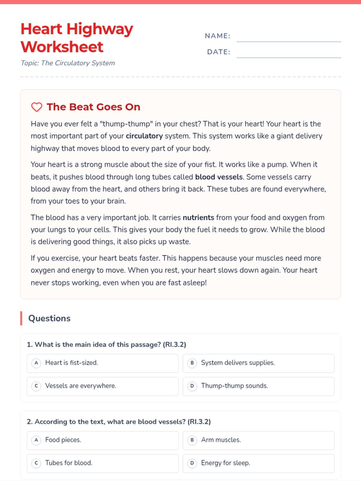 A series of reading comprehension materials exploring major human body systems, focusing on the respiratory and circulatory systems. Aligned to 3rd-grade NC ELA standards for main idea, cause and effect, and academic vocabulary.