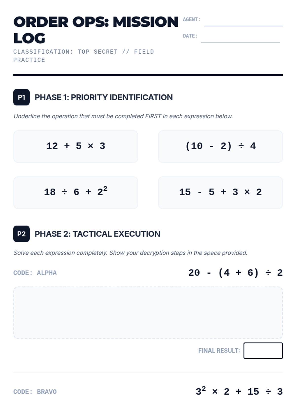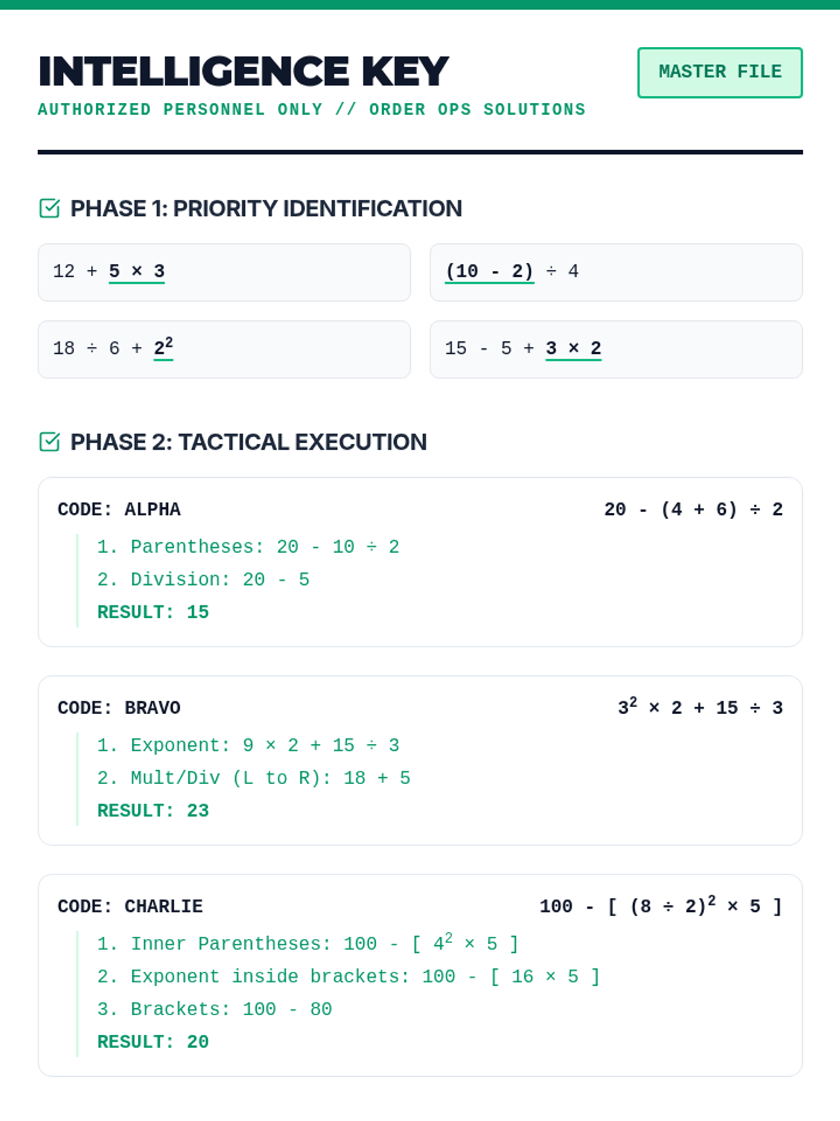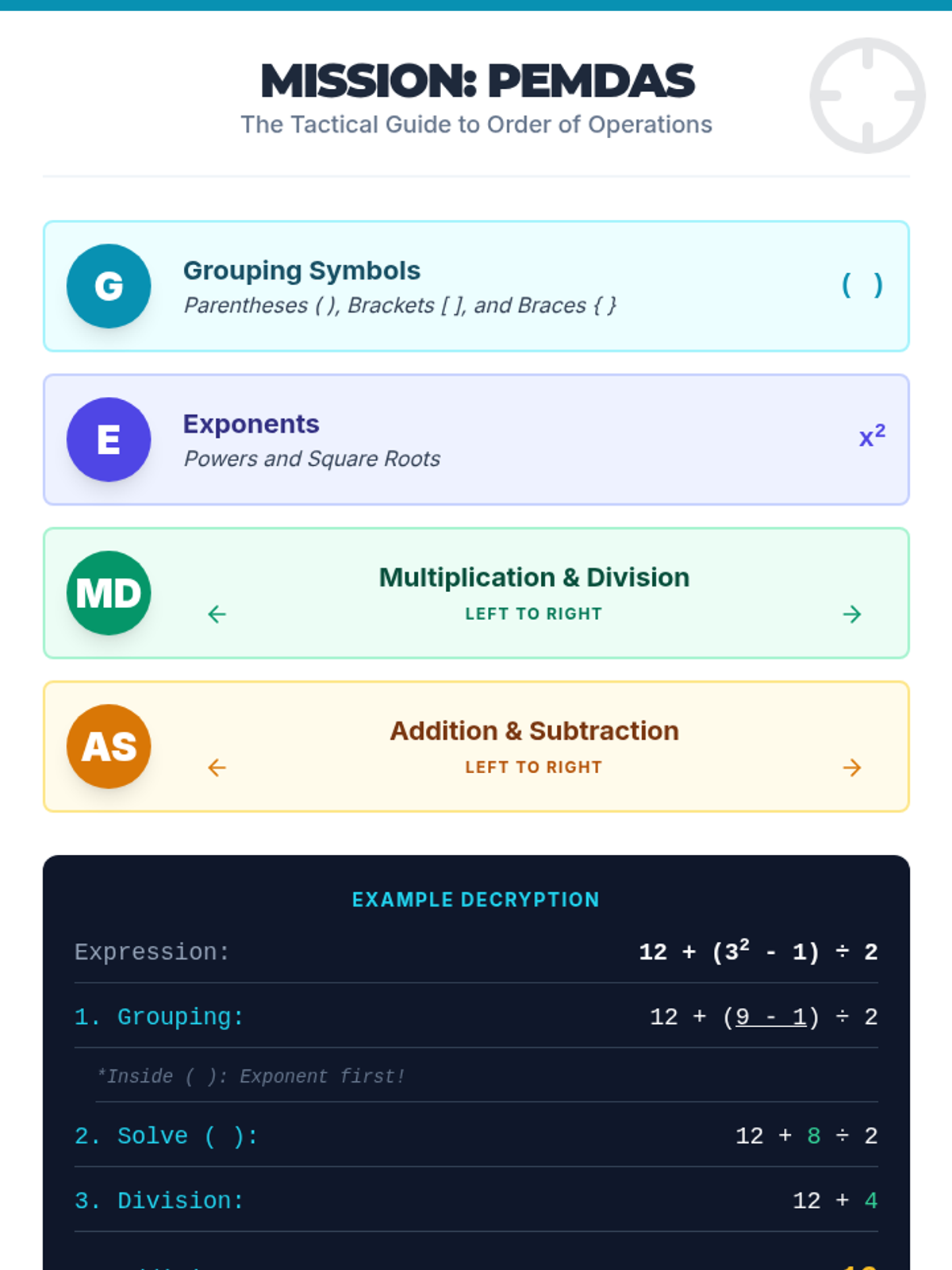 A comprehensive lesson on the Order of Operations (PEMDAS/GEMDAS), focusing on identifying the correct sequence of operations and solving multi-step mathematical expressions with precision.