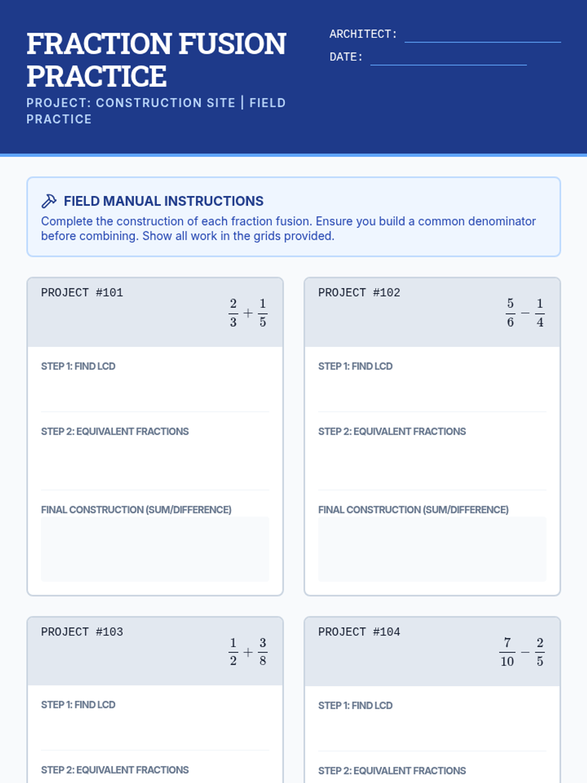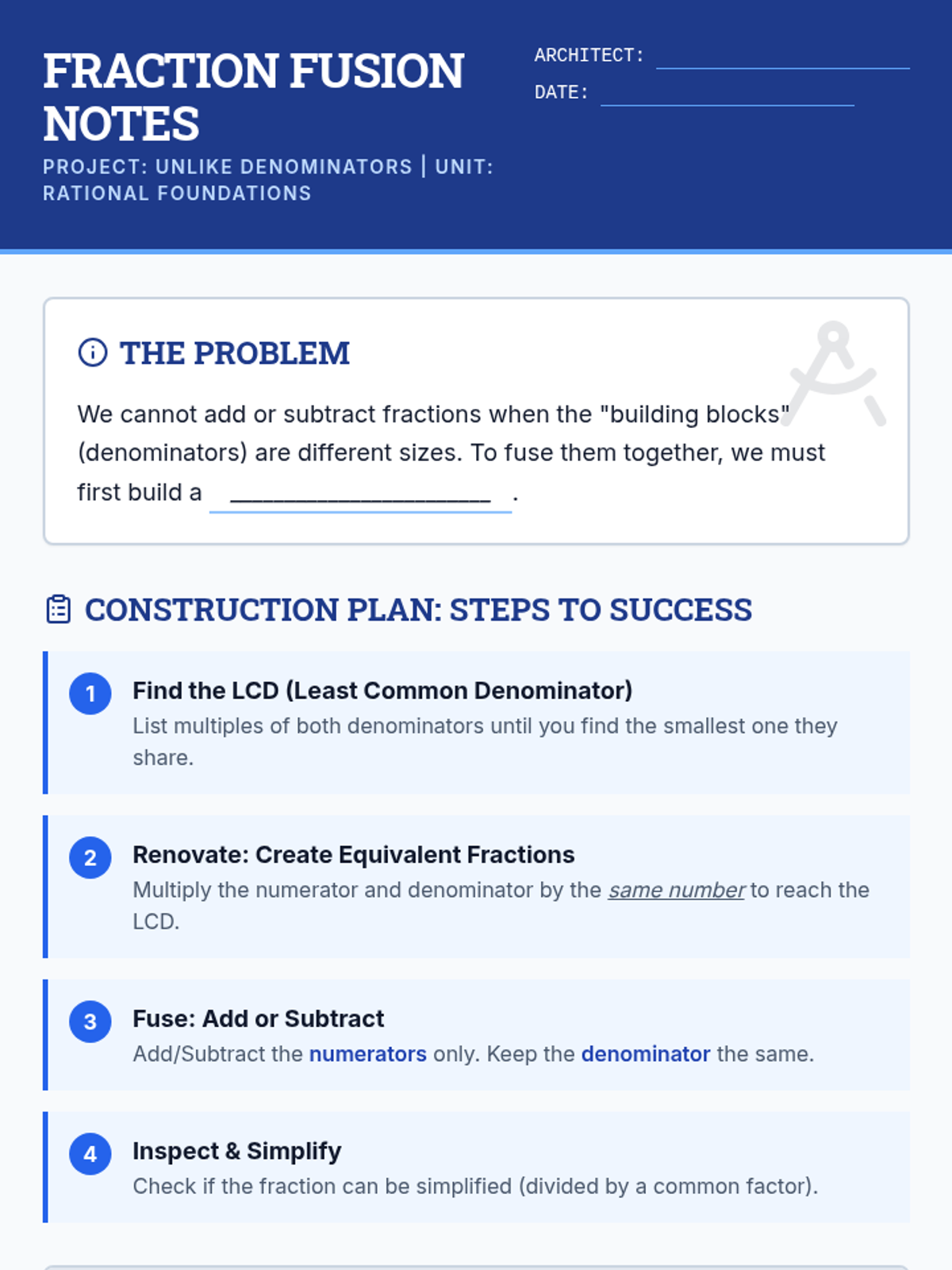 A comprehensive lesson on adding and subtracting fractions with unlike denominators, using a blueprint-themed architectural approach to 'building' common denominators.