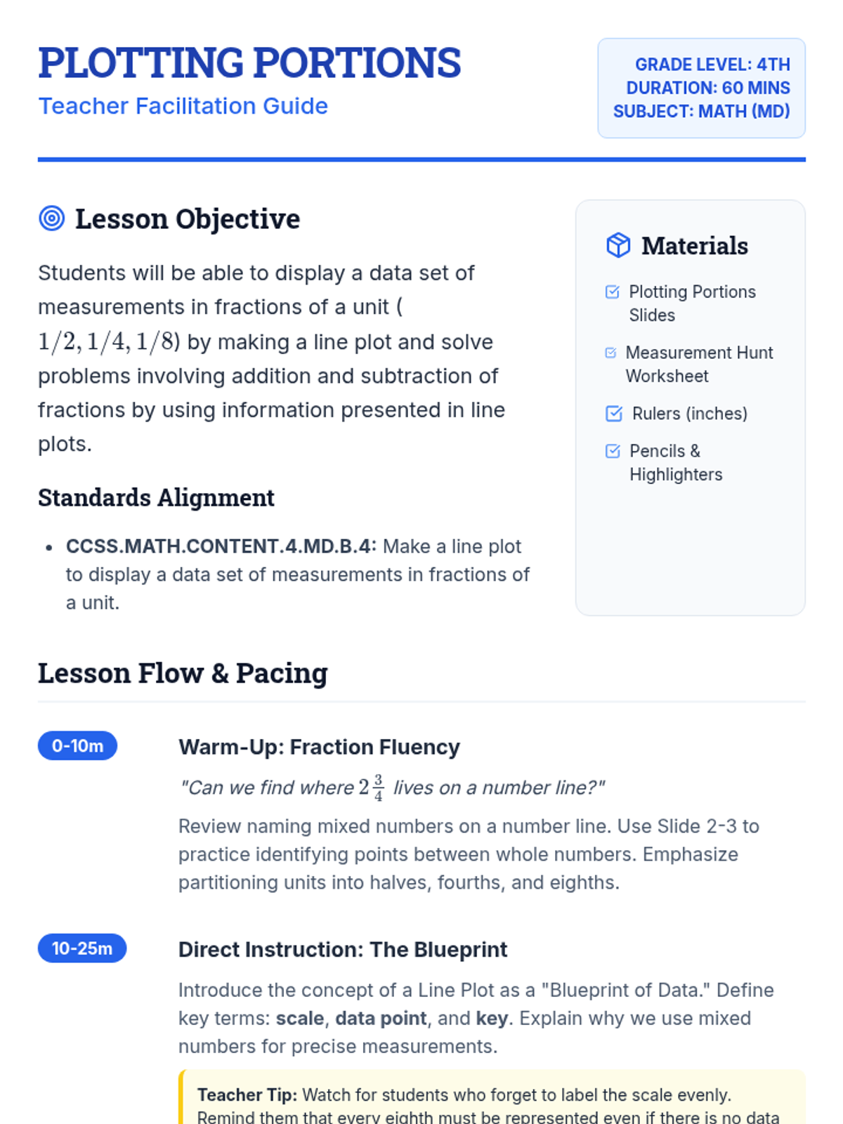 A 60-minute introductory lesson for 4th graders on creating and interpreting line plots using mixed numbers, specifically focusing on measurements to the nearest 1/8 inch.