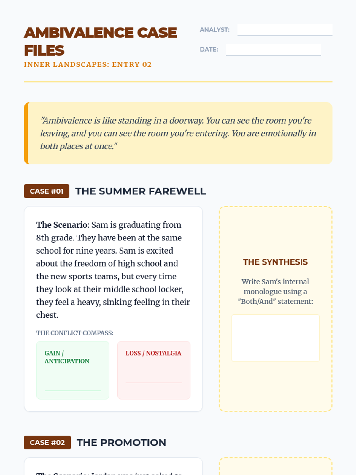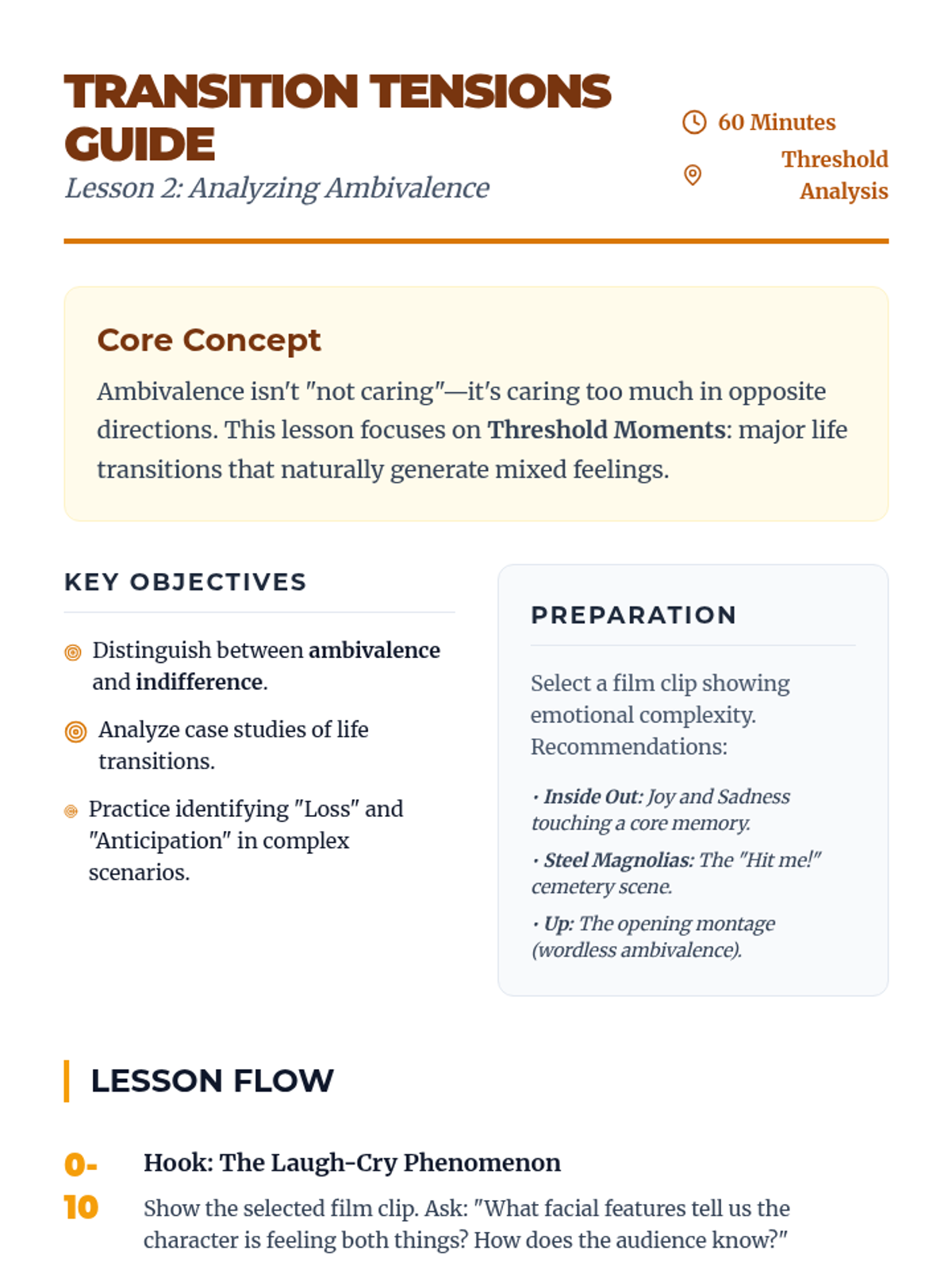 Exploration of ambivalence through the lens of major life transitions, focusing on the tension between loss and anticipation.