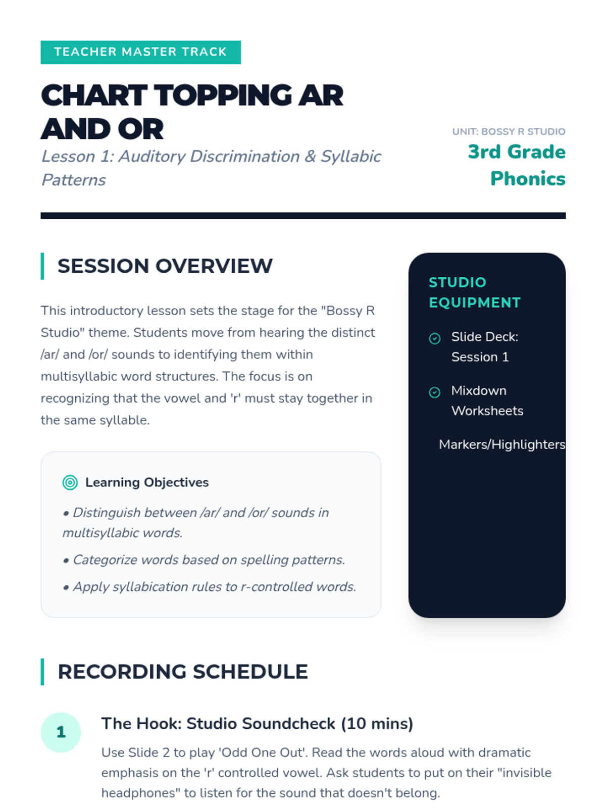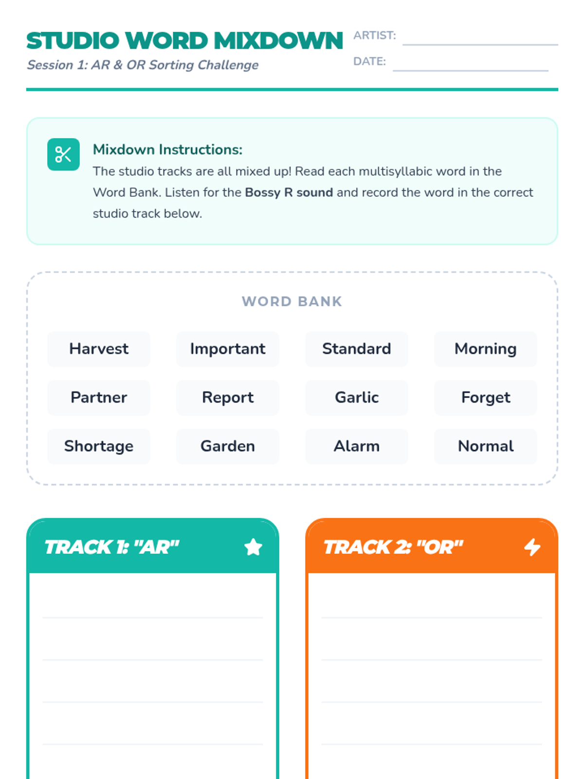 Students distinguish between 'ar' and 'or' sounds in two-syllable words using a studio-themed word sort and decoding challenge.
