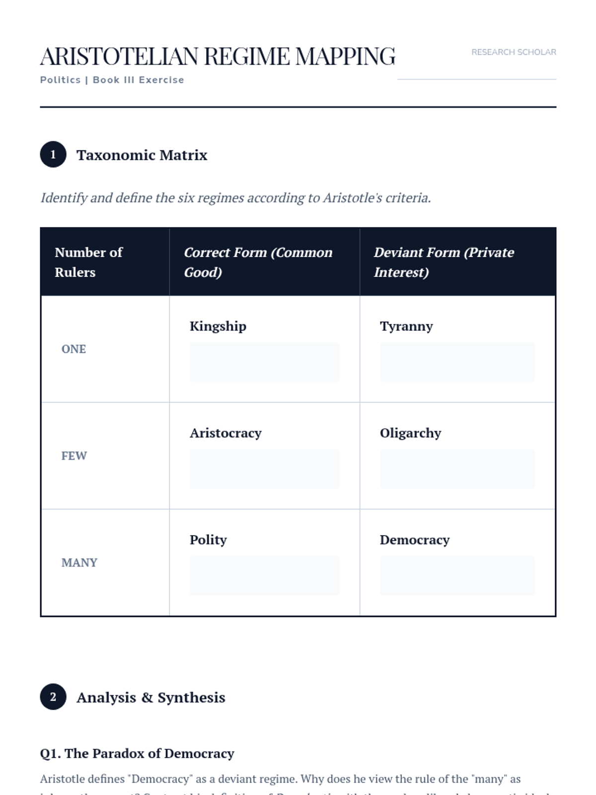 Students examine Aristotle's Politics to categorize regimes based on the number of rulers and their adherence to the common good.