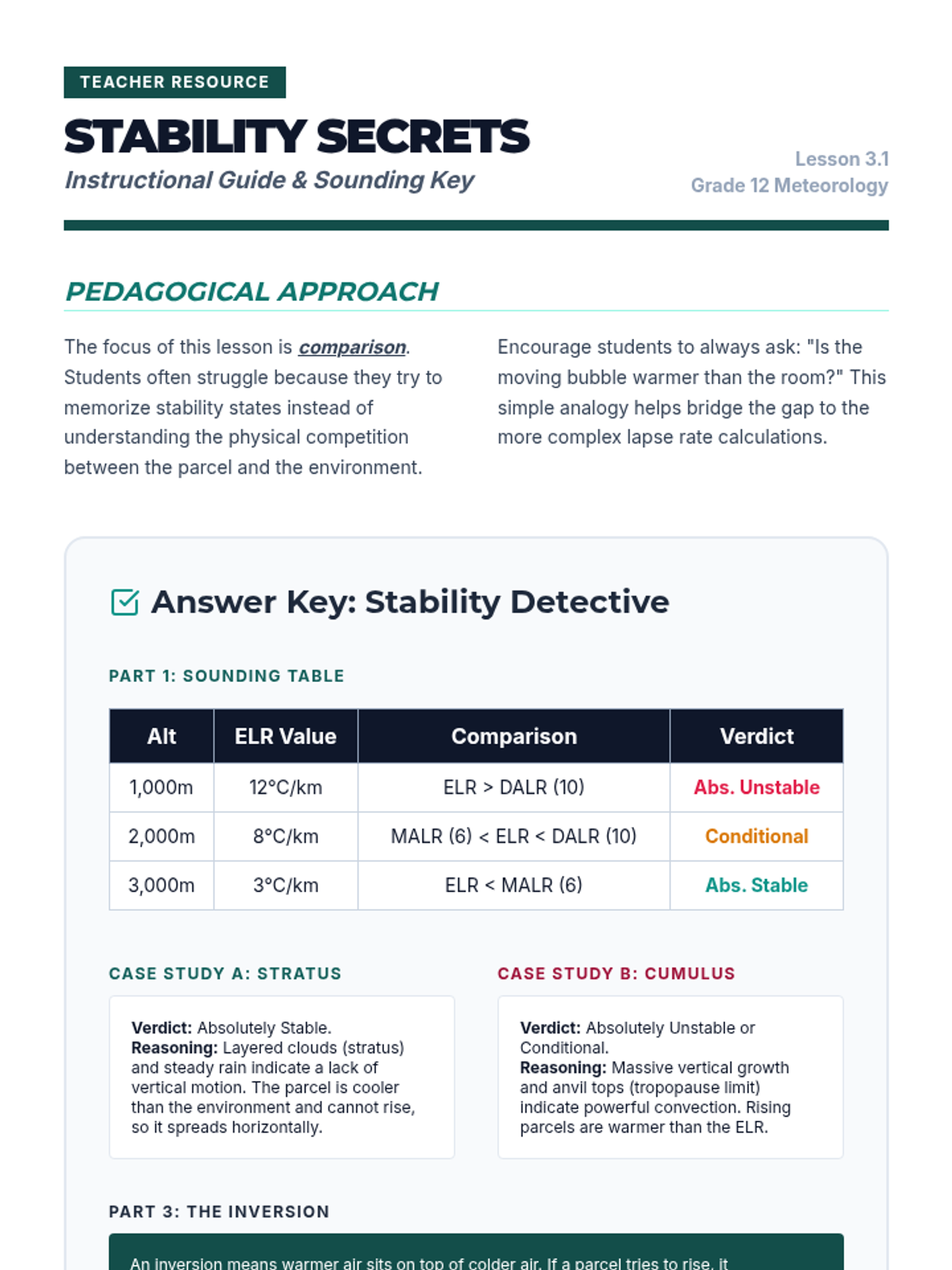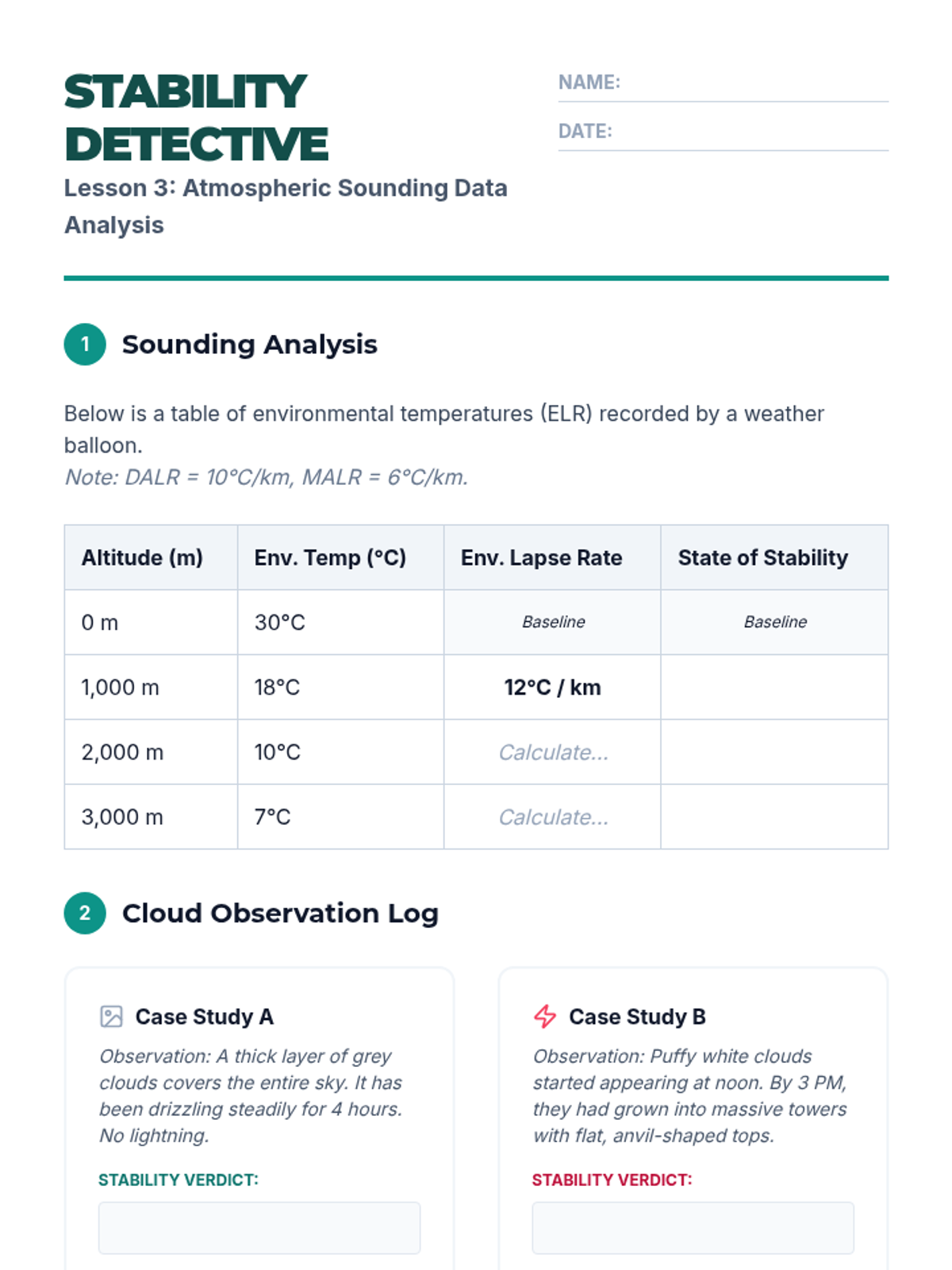 Students investigate atmospheric stability by comparing environmental lapse rates to adiabatic rates, learning to identify stable, unstable, and conditionally unstable conditions.