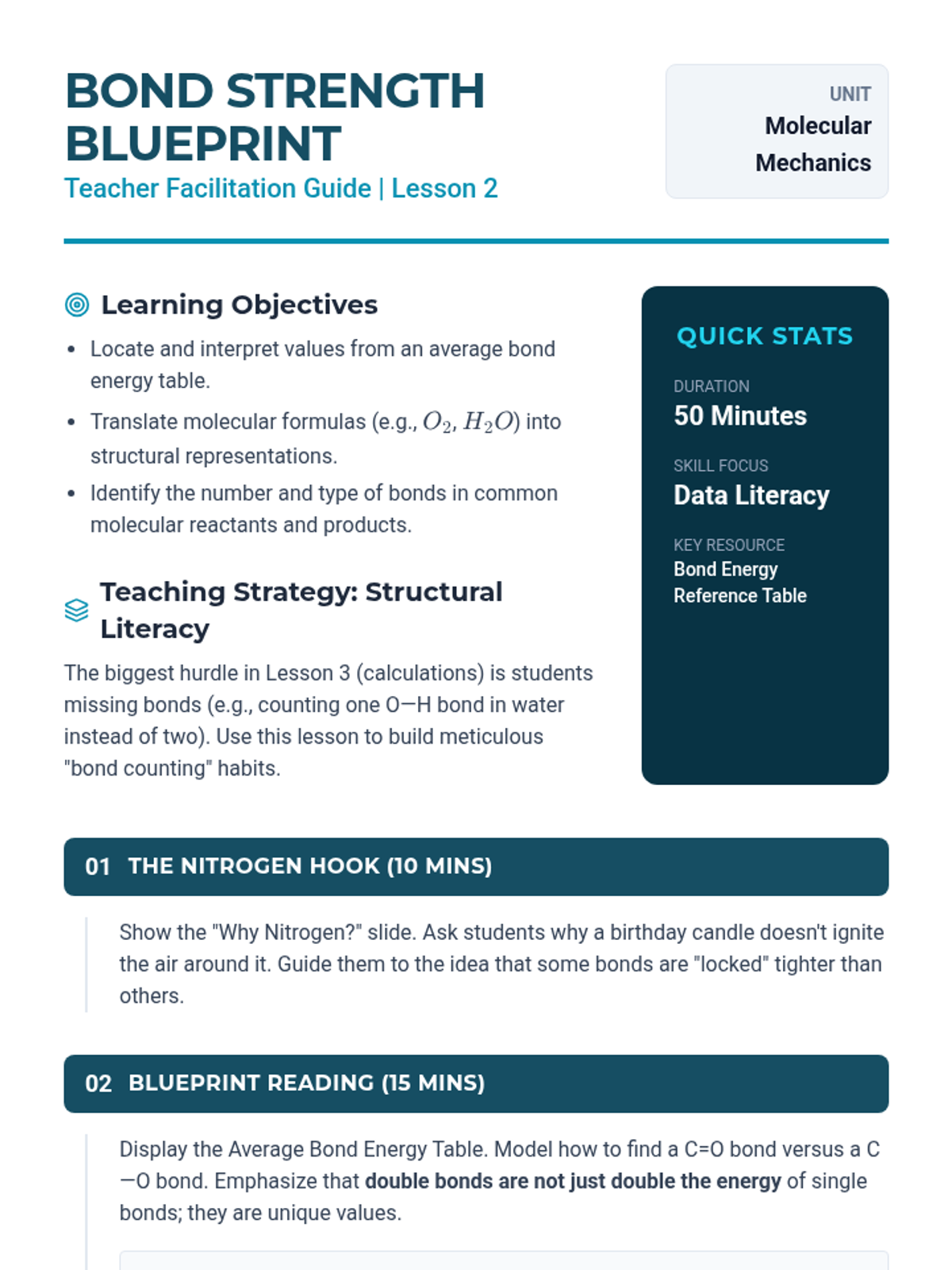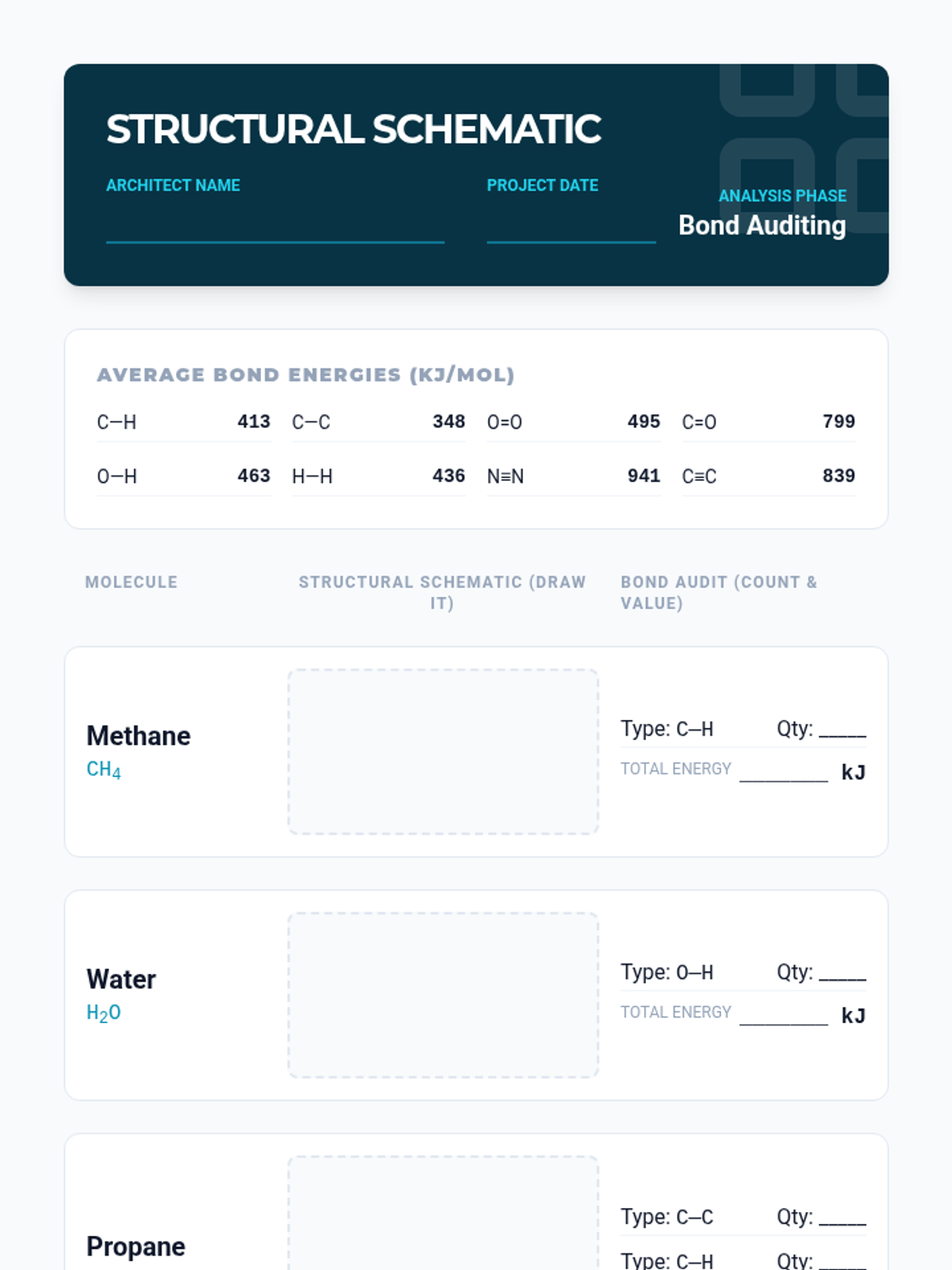 Students interpret bond energy tables and learn to identify specific bonds within molecular structures.