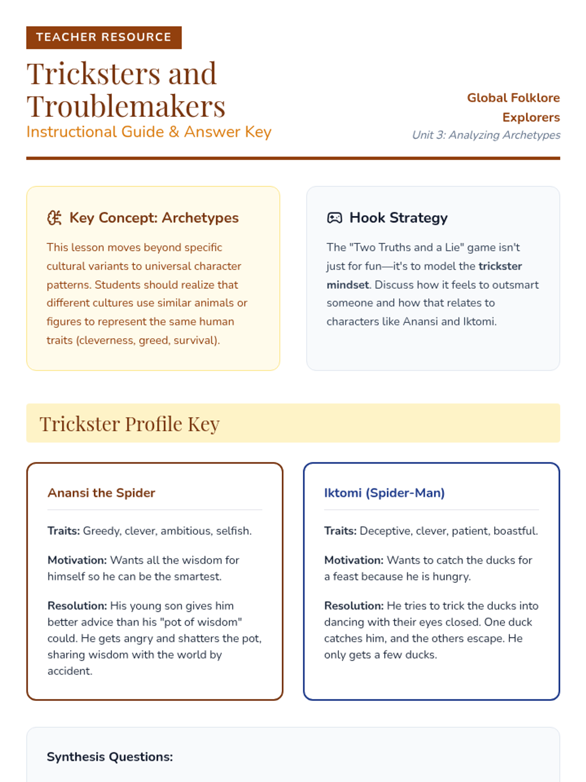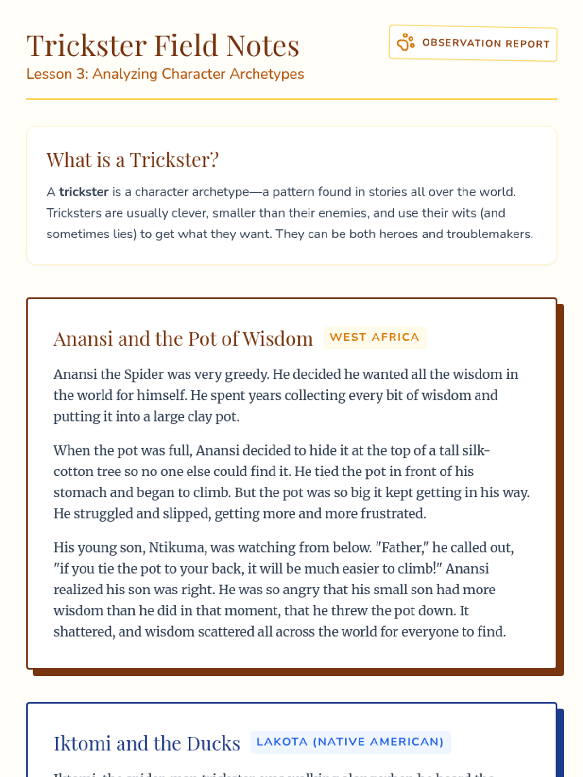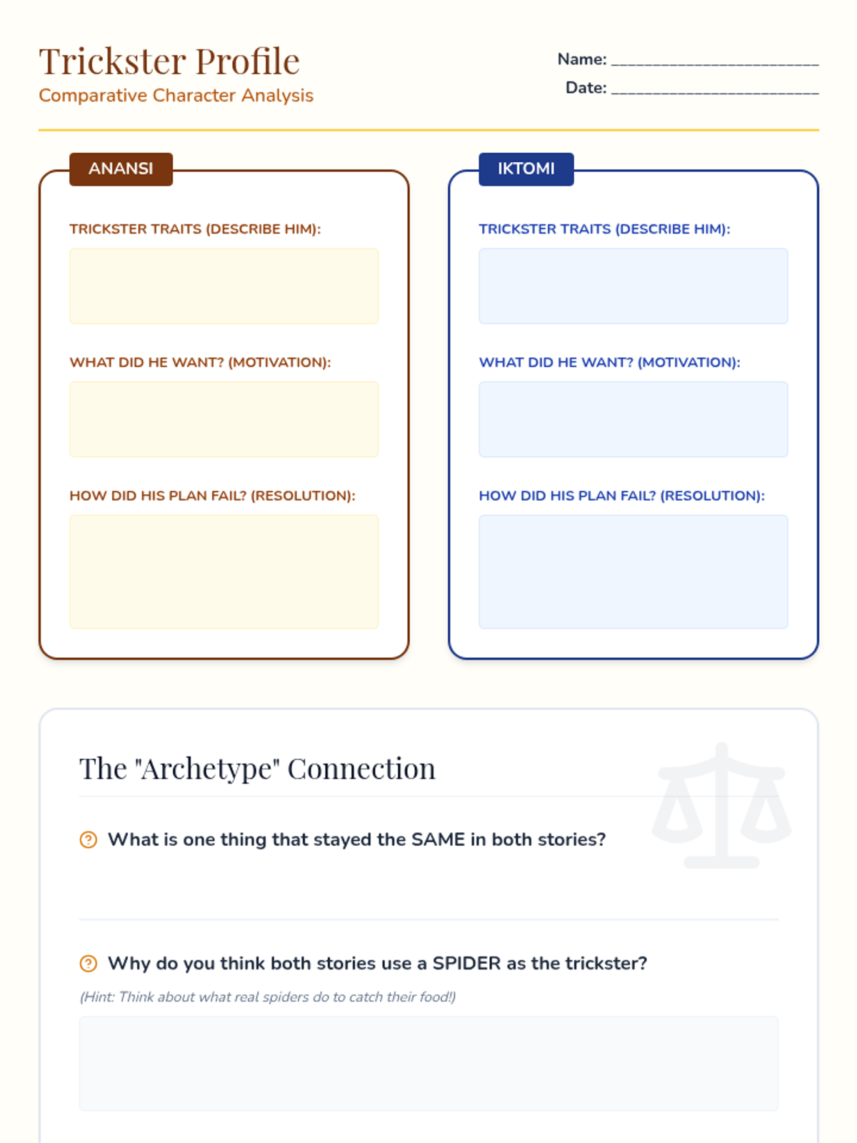 Analyzing 'Trickster' character archetypes across Native American and West African folklore to understand their universal functions.