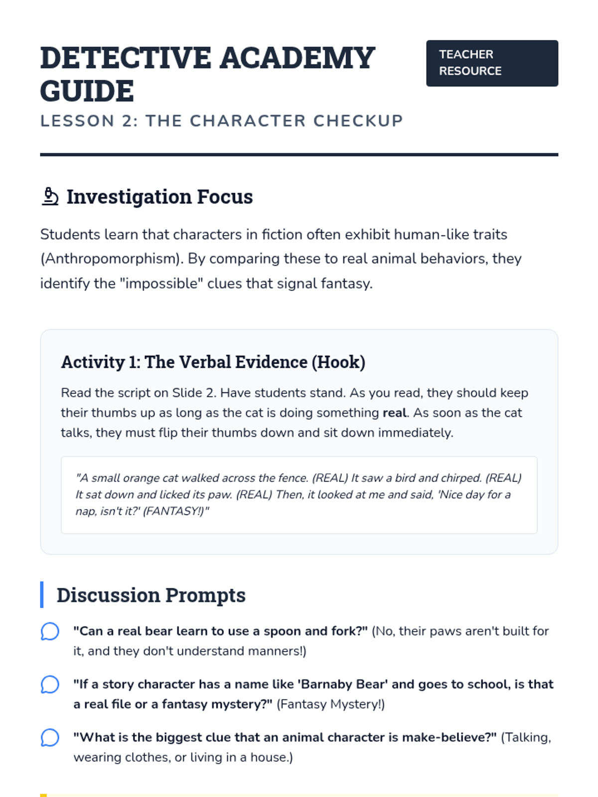 Learners compare real animal behaviors with fictional character traits. They identify impossible abilities like wearing clothes or speaking human languages.