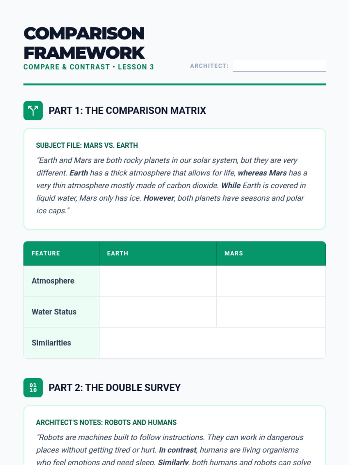Students analyze texts that compare two subjects, focusing on both block and point-by-point organization methods using Venn diagrams and matrix charts.