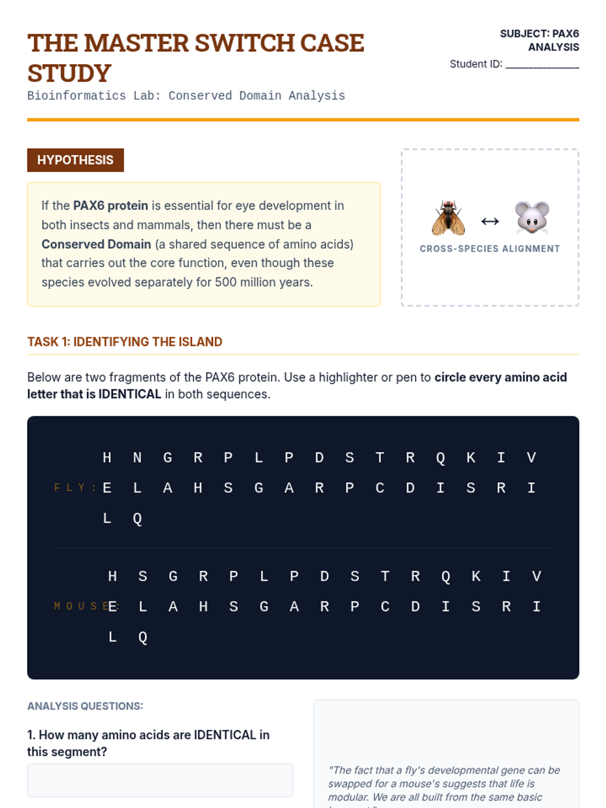 Students investigate conserved domains in proteins, focusing on the PAX6 gene case study to understand why certain genetic sequences remain unchanged across species.