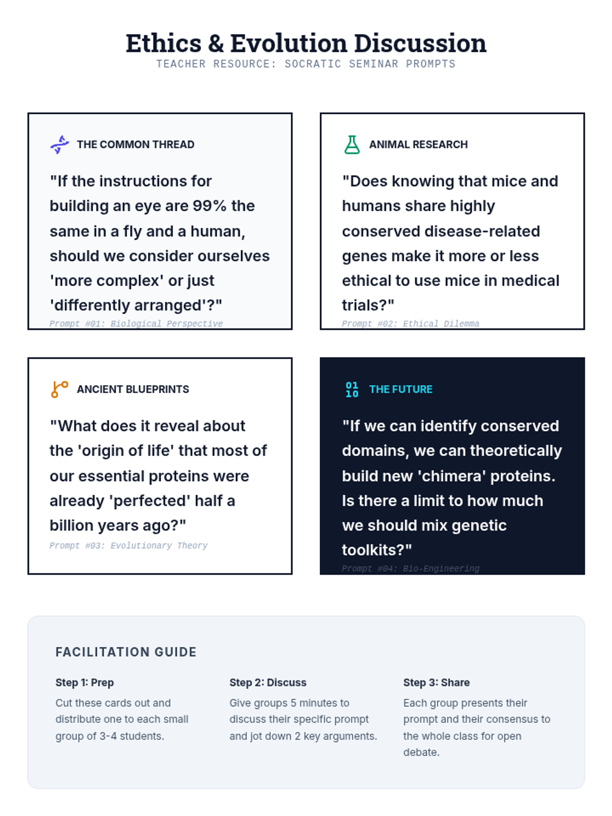 A 90-minute investigation into how genetic mutations and chromosomal abnormalities lead to human disorders. Students act as 'genetic consultants' to analyze karyotypes, pedigrees, and mutation types.