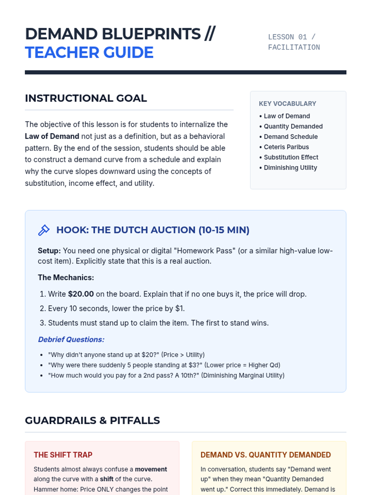 Students investigate the inverse relationship between price and quantity demanded, focusing on the Law of Demand and graphical representation.
